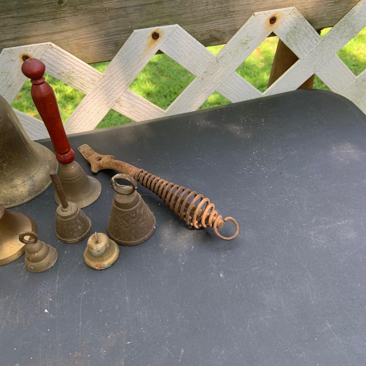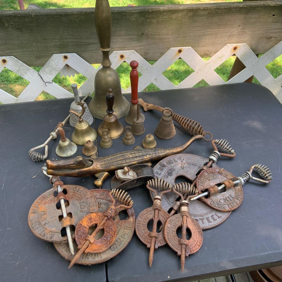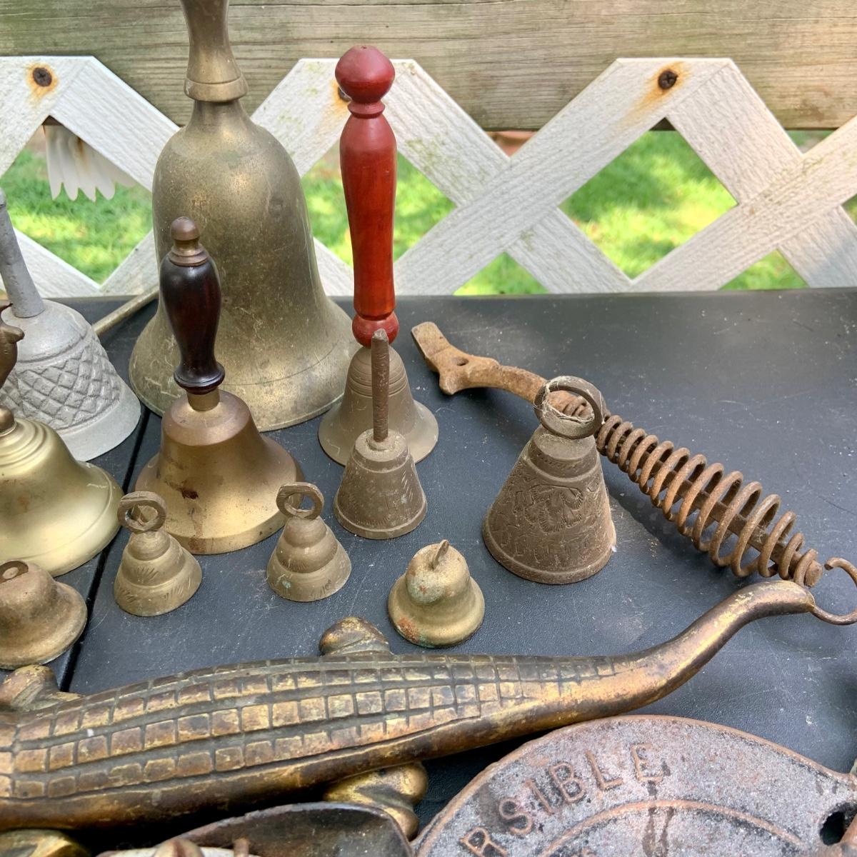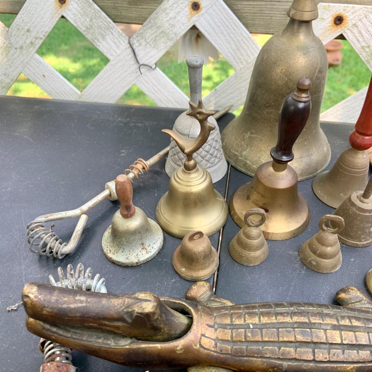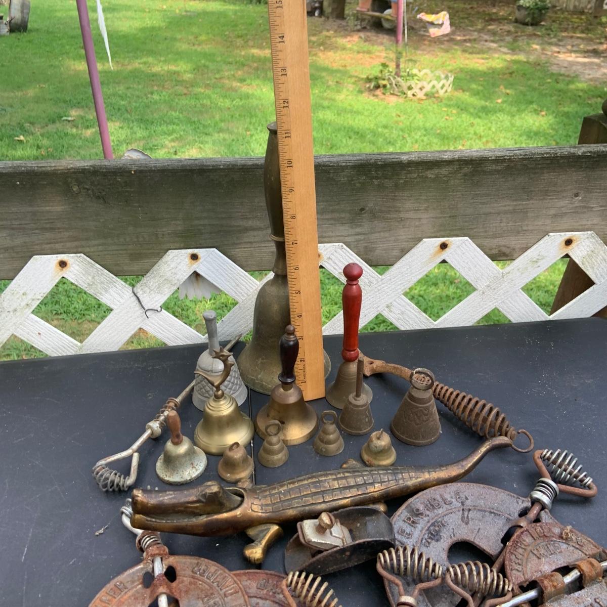 LOT:86: Brass and Other Bells, Stove Dampers, and Alligator Nutcracker More