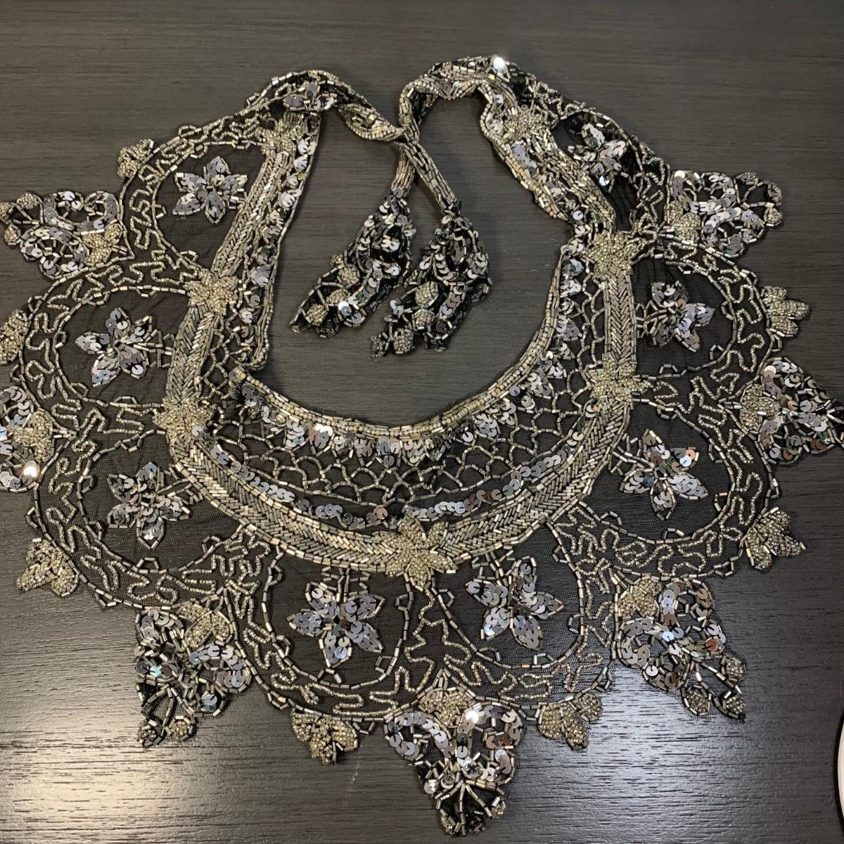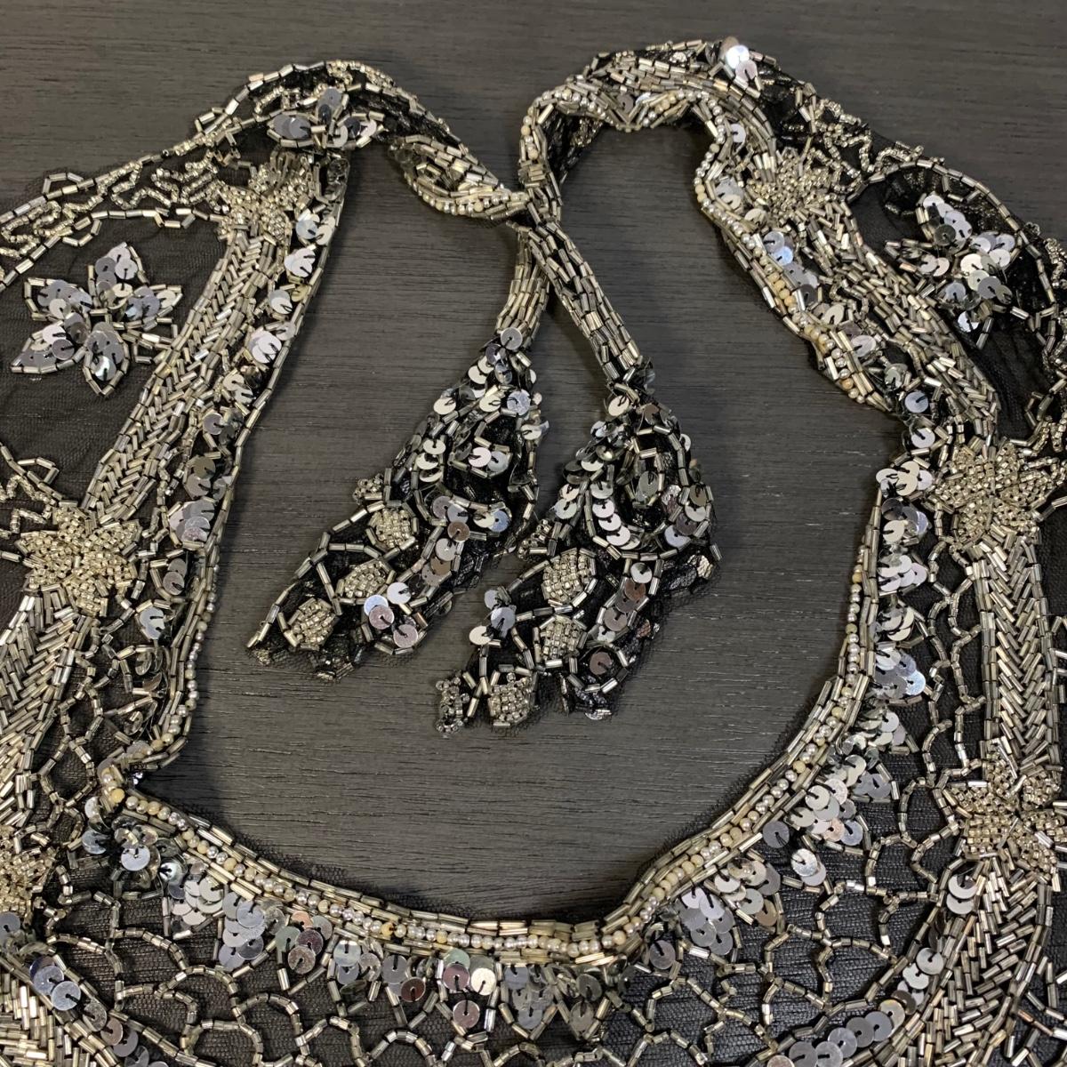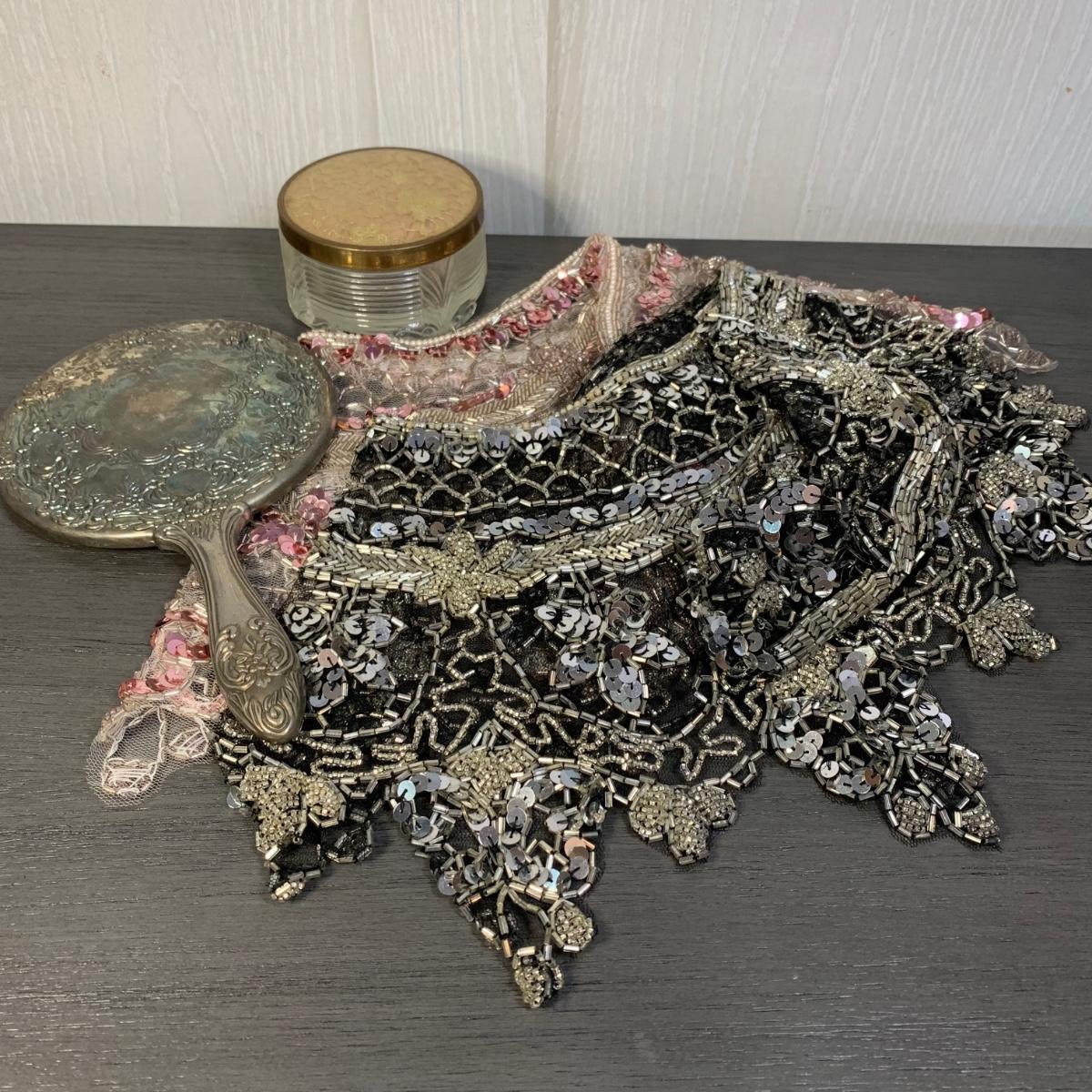 Beaded Shaws/Wrap with very ornate detailing. Vintage hand mirror and glass powder case.