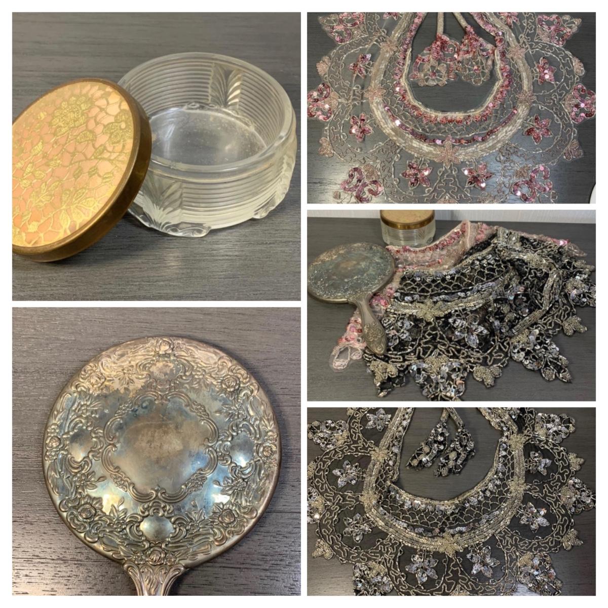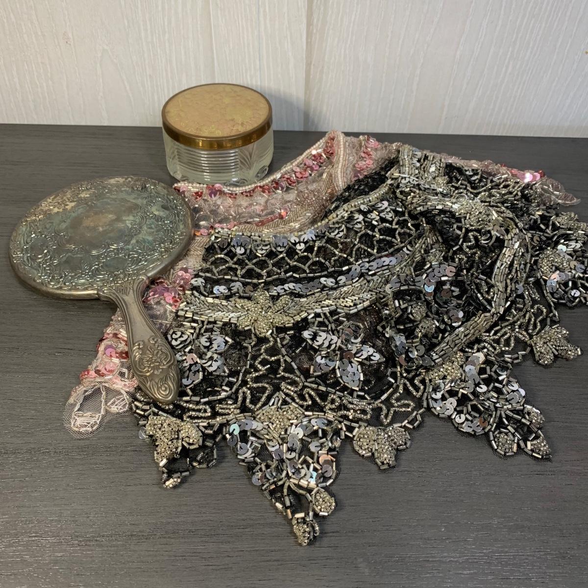 LOT 103: Beaded  Shrug Shaws, Vintage Hand Mirror And Glass Powder Box