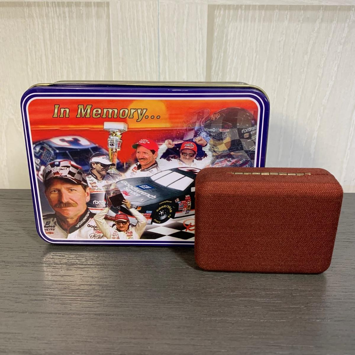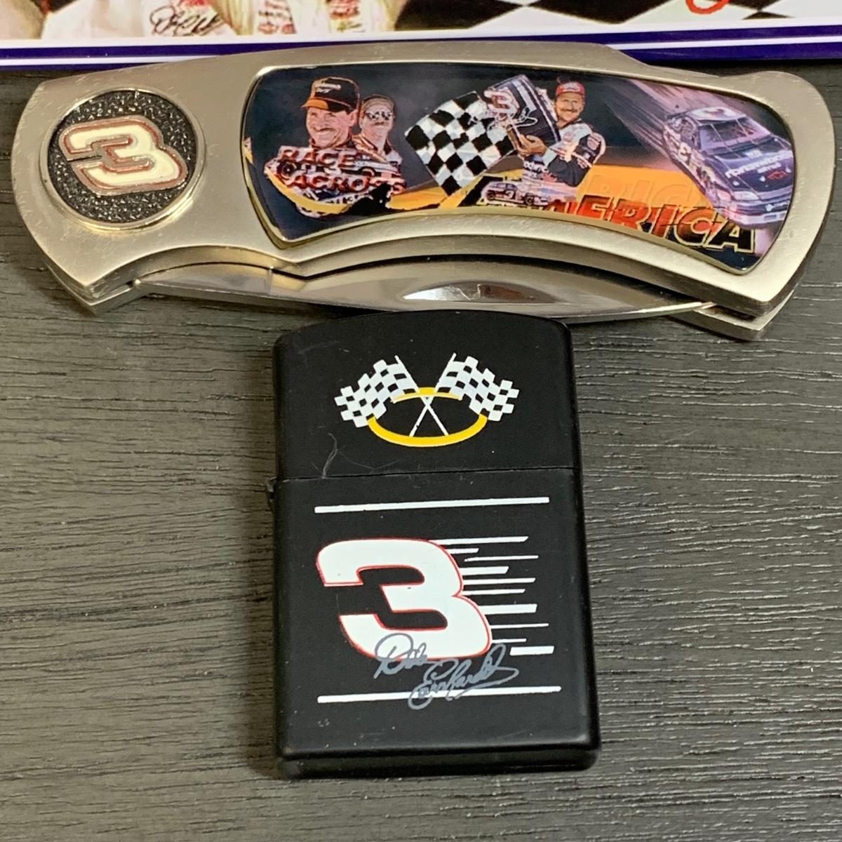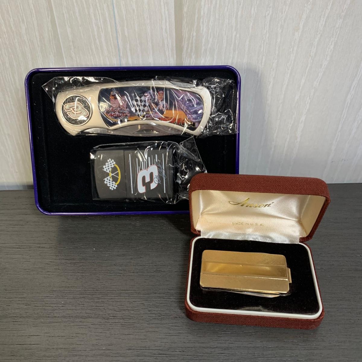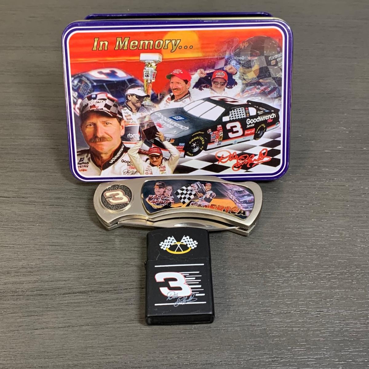 Lot 108: In Memory of Dale Earnhardt Pocketknife & Lighter Tin Box #3 along with Gold Tone Money Clip Pen Knife