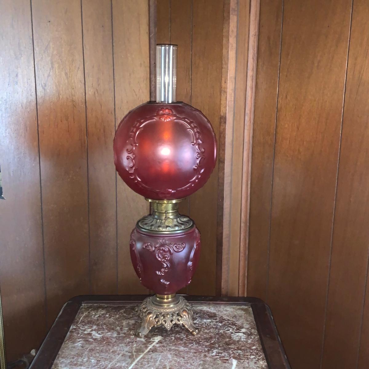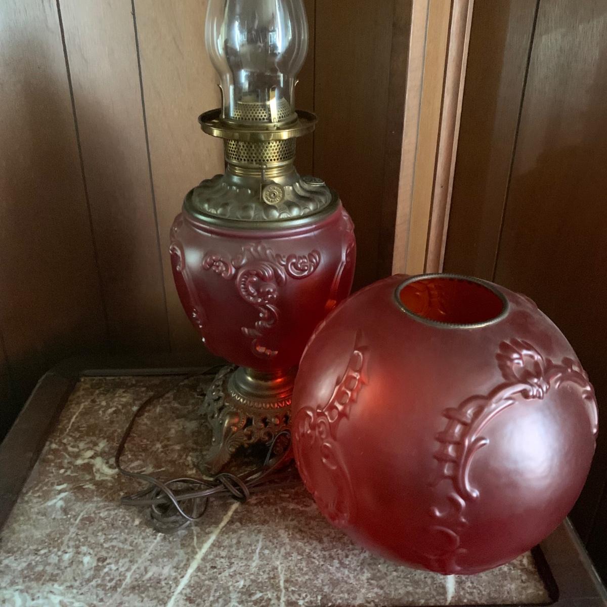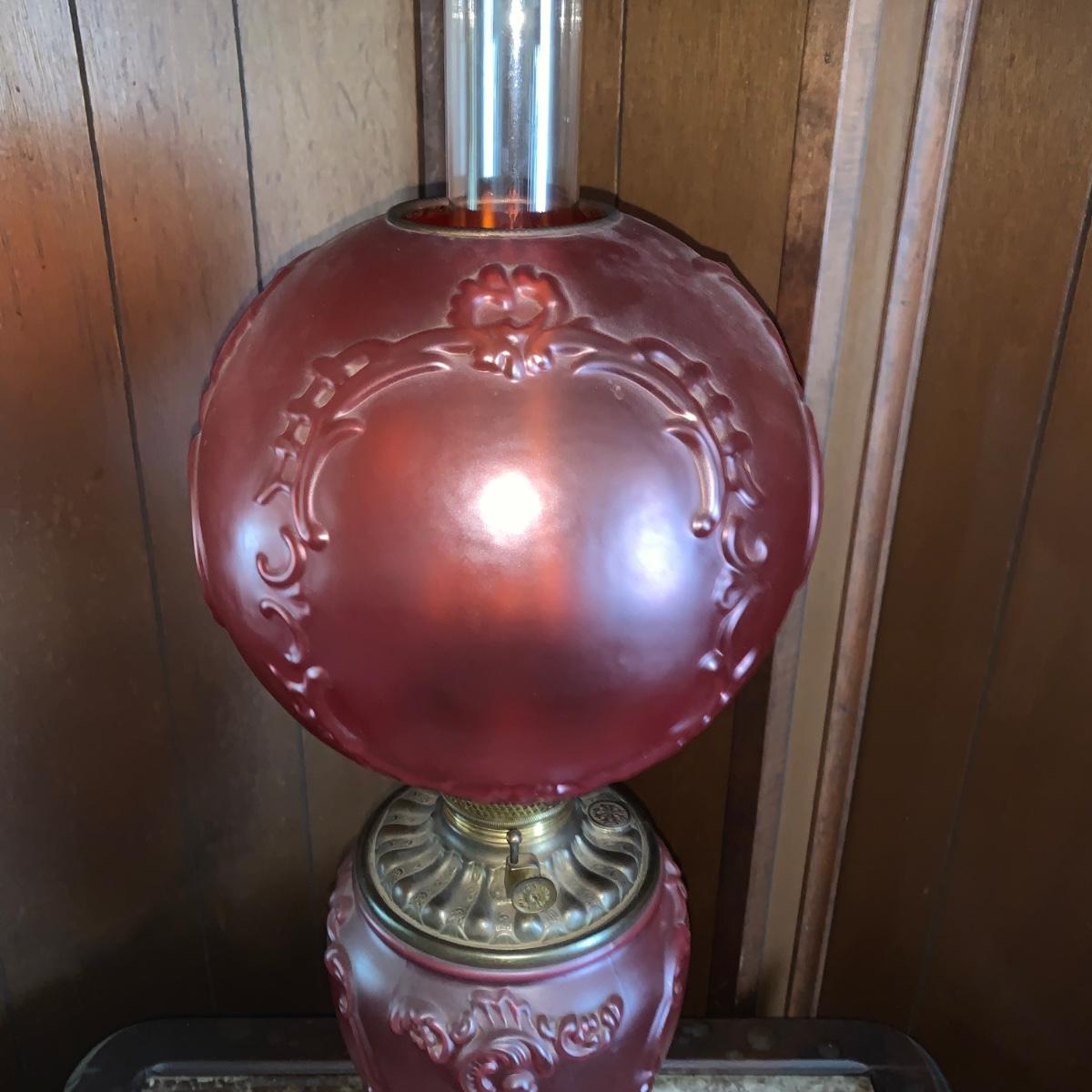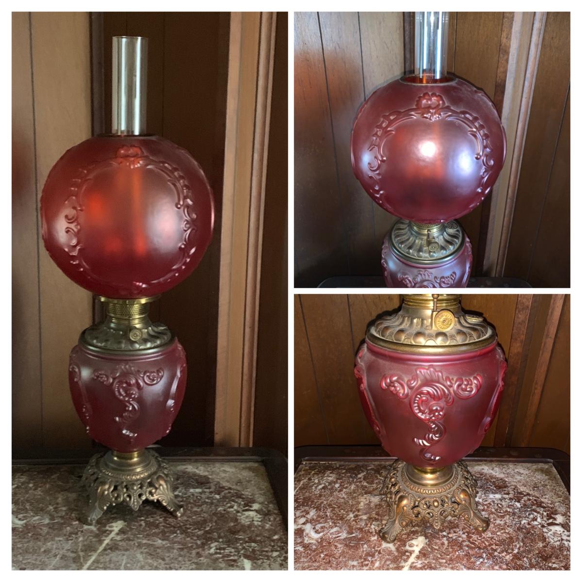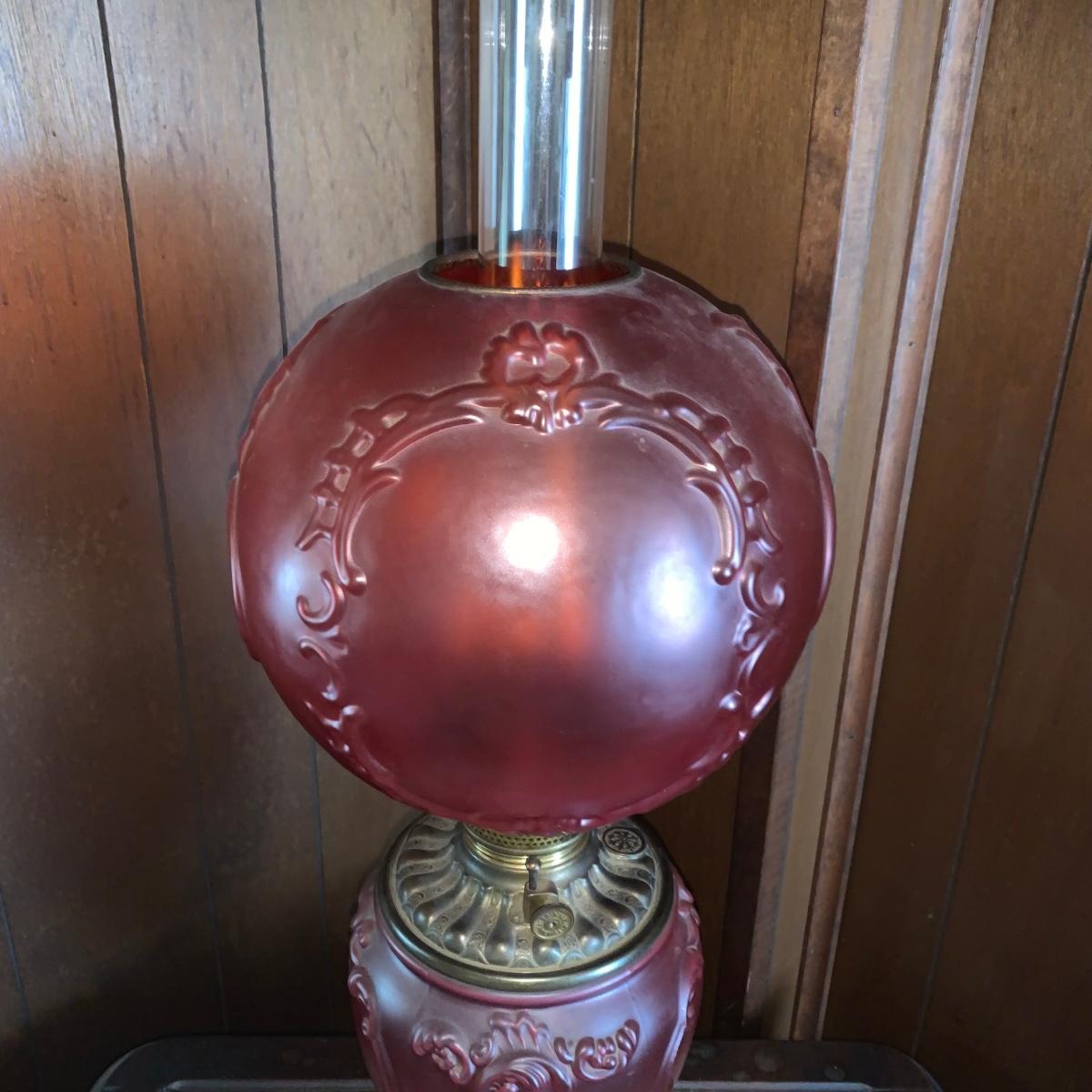 LOT 129R: Antique Victorian Red Glass Parlor Lamp - Electrified