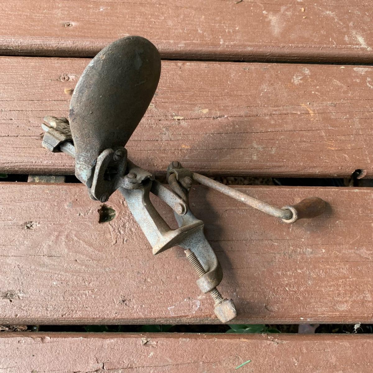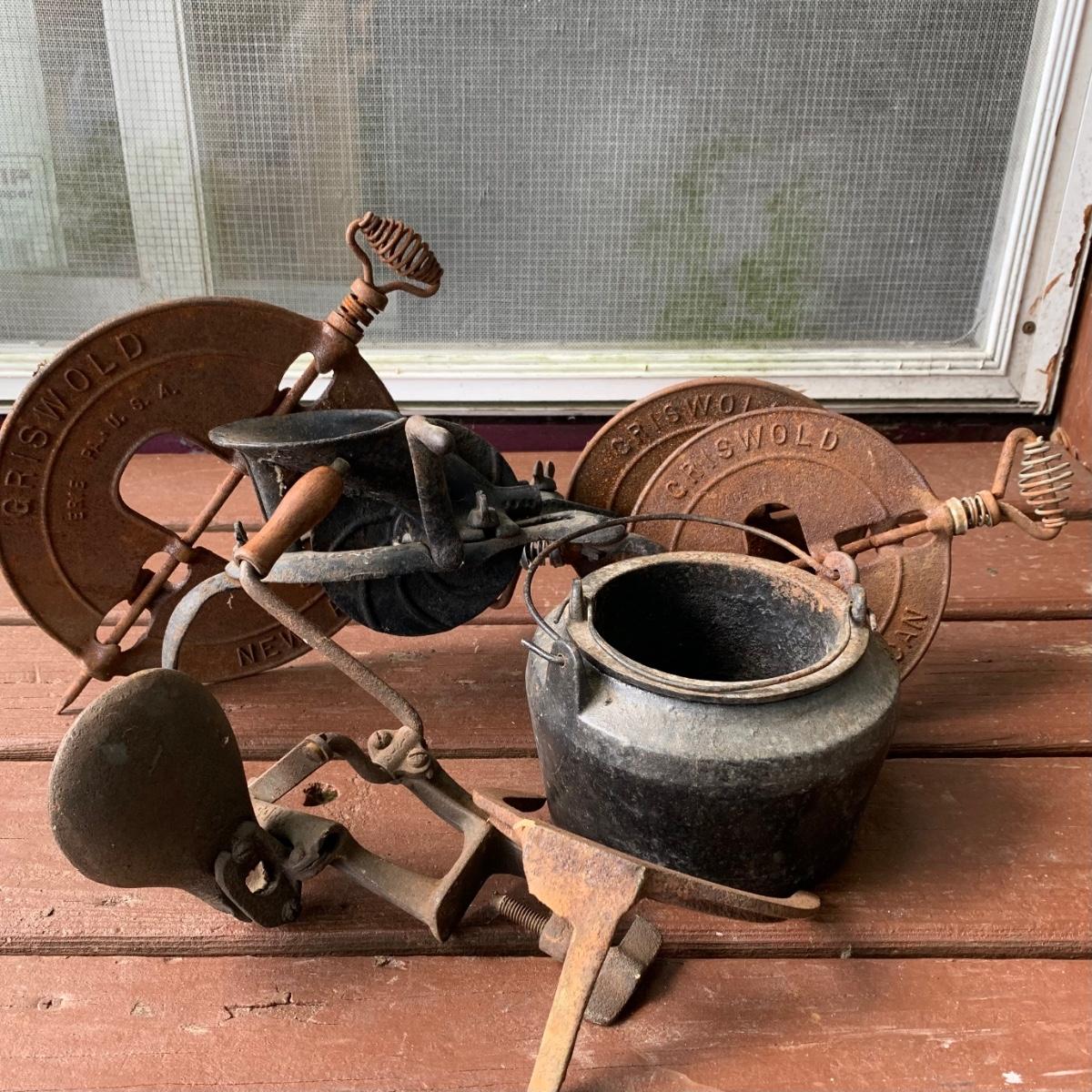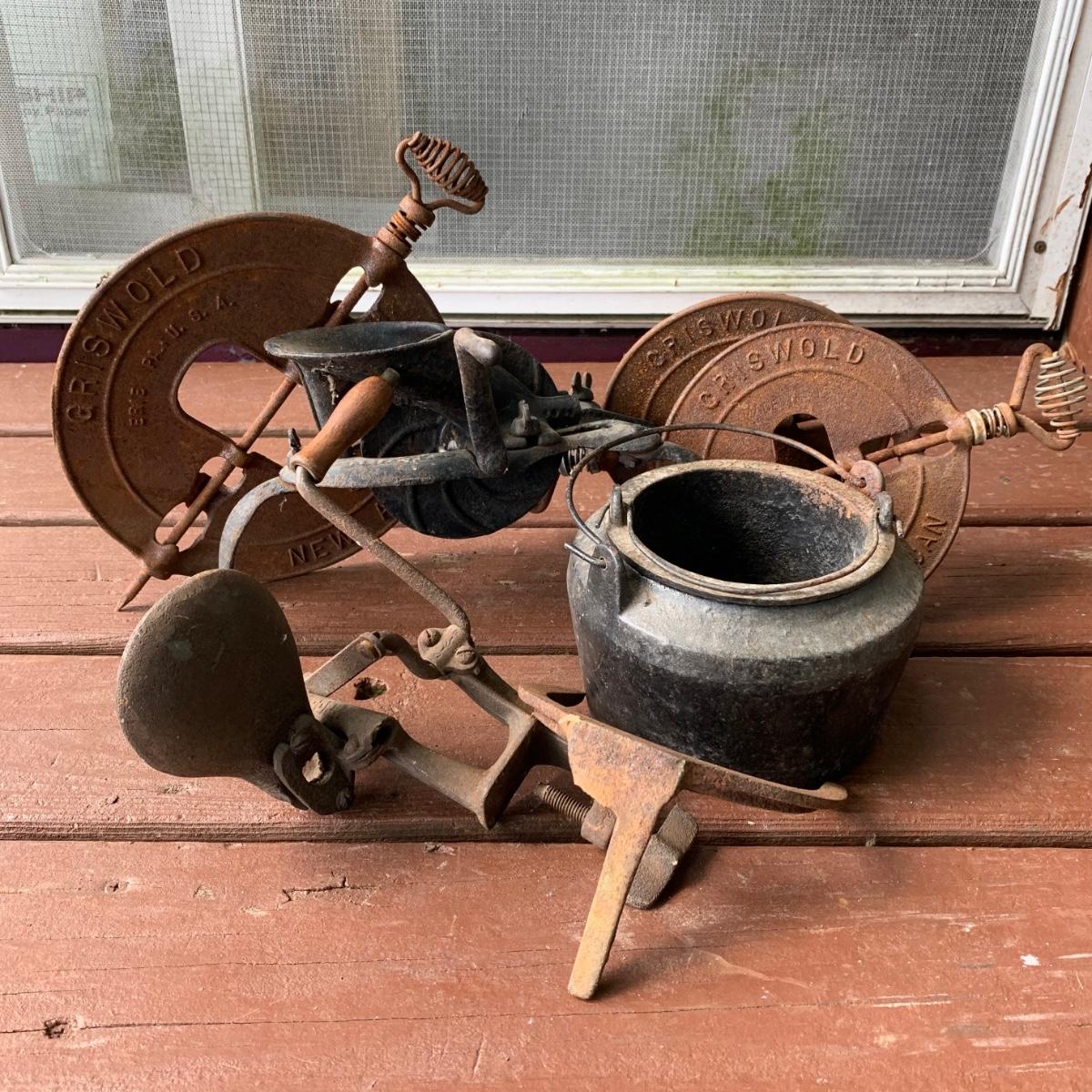 LOT 145R: Grizwold Stove Dampers, a Glue Pot, Scott Cherry Pitter and New Standard Mt. Joy Cherry Stoner