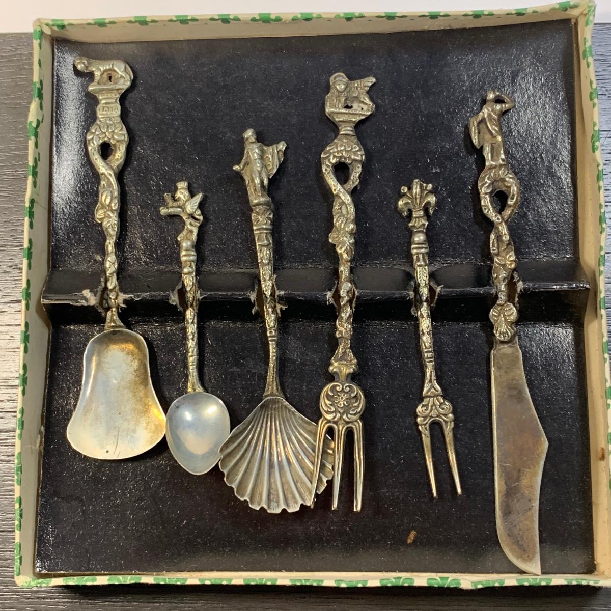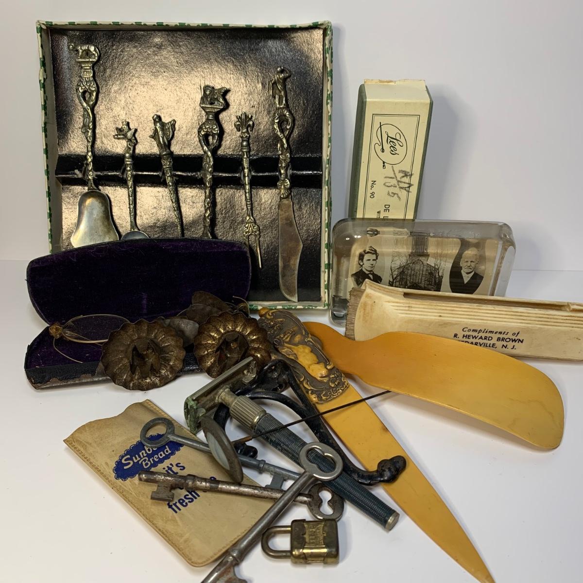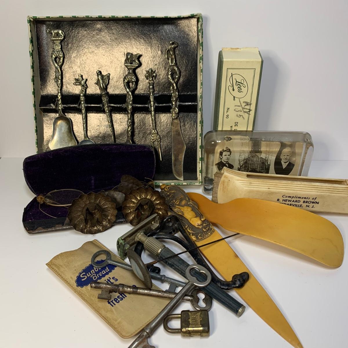 Antique 6 Piece ornate silverplate relish serving set in original box. Glass Paperweight, shoe horns, lock and keys and much more.
