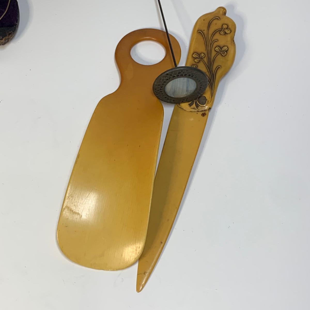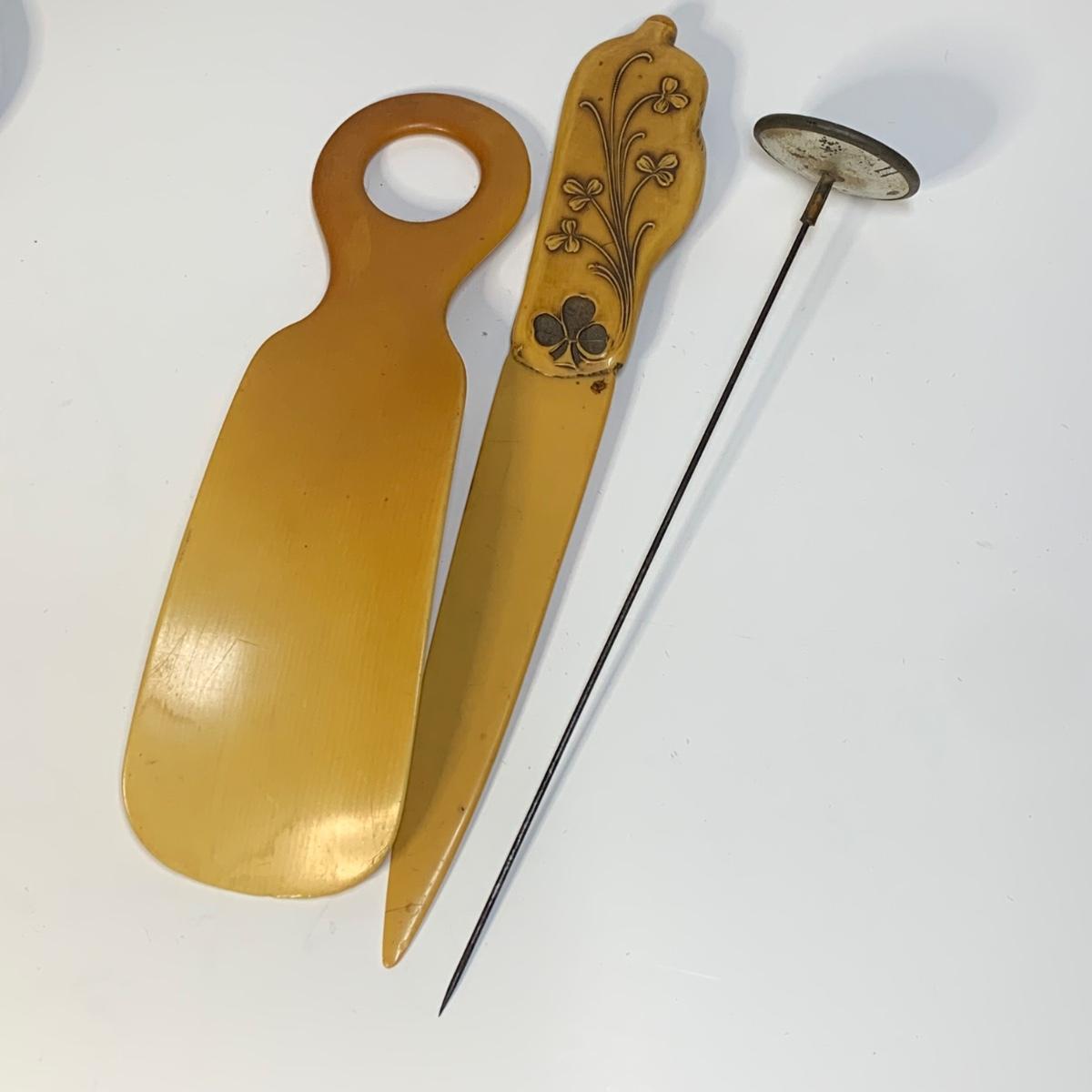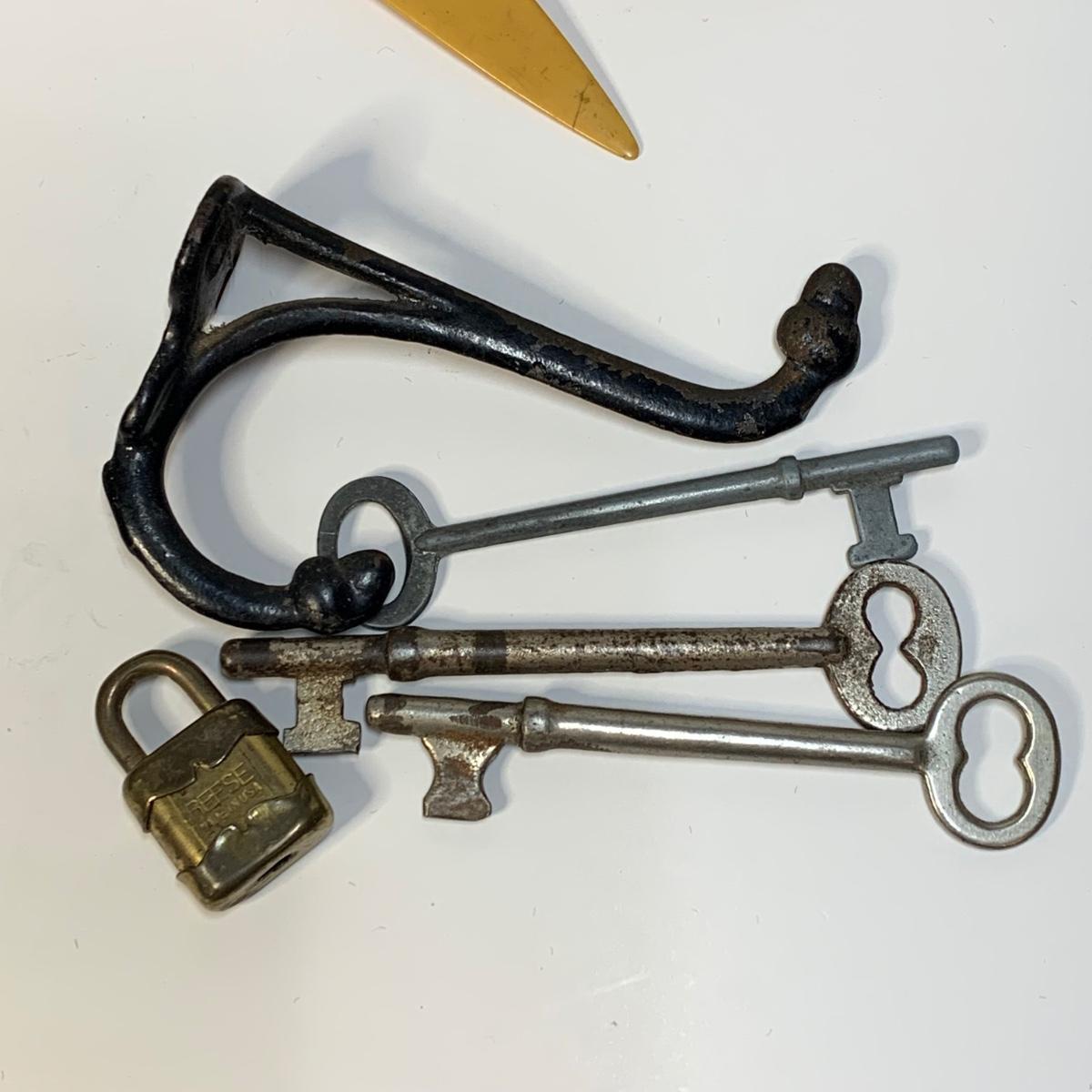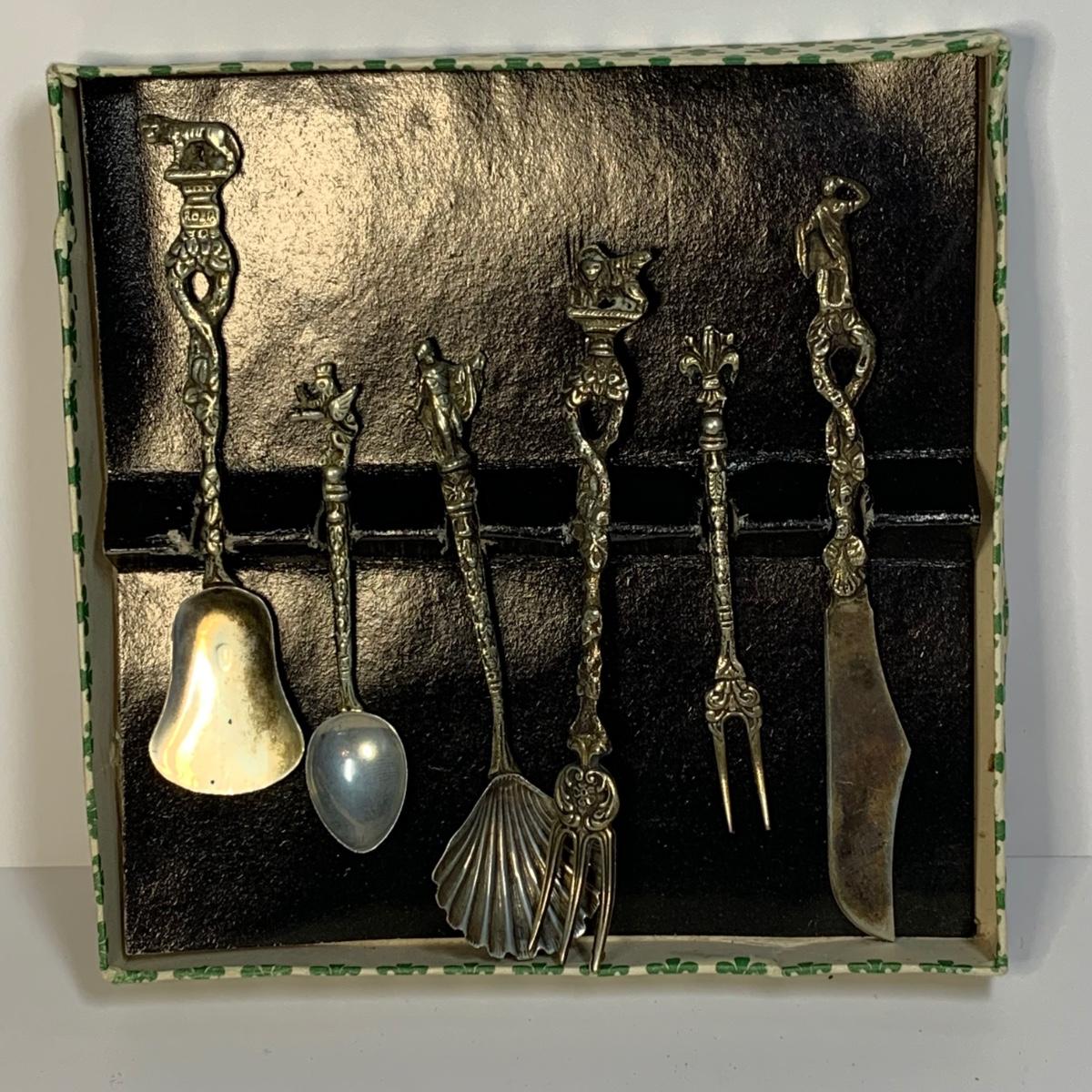 Antique 6 Piece ornate silverplate relish serving set in original box. Glass Paperweight, shoe horns, lock and keys and much more.