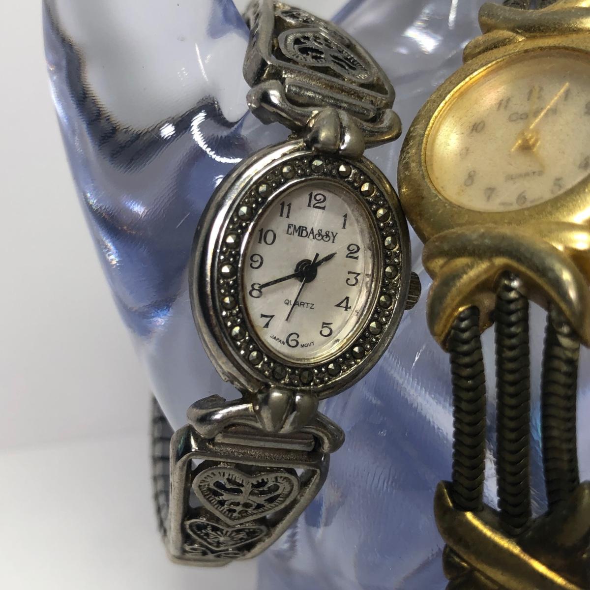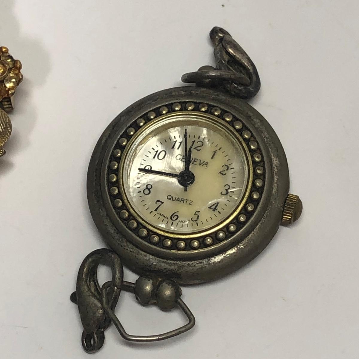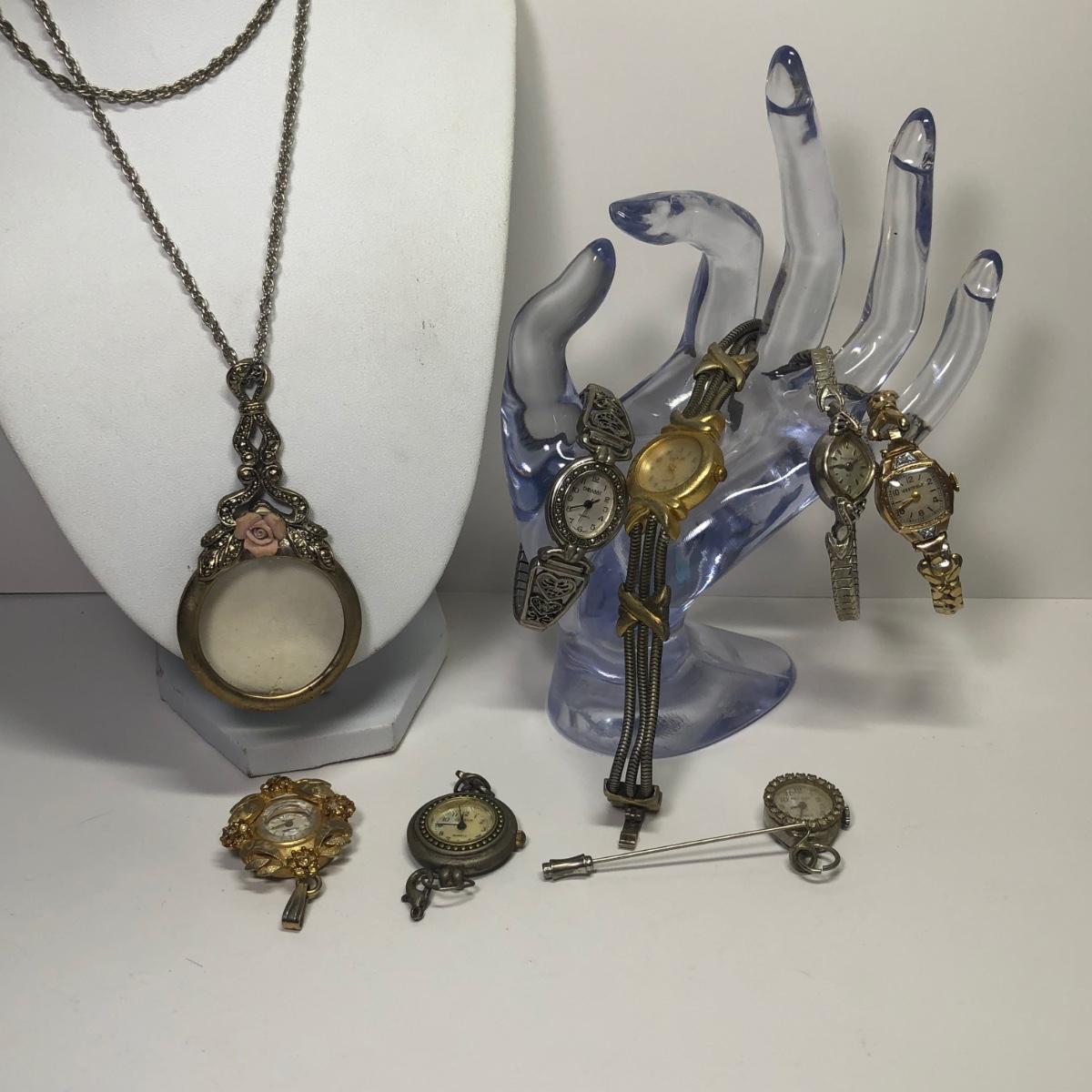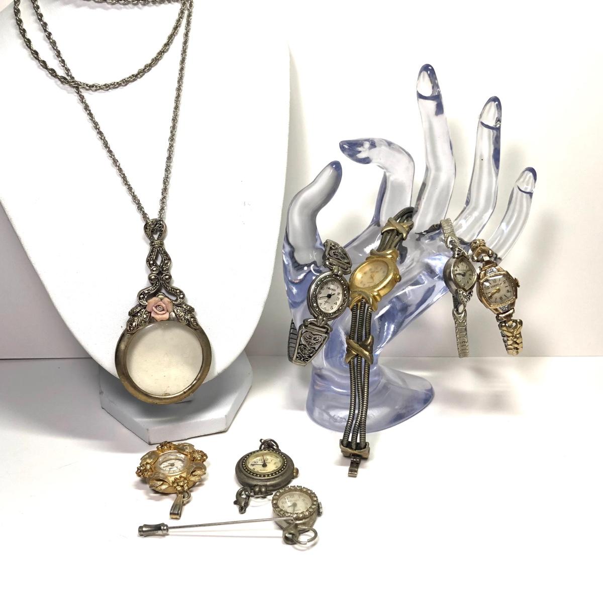 Magnify Necklace is 30" long. 4 Vintage watches, stick pin and watch faces pendants.