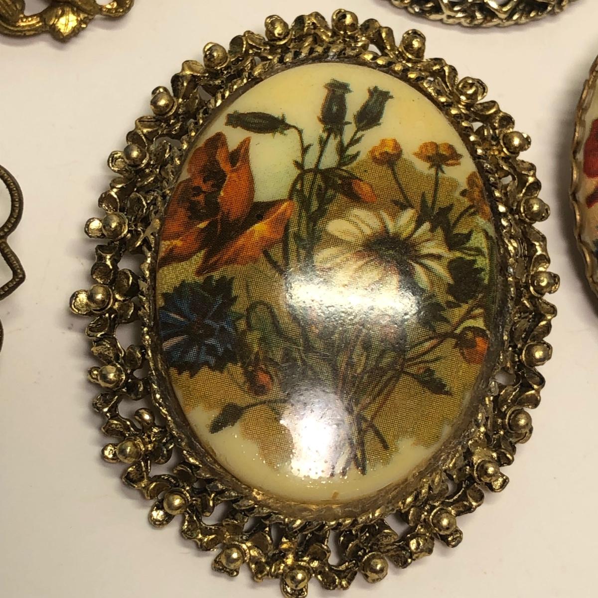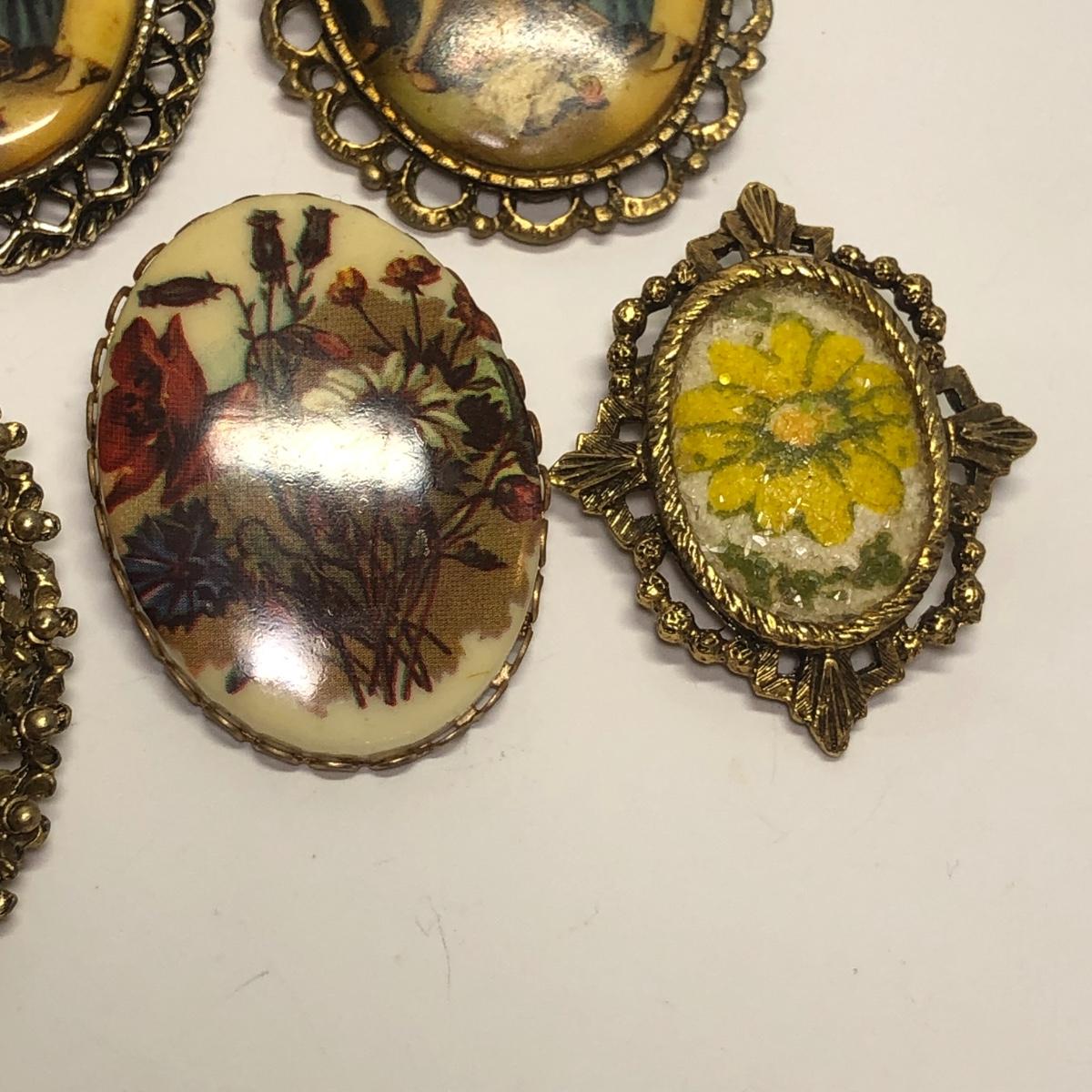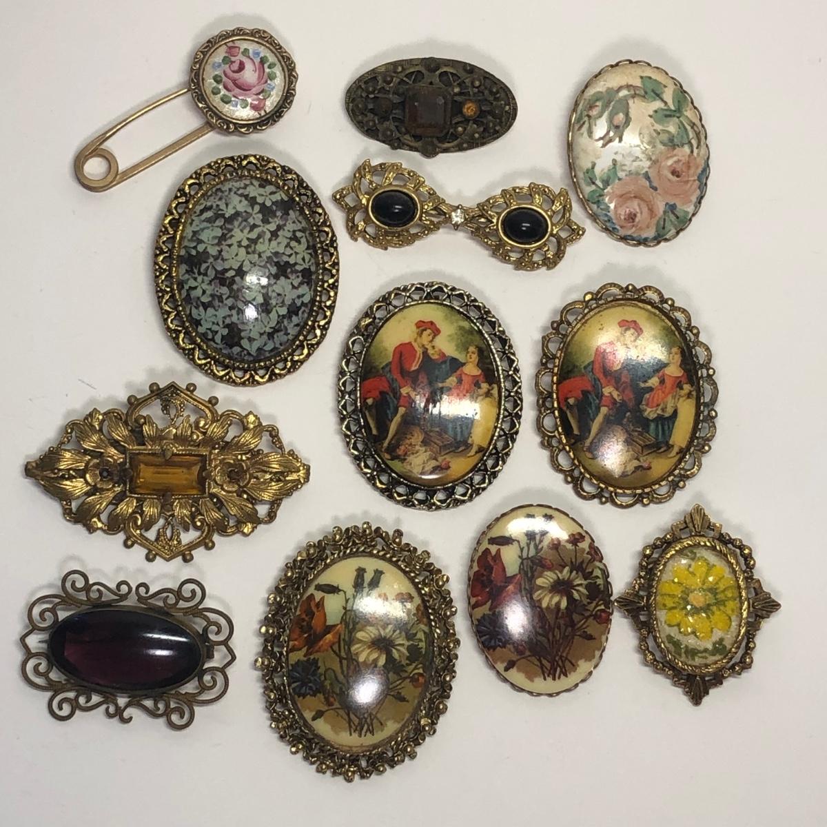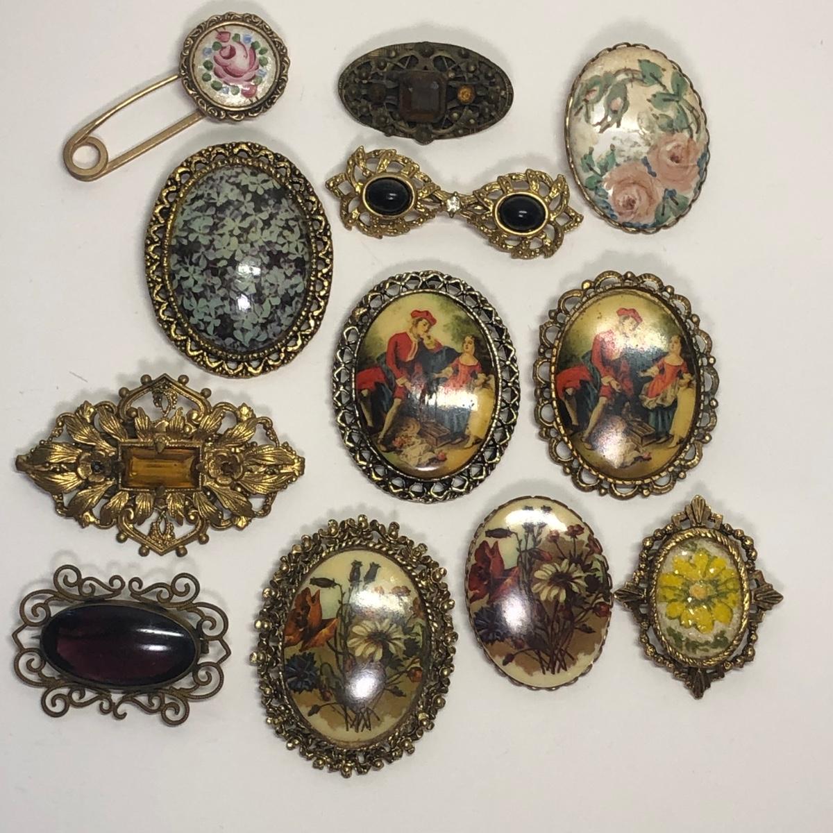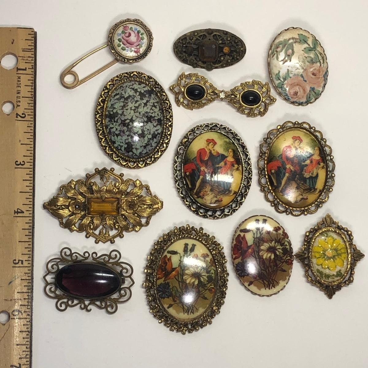 12 Framed vintage broaches. Vibrant colors.