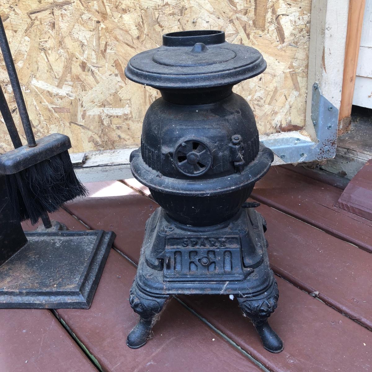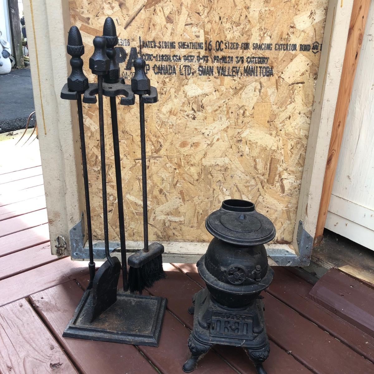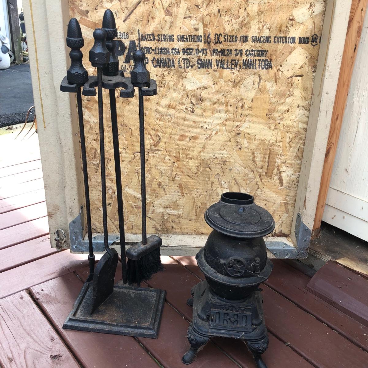 LOT 166M: Small Spark Potbelly Stove & Fireplace Tools