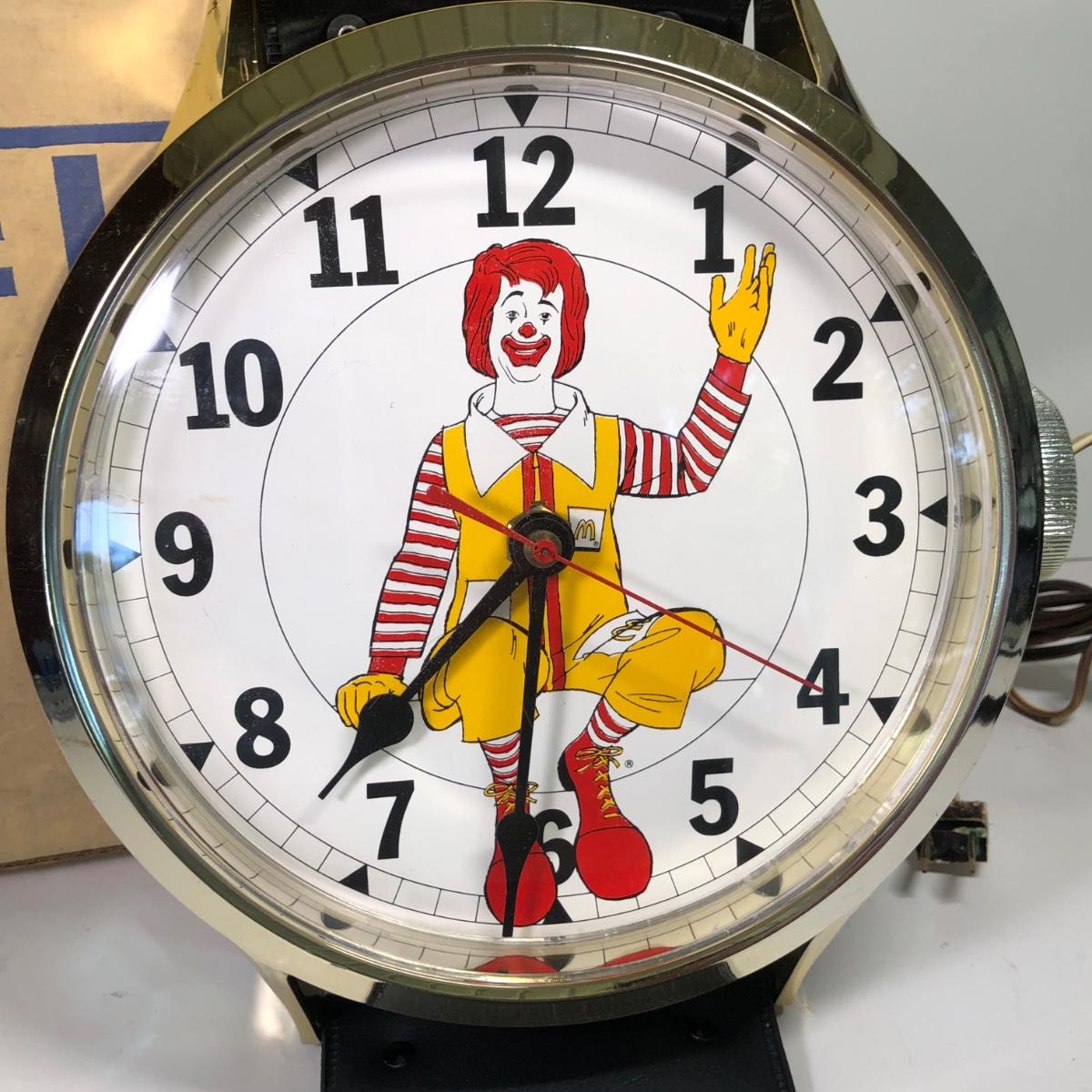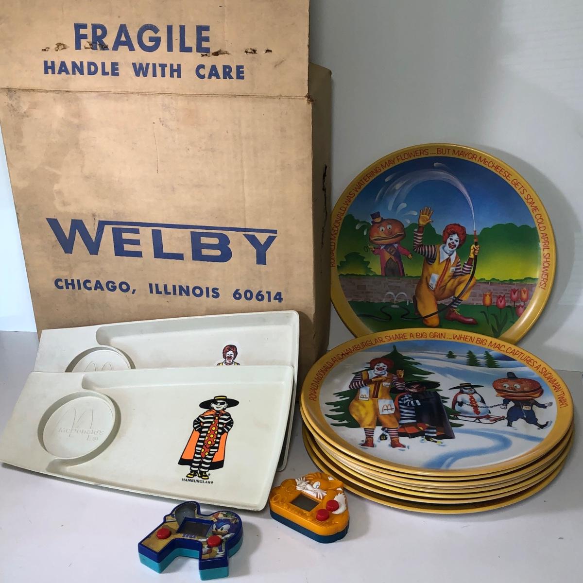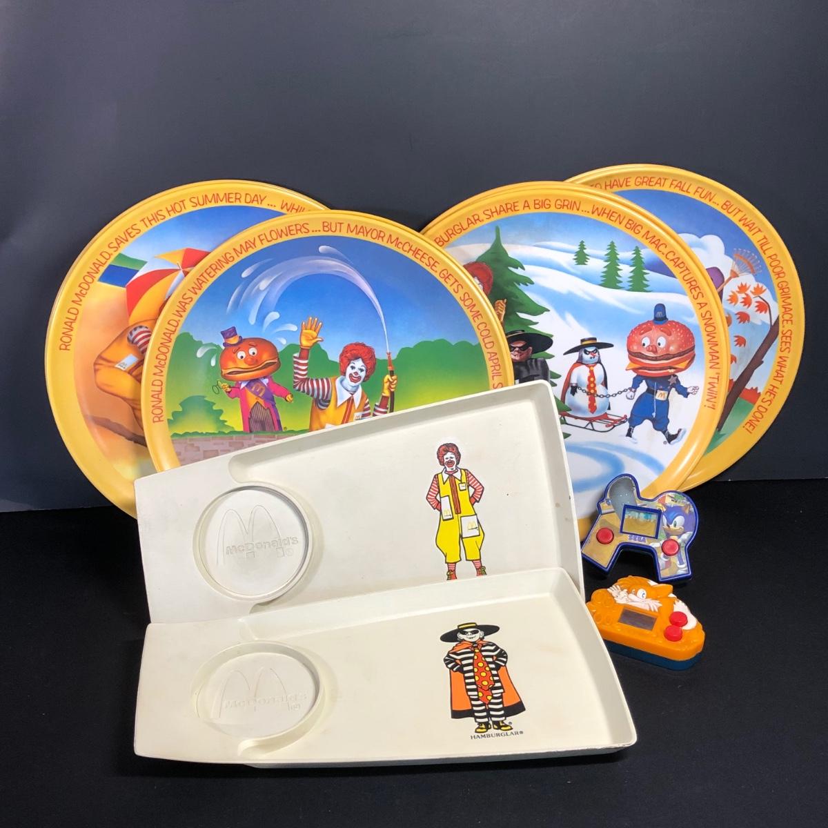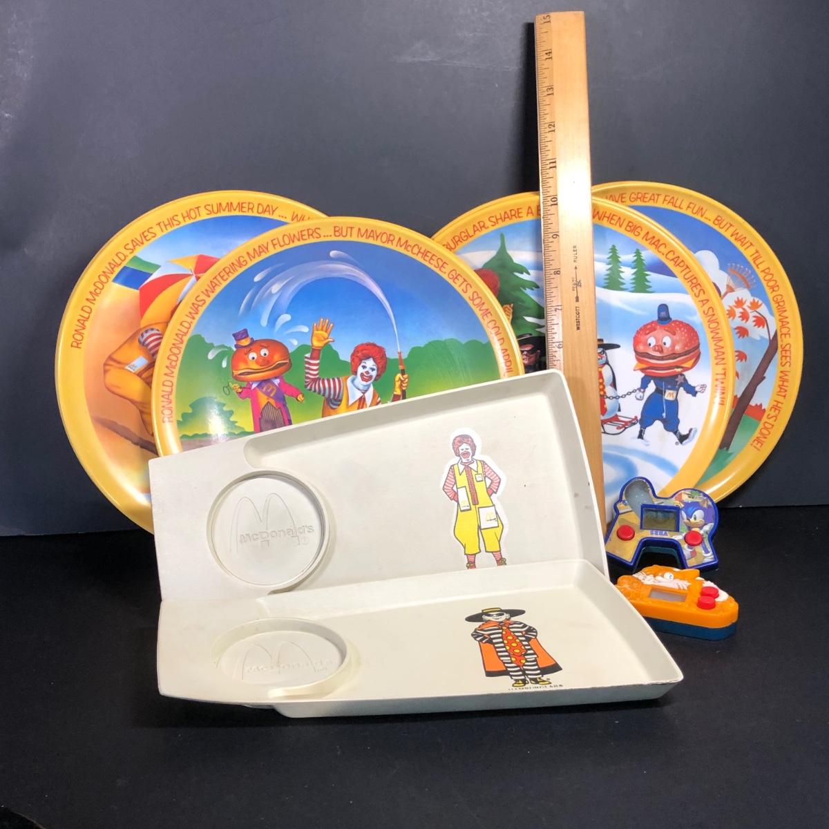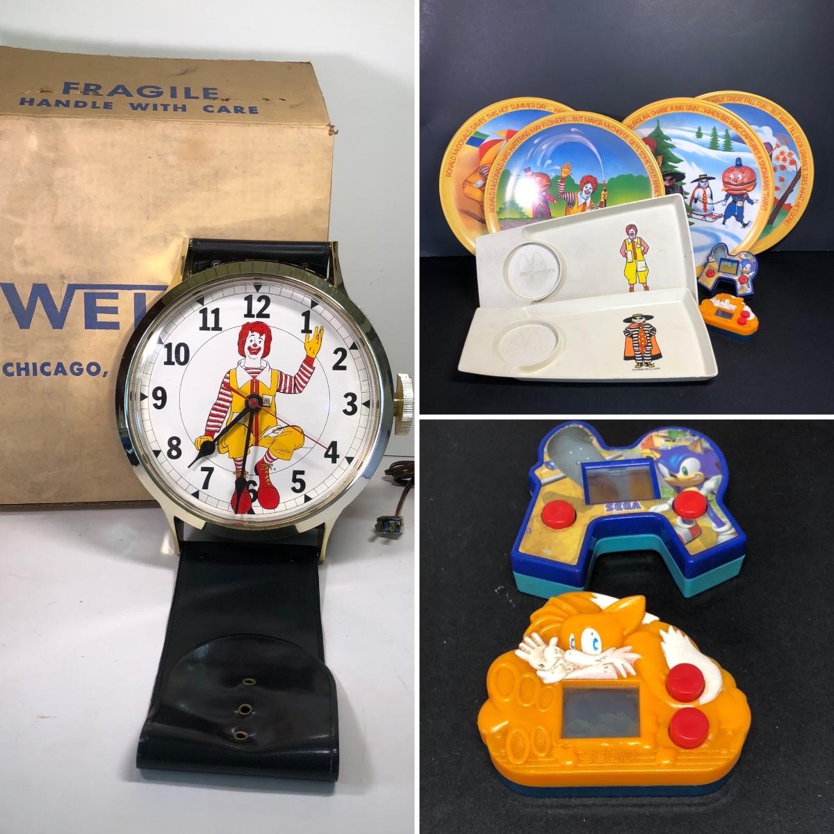 LOT 170M: Vintage McDonald's Collection - NIB Welby Ronald McDonald Giant Watch Clock, 1977 Seasonal Plates, Simon Marketing Character Plates w/ Cup Holder & Handheld Sonic Game Toys