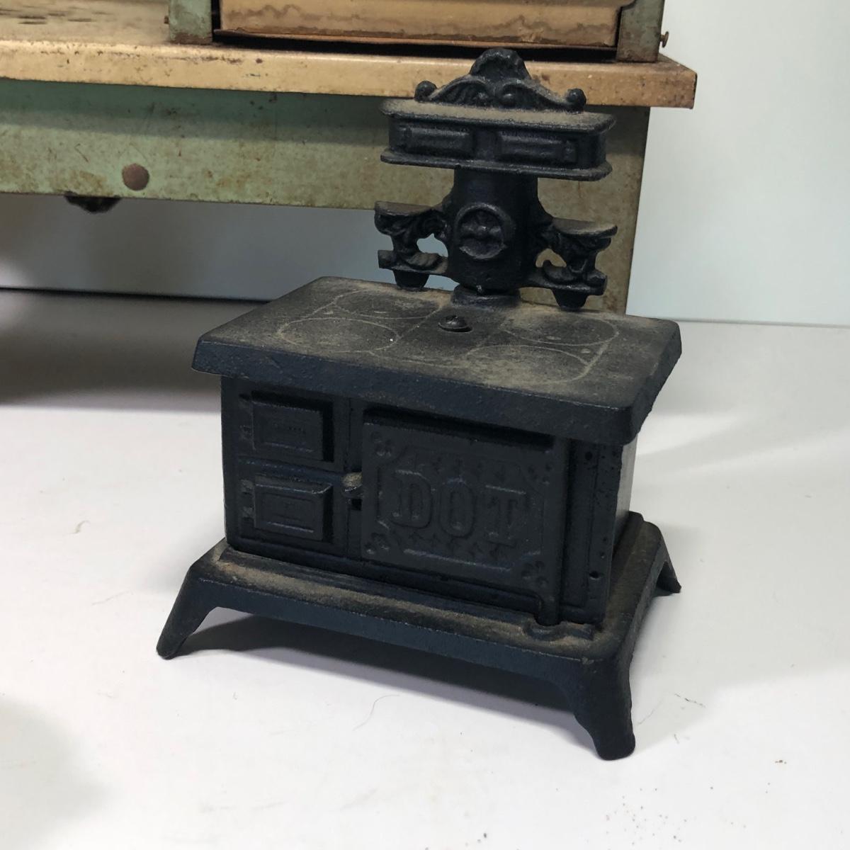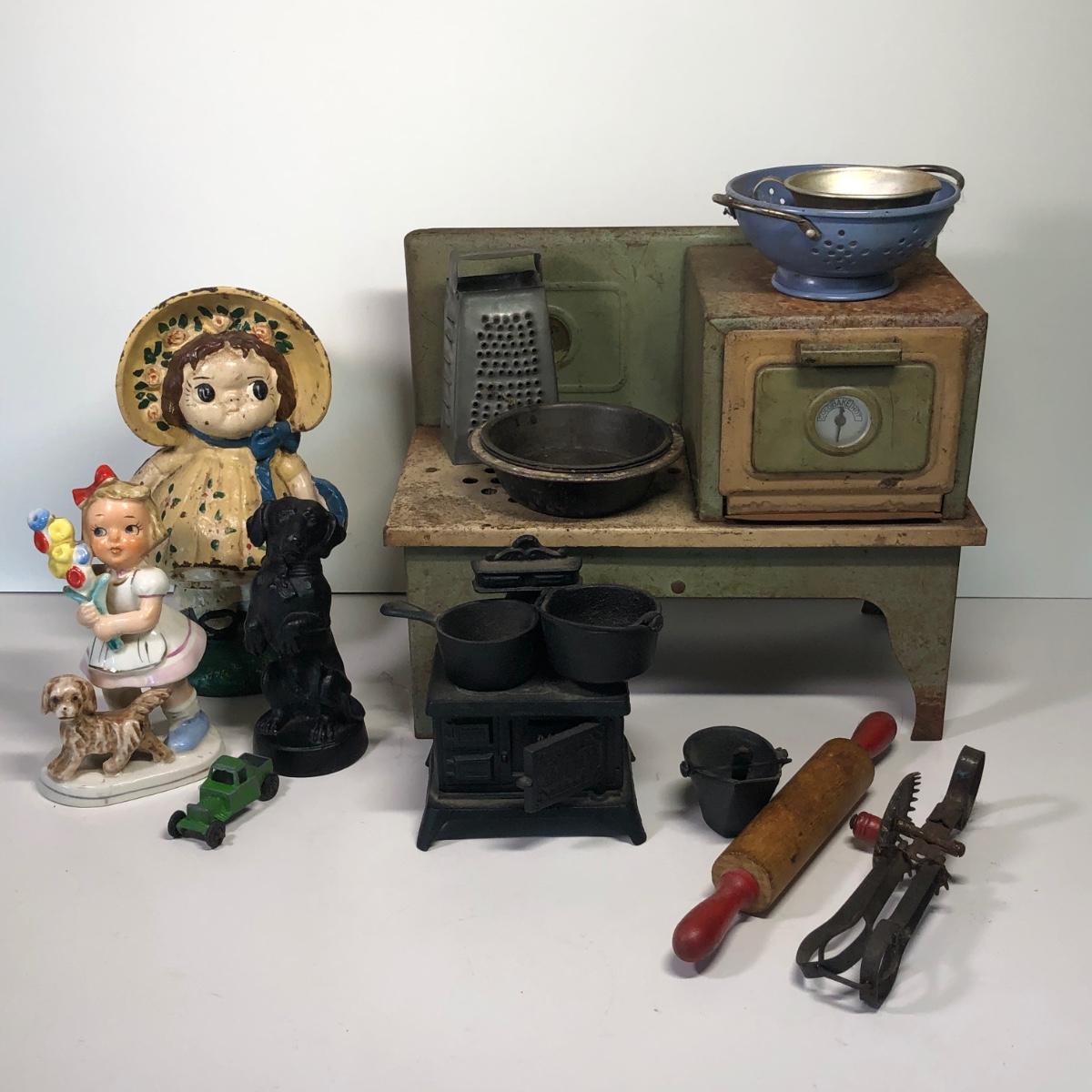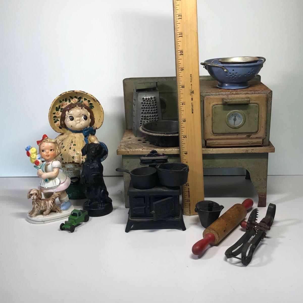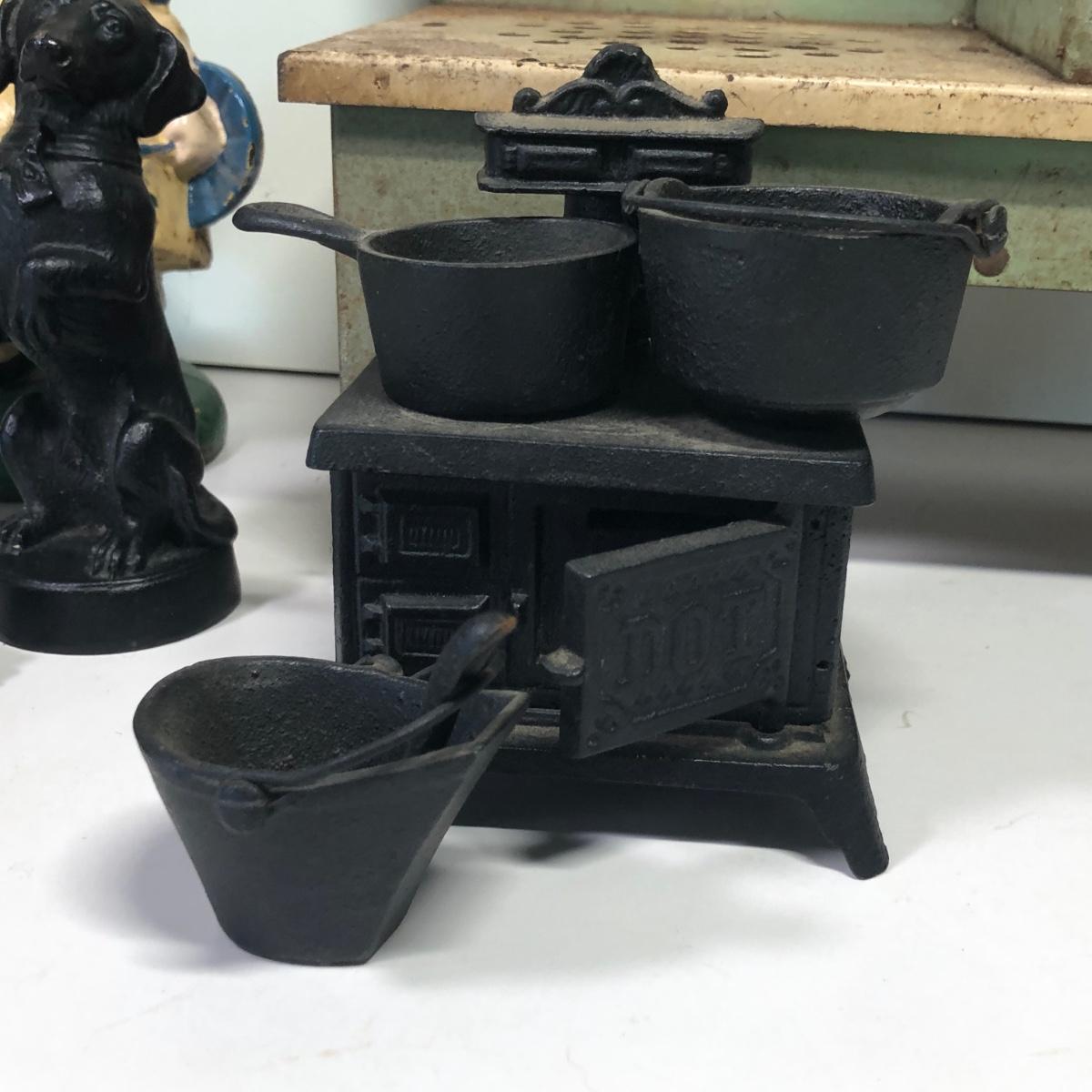 LOT 191M: Vintage Miniature Stove, Mini Kitchen Accessories, Cast Iron Coin Bank & More