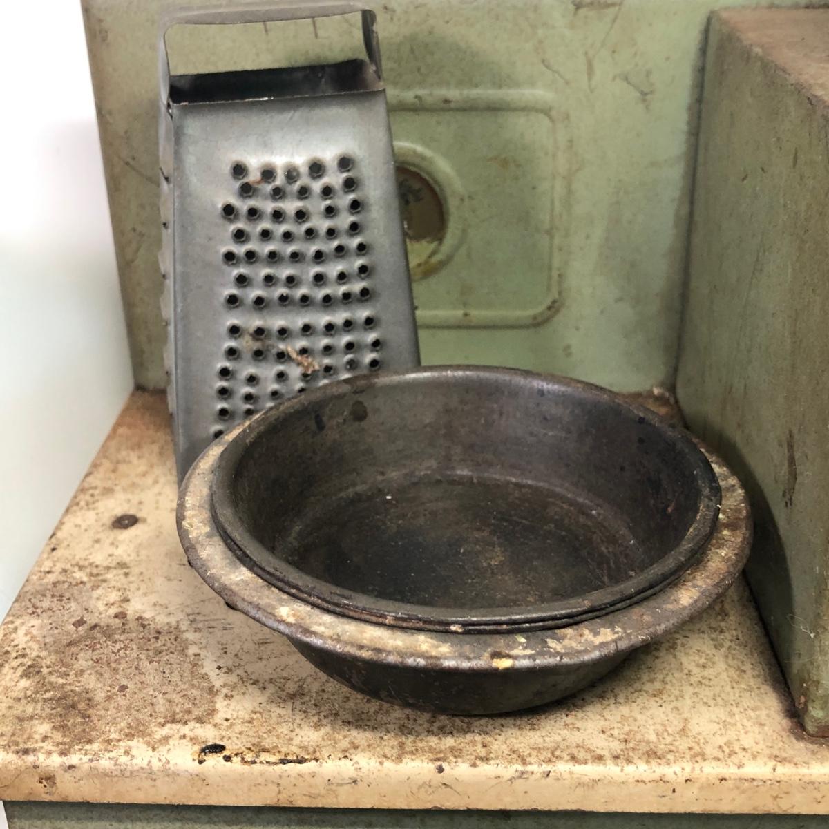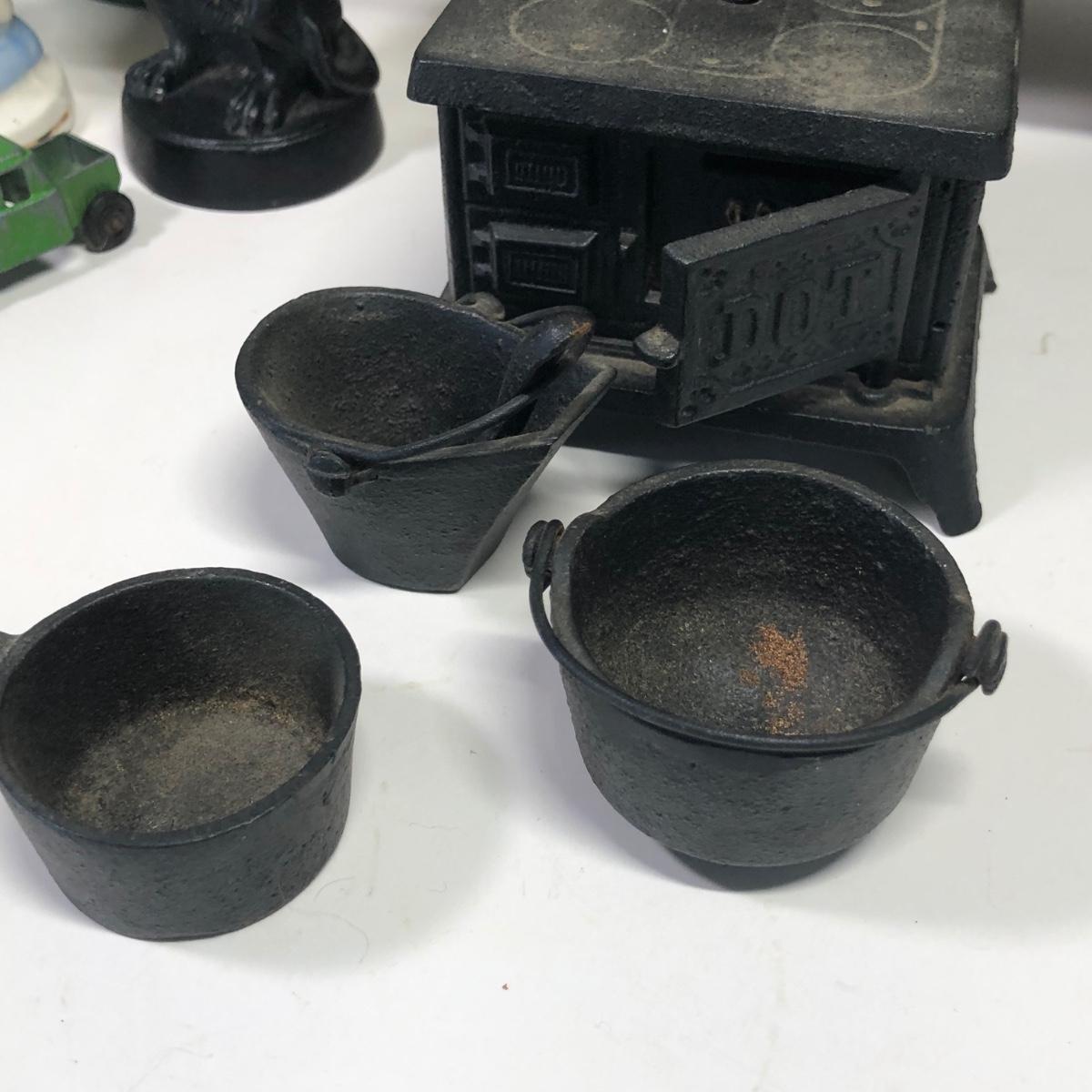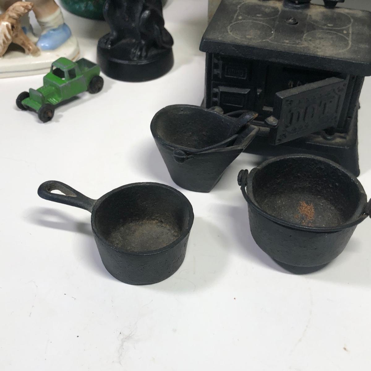 LOT 191M: Vintage Miniature Stove, Mini Kitchen Accessories, Cast Iron Coin Bank & More