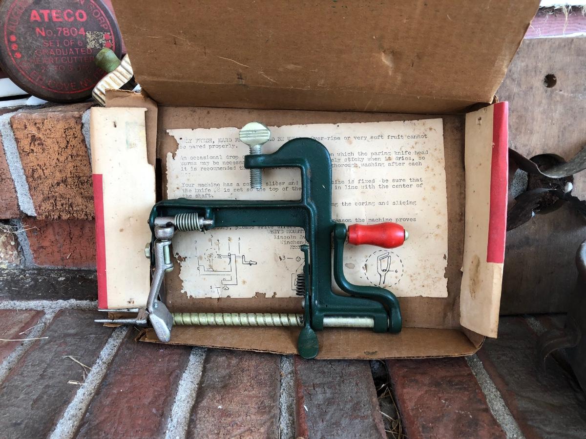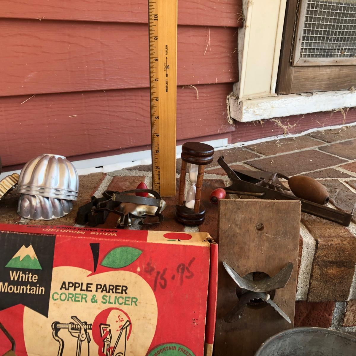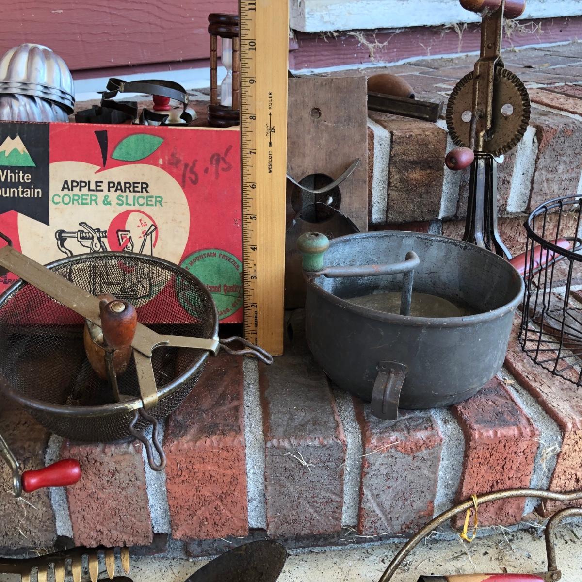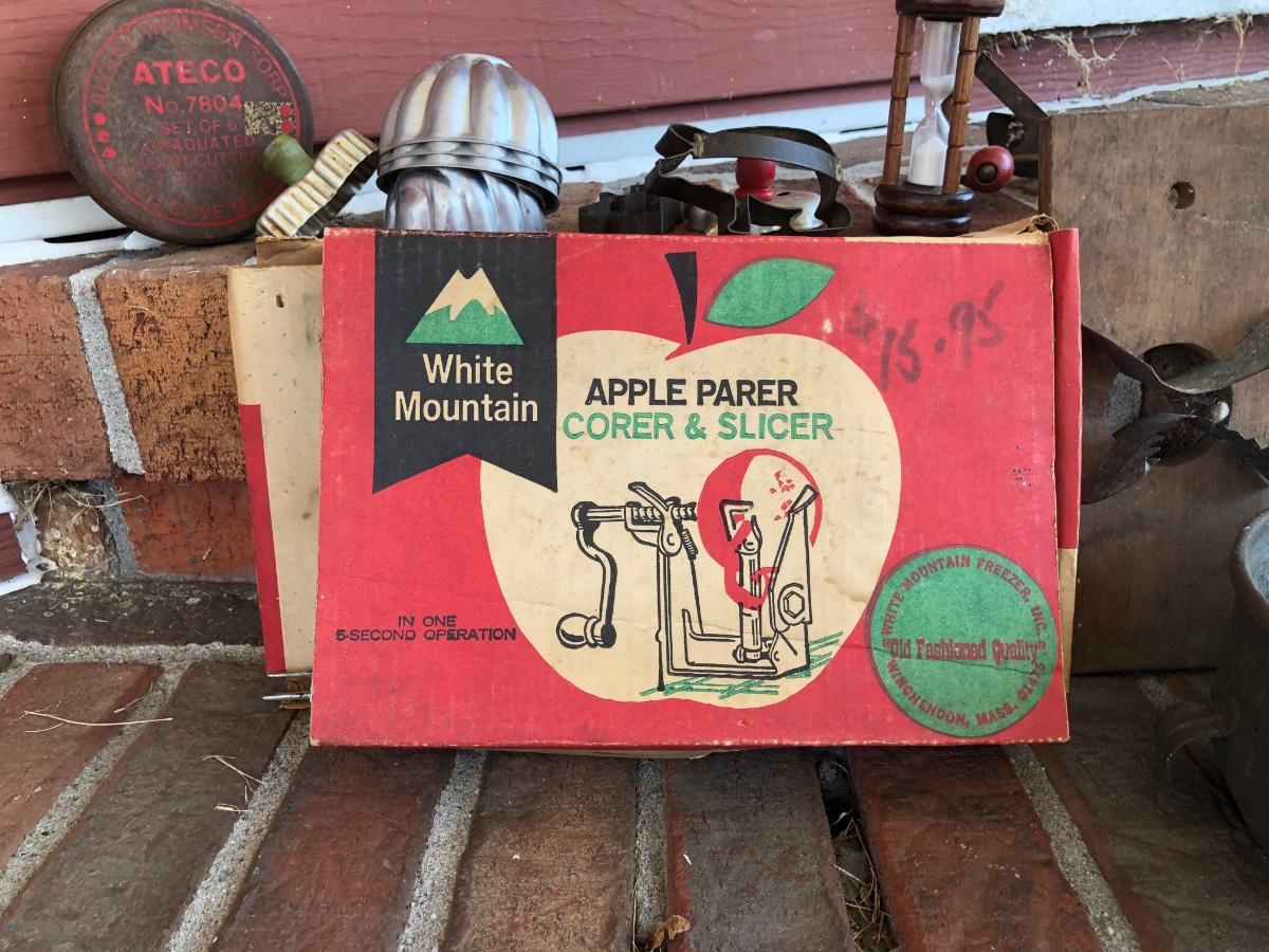 LOT 199M: Vintage Kitchen Collection - White Mountain Apple Parer in Box, "Perfect" Sifter, Ateco No 7804 Set of Heart Cookie Cutters, Jello Moulds, Mouli Grater & More
