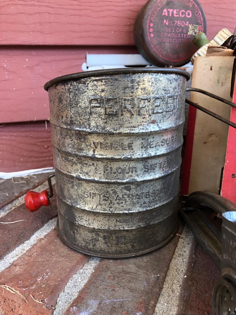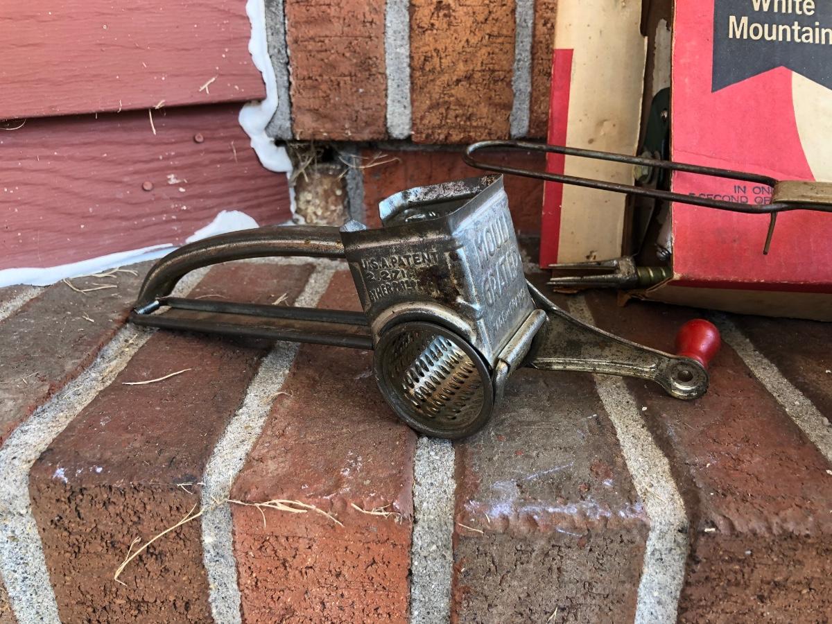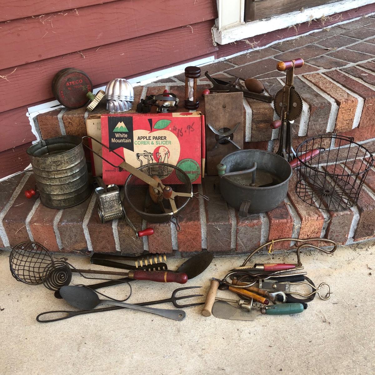 LOT 199M: Vintage Kitchen Collection - White Mountain Apple Parer in Box, "Perfect" Sifter, Ateco No 7804 Set of Heart Cookie Cutters, Jello Moulds, Mouli Grater & More