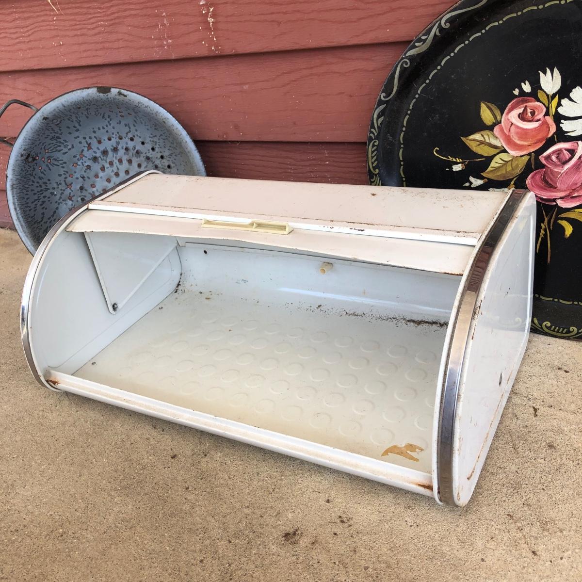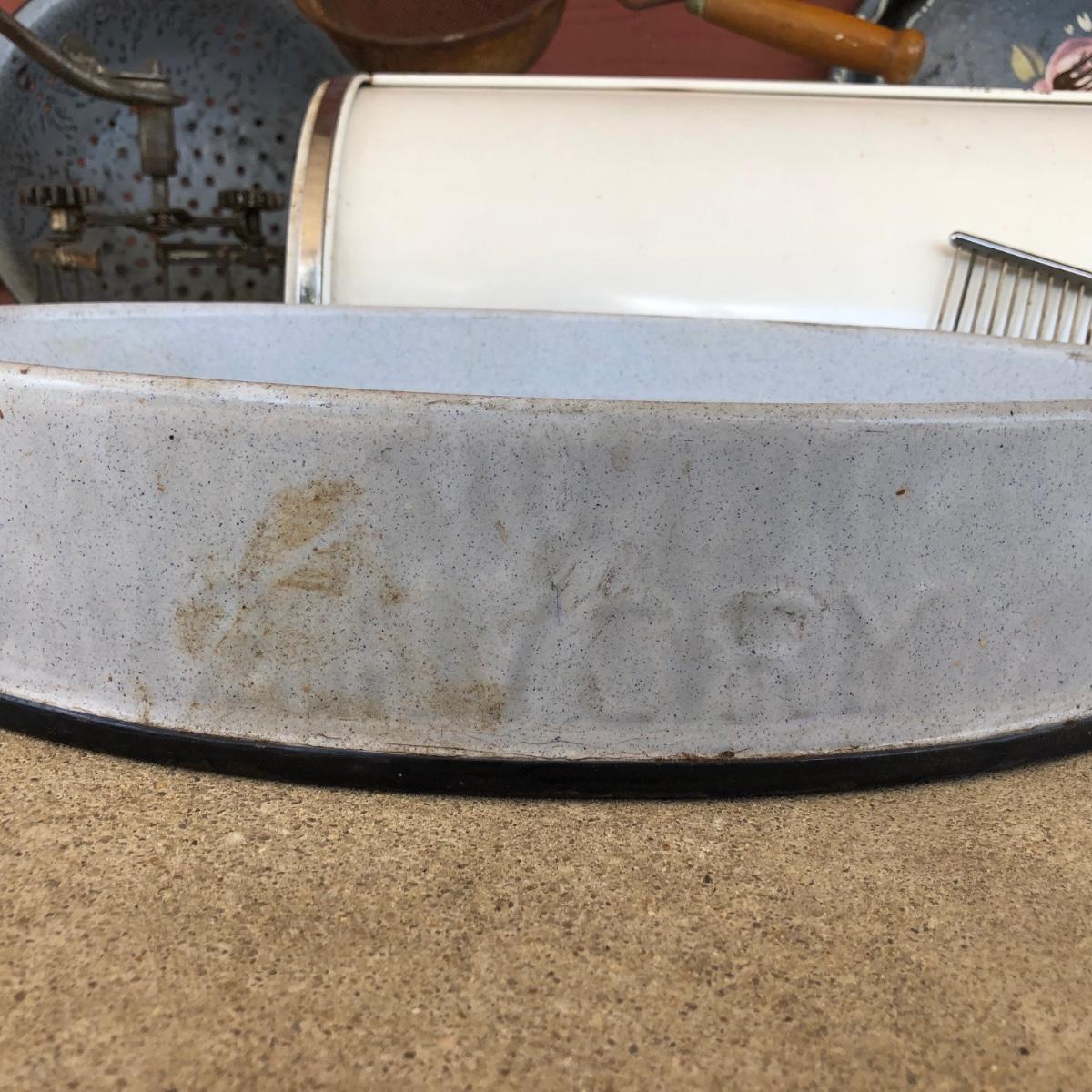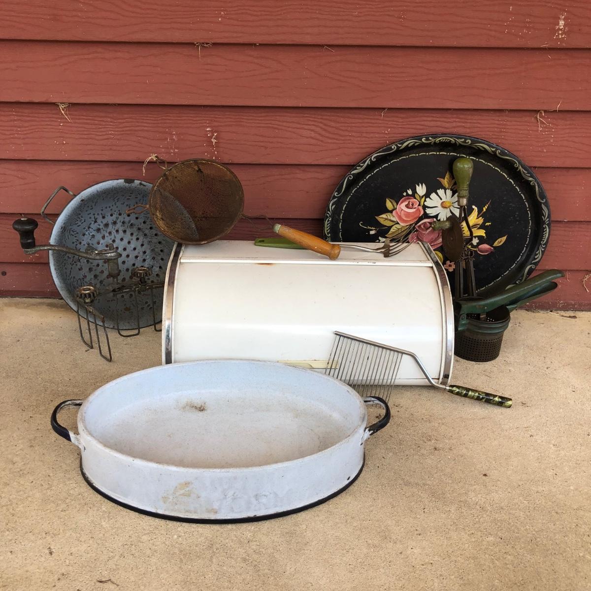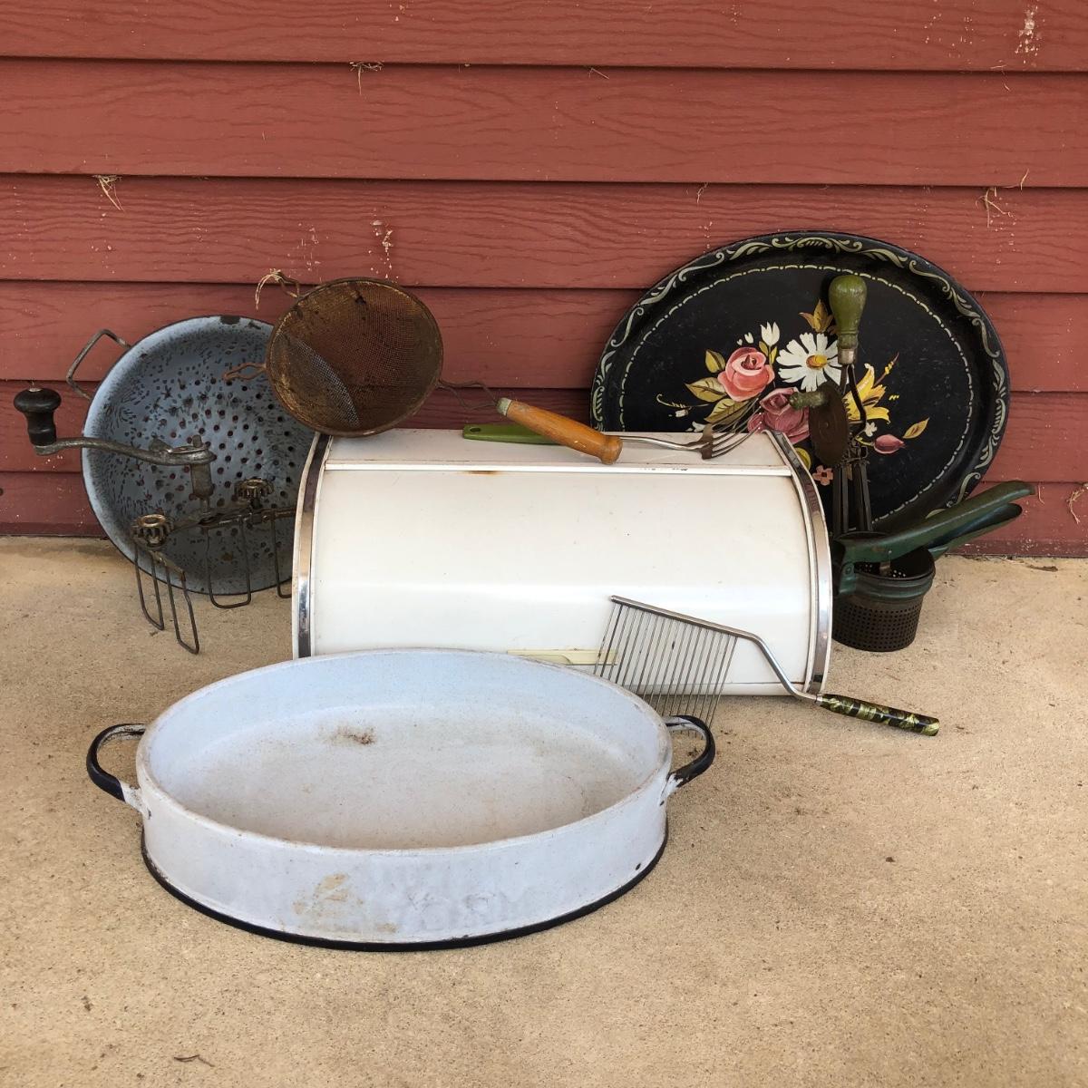 LOT 201M: Enamel "Savory" Dish, Bread Box, Collander, Kitchen Tools & More