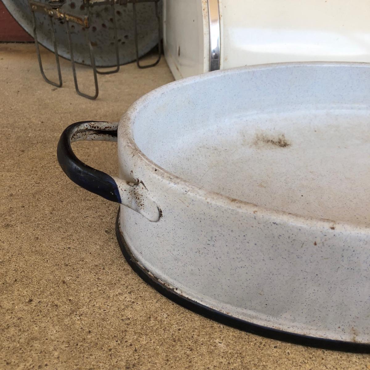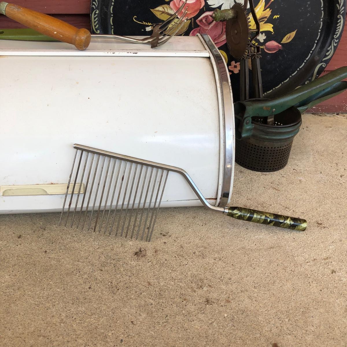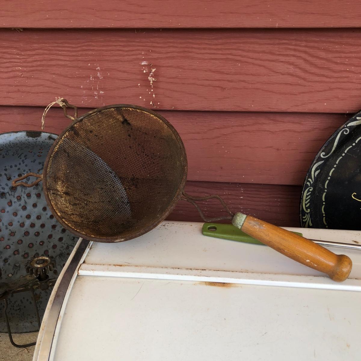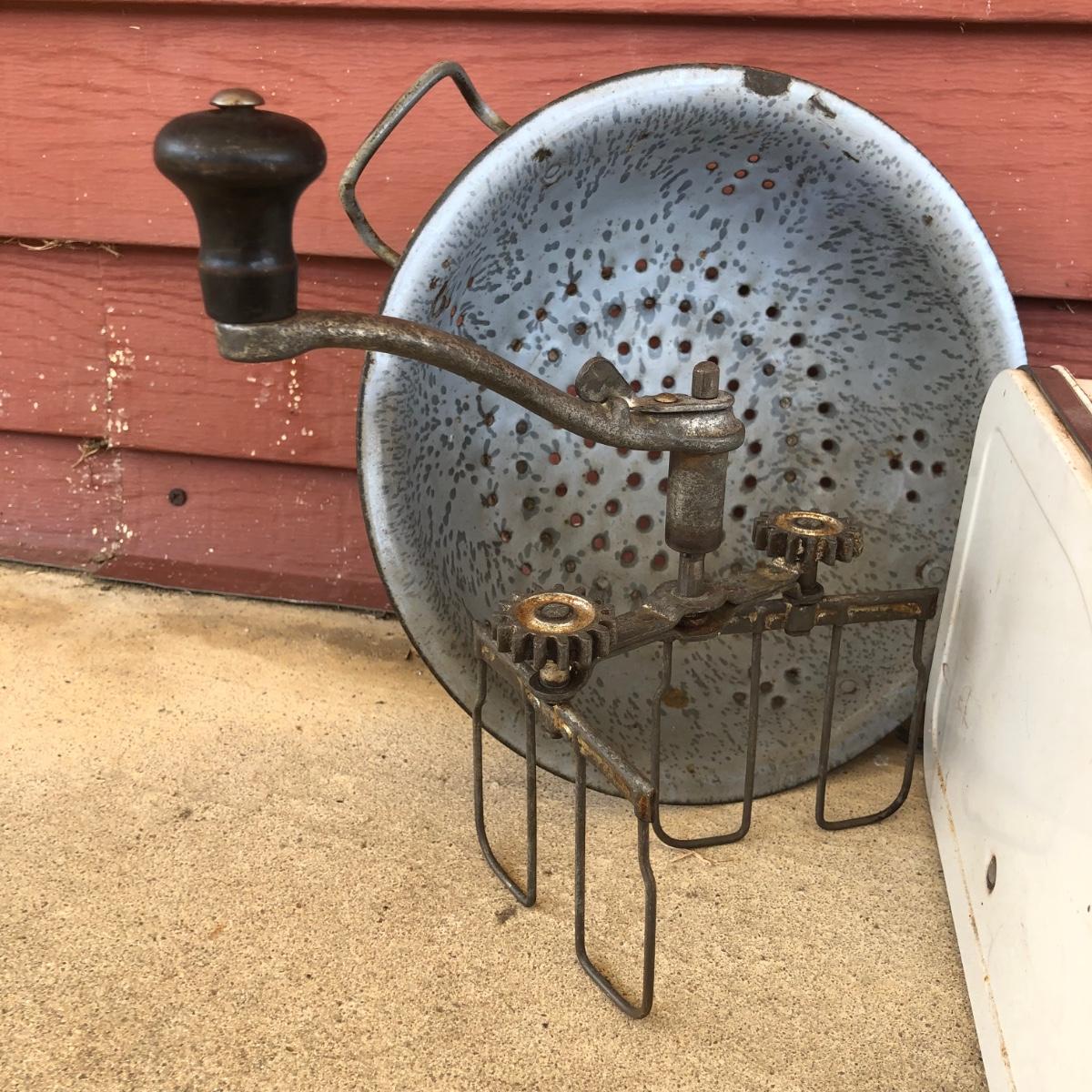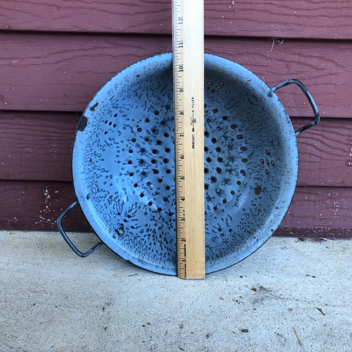 LOT 201M: Enamel "Savory" Dish, Bread Box, Collander, Kitchen Tools & More