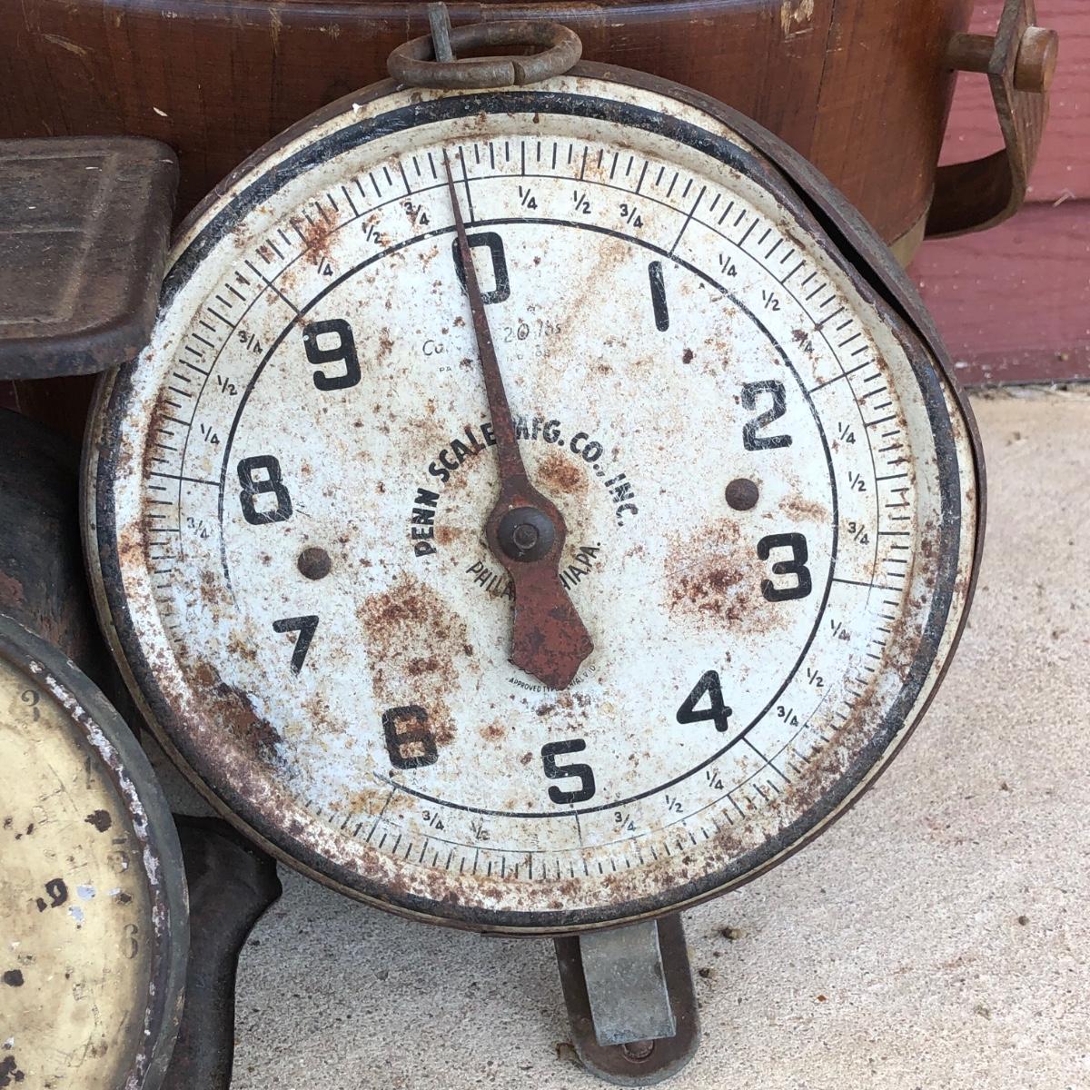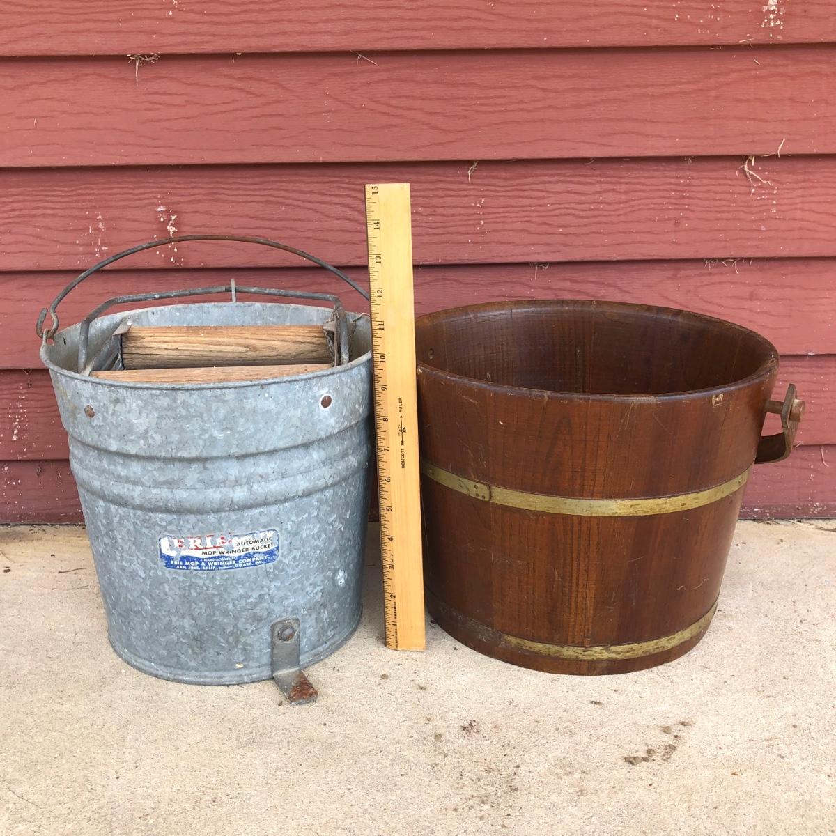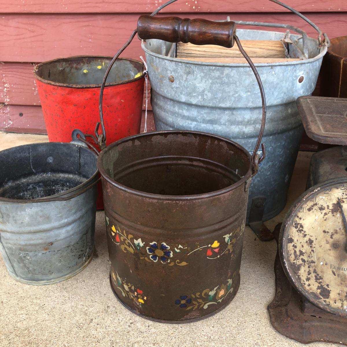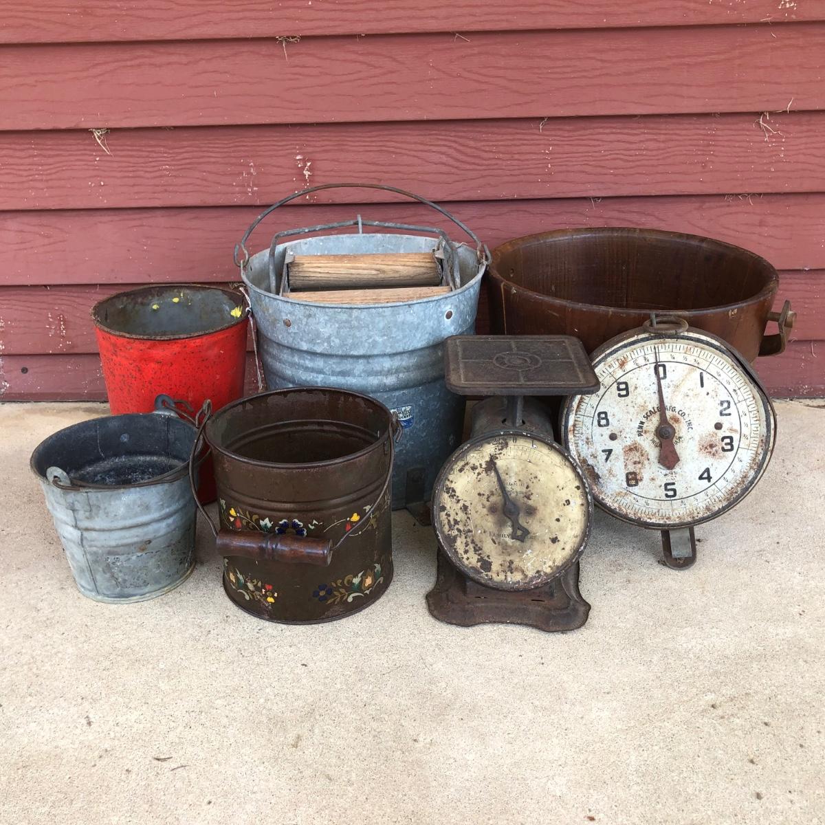 LOT 204M: Vintage Buckets & Columbia Scale w/ Penn Scale Mfg. Co. Scale Part & Erie Auto Mopwringer Bucket