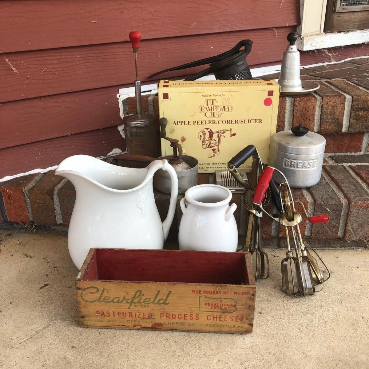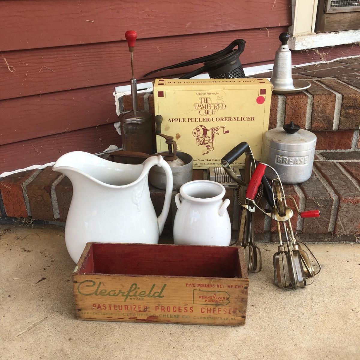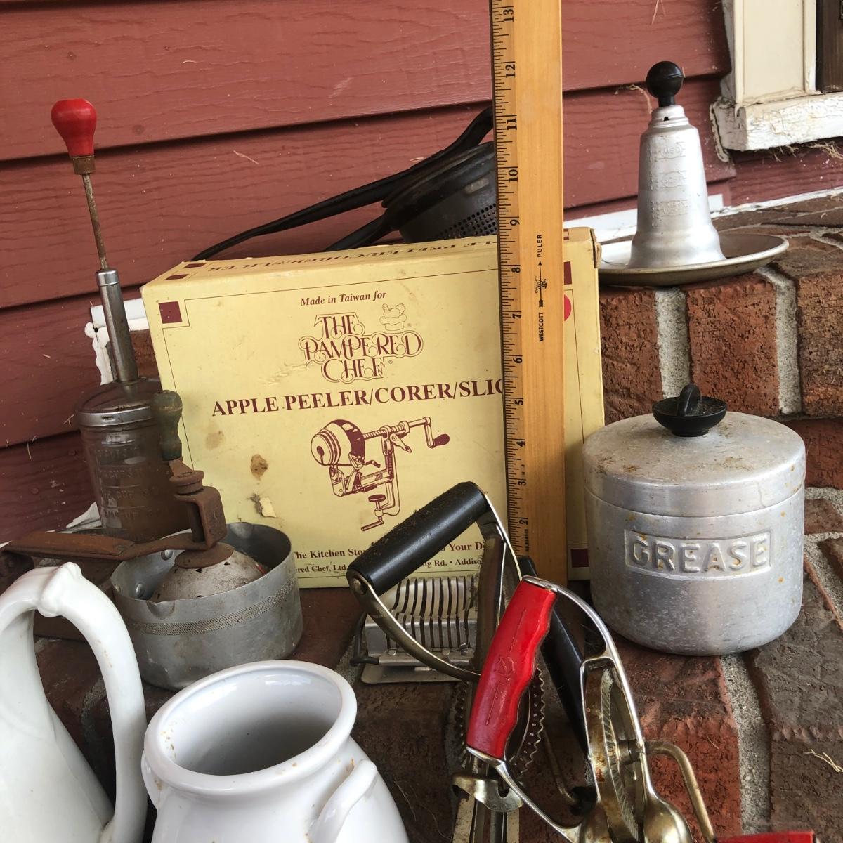 LOT 206M: Clearfield Cheese Box, Pampered Chef Apple Peeler/Corer/Slicer in Box, Grease Jar & More Vintage Kitchen