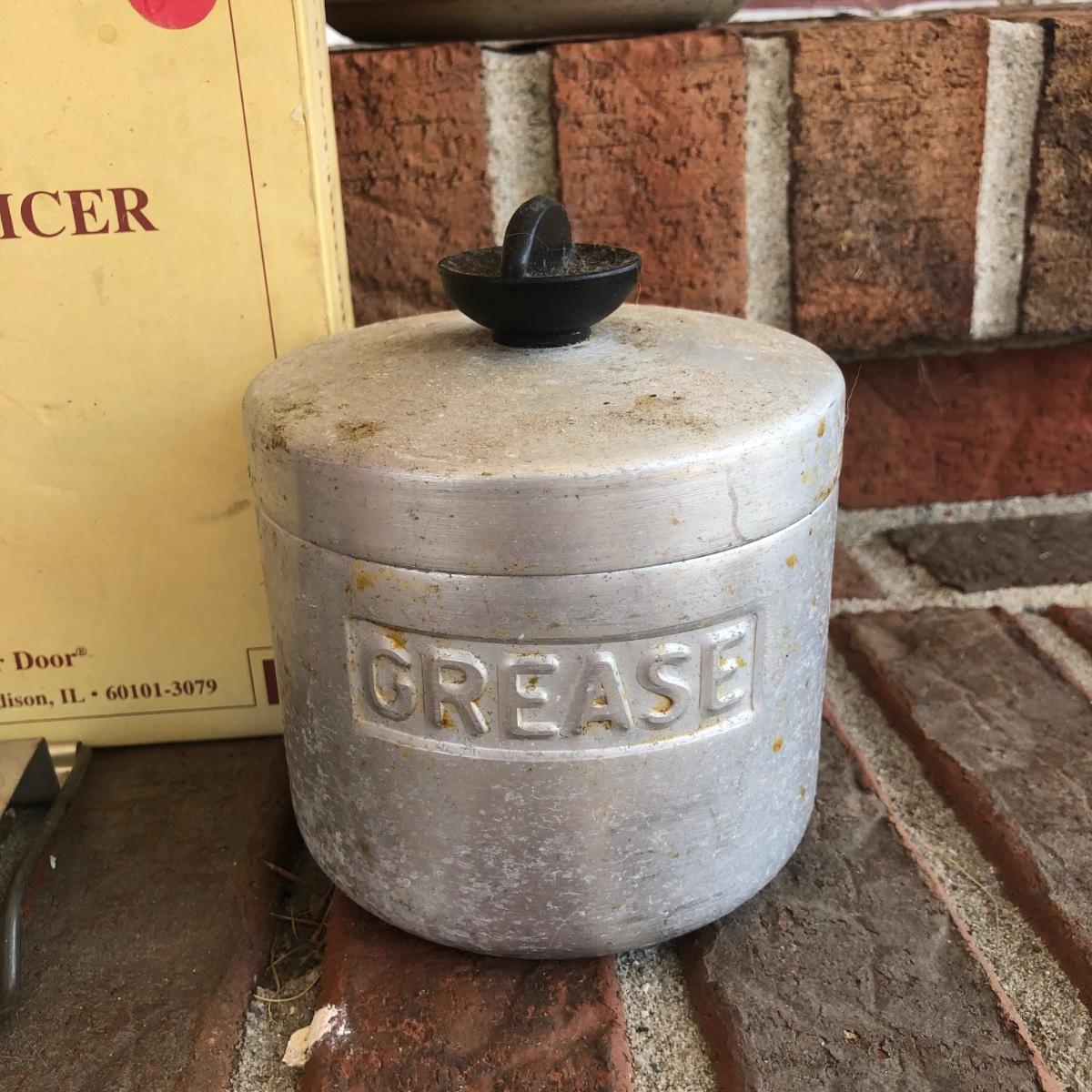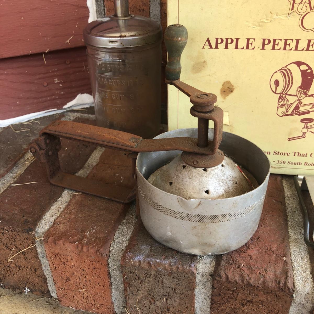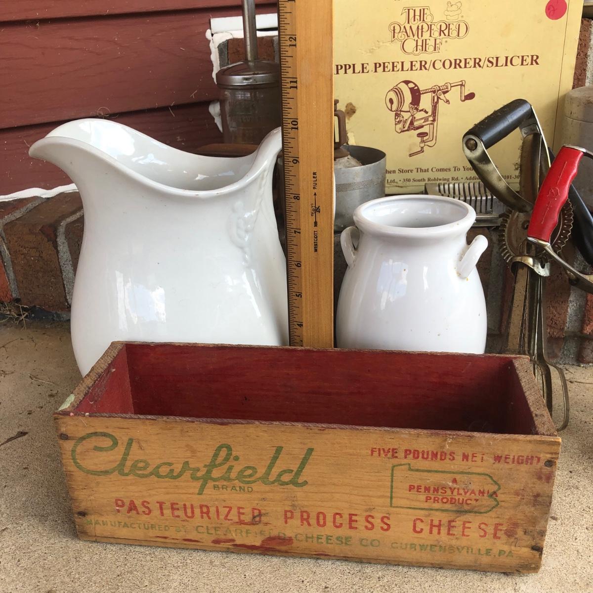 LOT 206M: Clearfield Cheese Box, Pampered Chef Apple Peeler/Corer/Slicer in Box, Grease Jar & More Vintage Kitchen