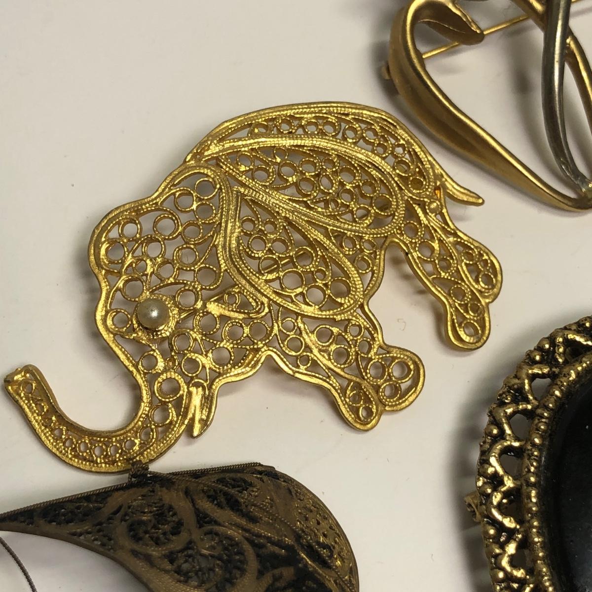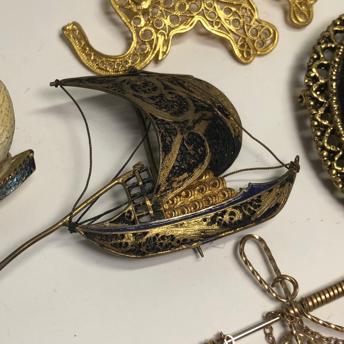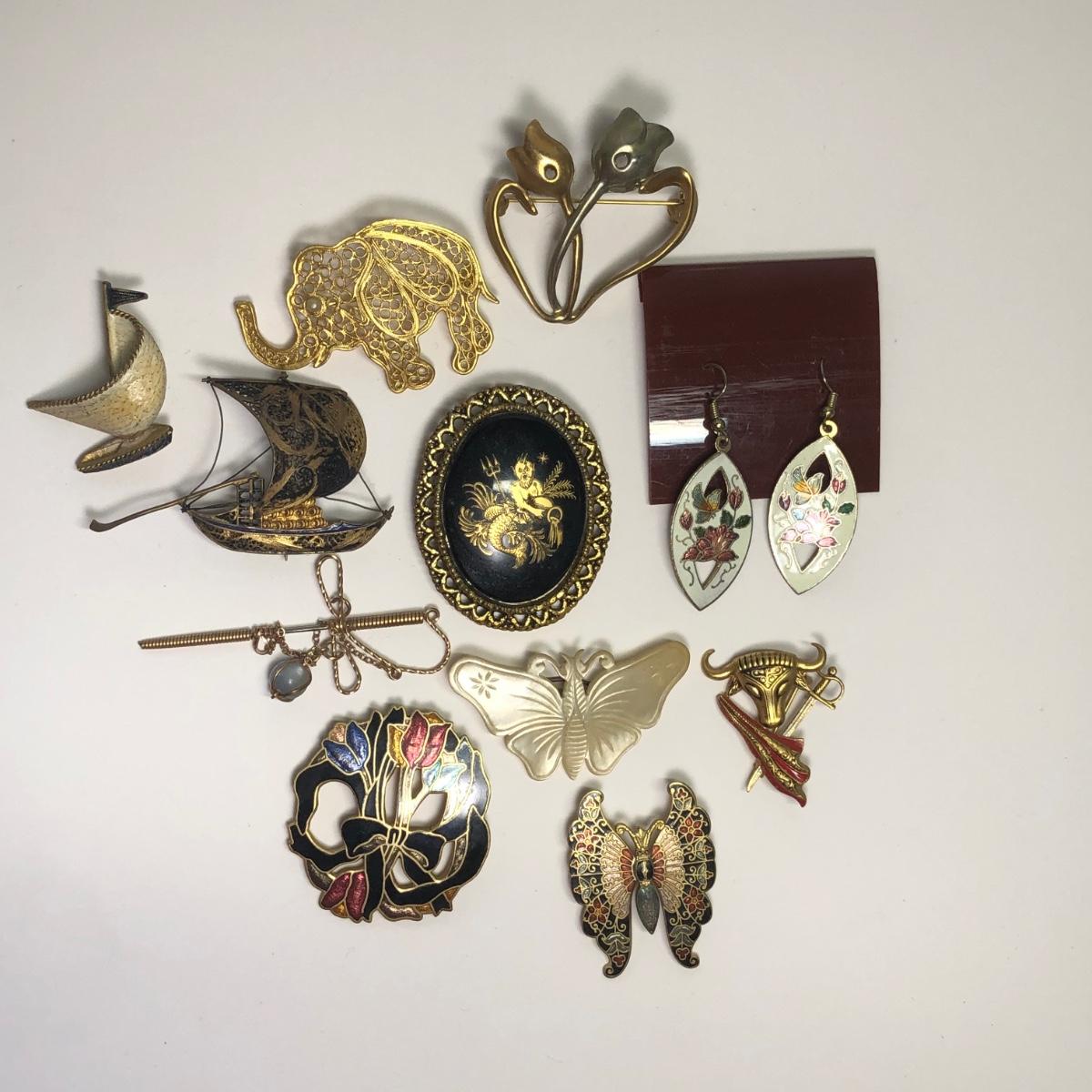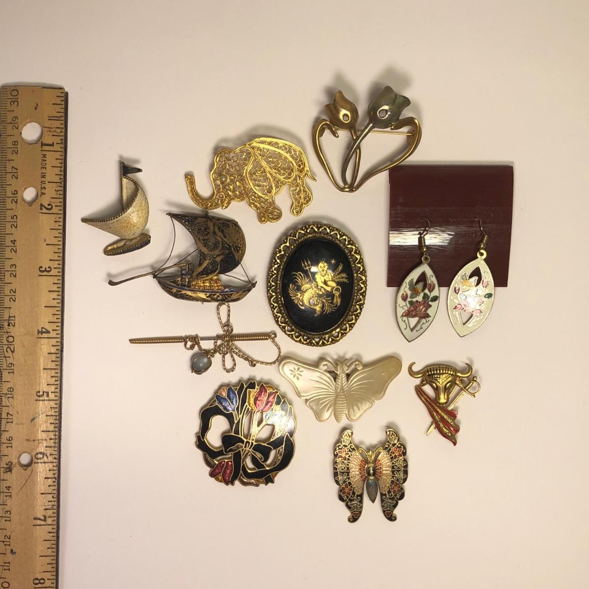 LOT 215: Brooches, Earrings: Filigree Elephant, Sailboats, Butterflies, & More