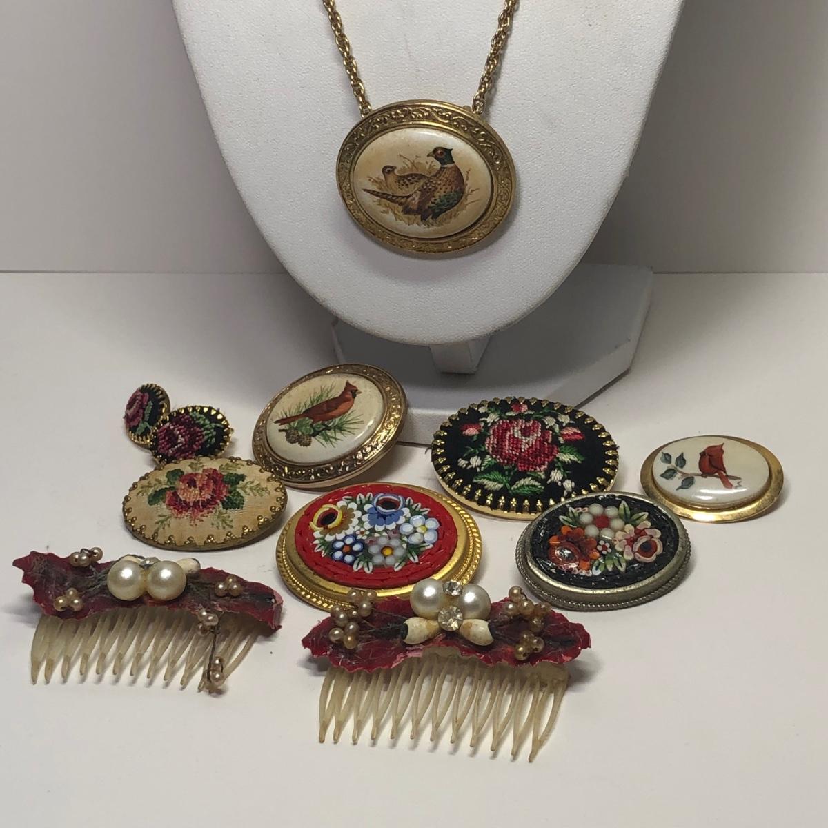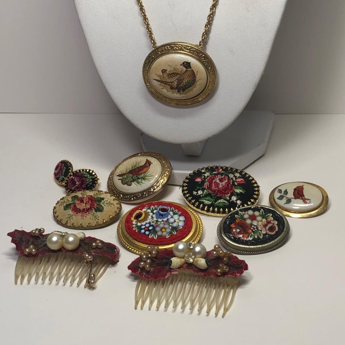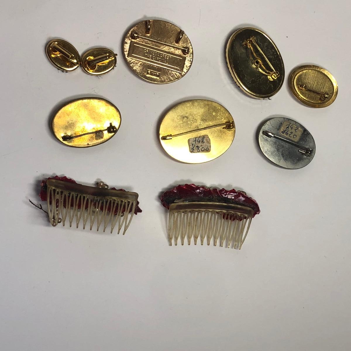 Floral cameo broaches, victorian style hair clips, rose earrings and pheasant pendant.