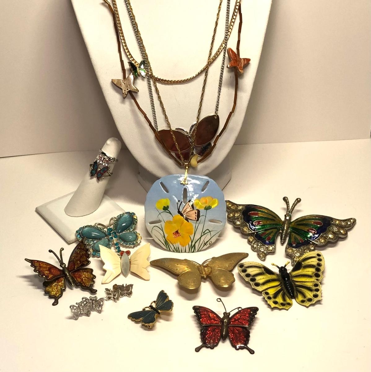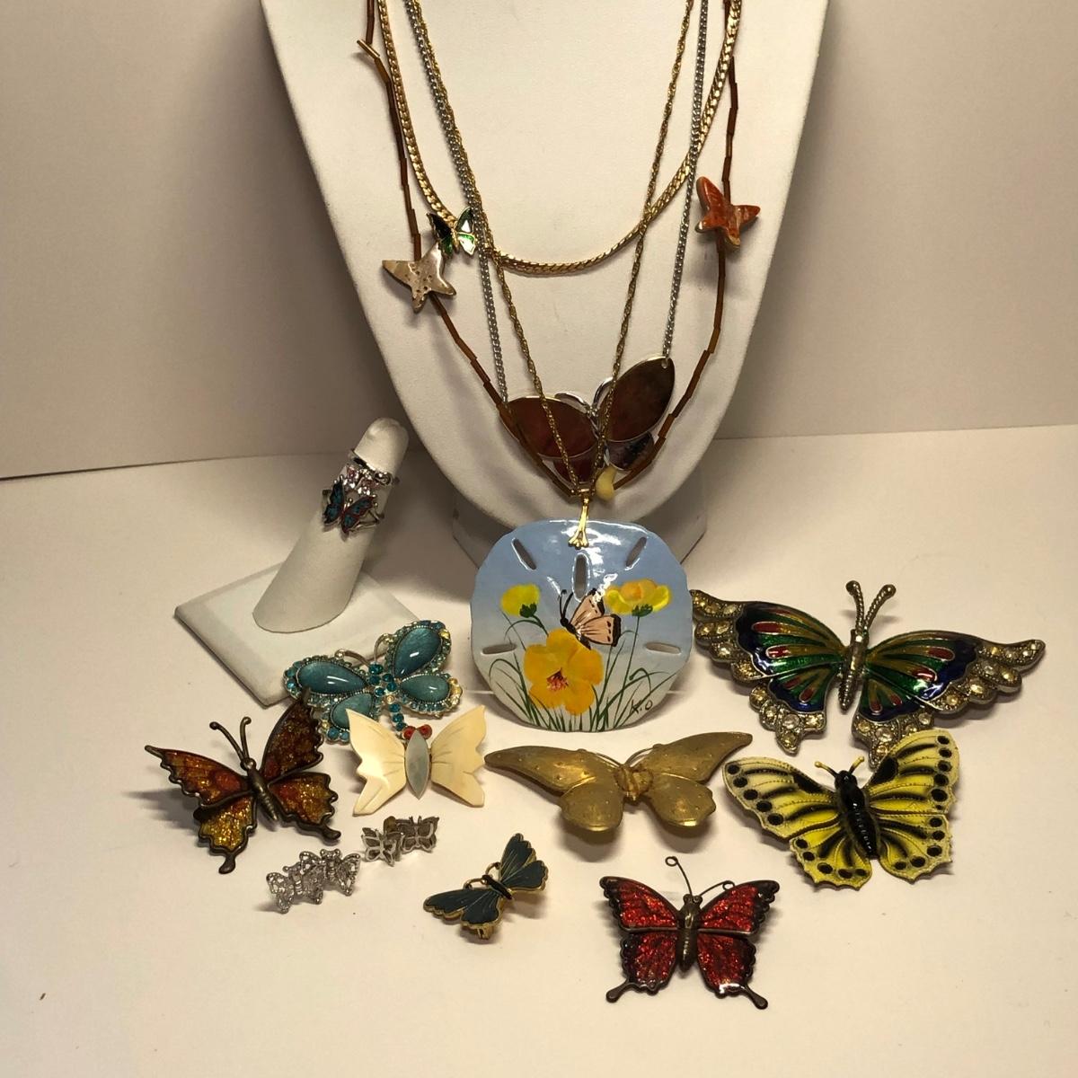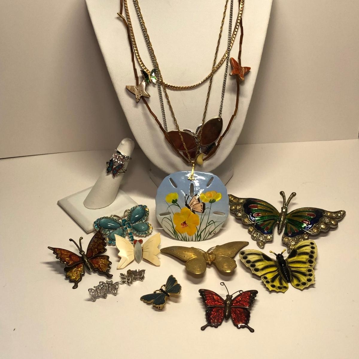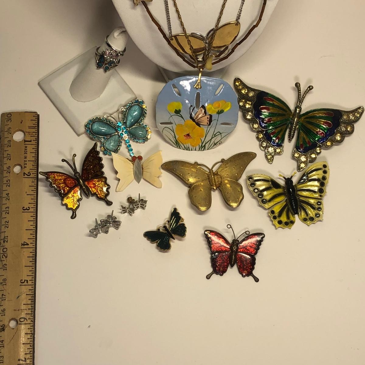 8 Butterfly pins, 3 butterfly necklaces, butterfly earrings and sterling toe ring.