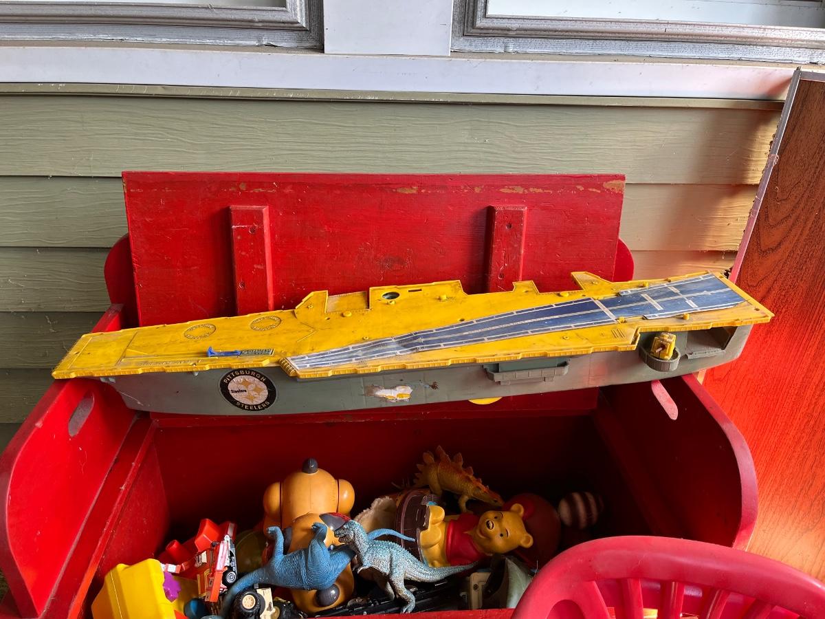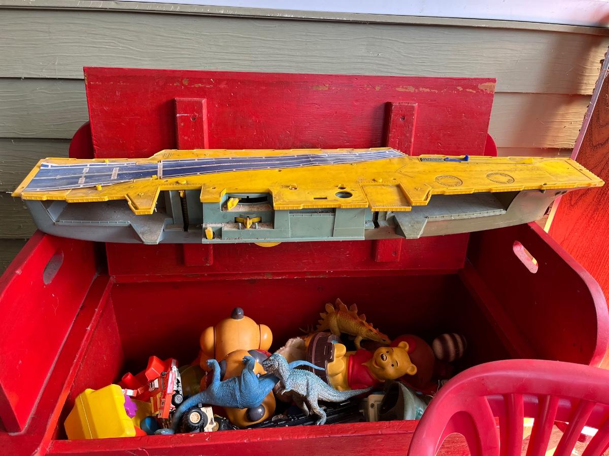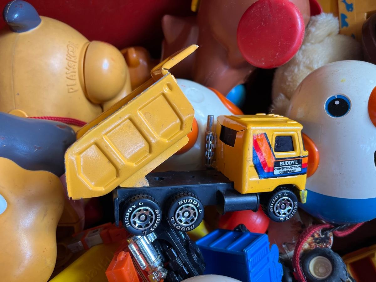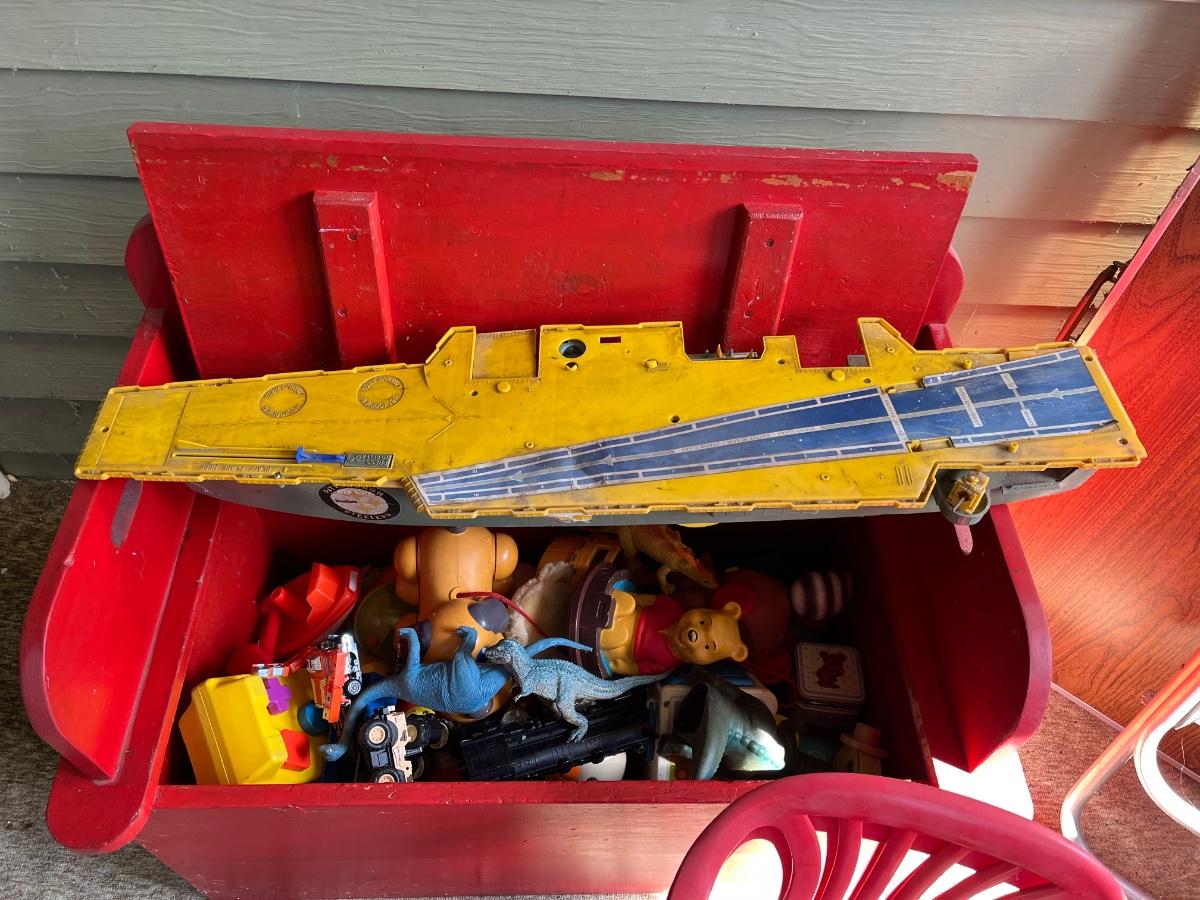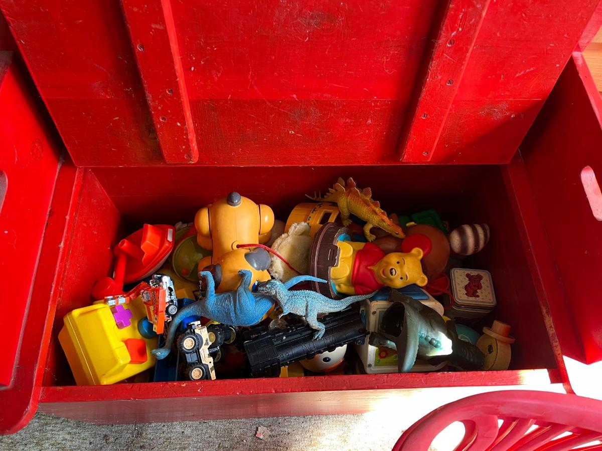 LOT 210P: Toy Box / Bench Full of Vintage Toys