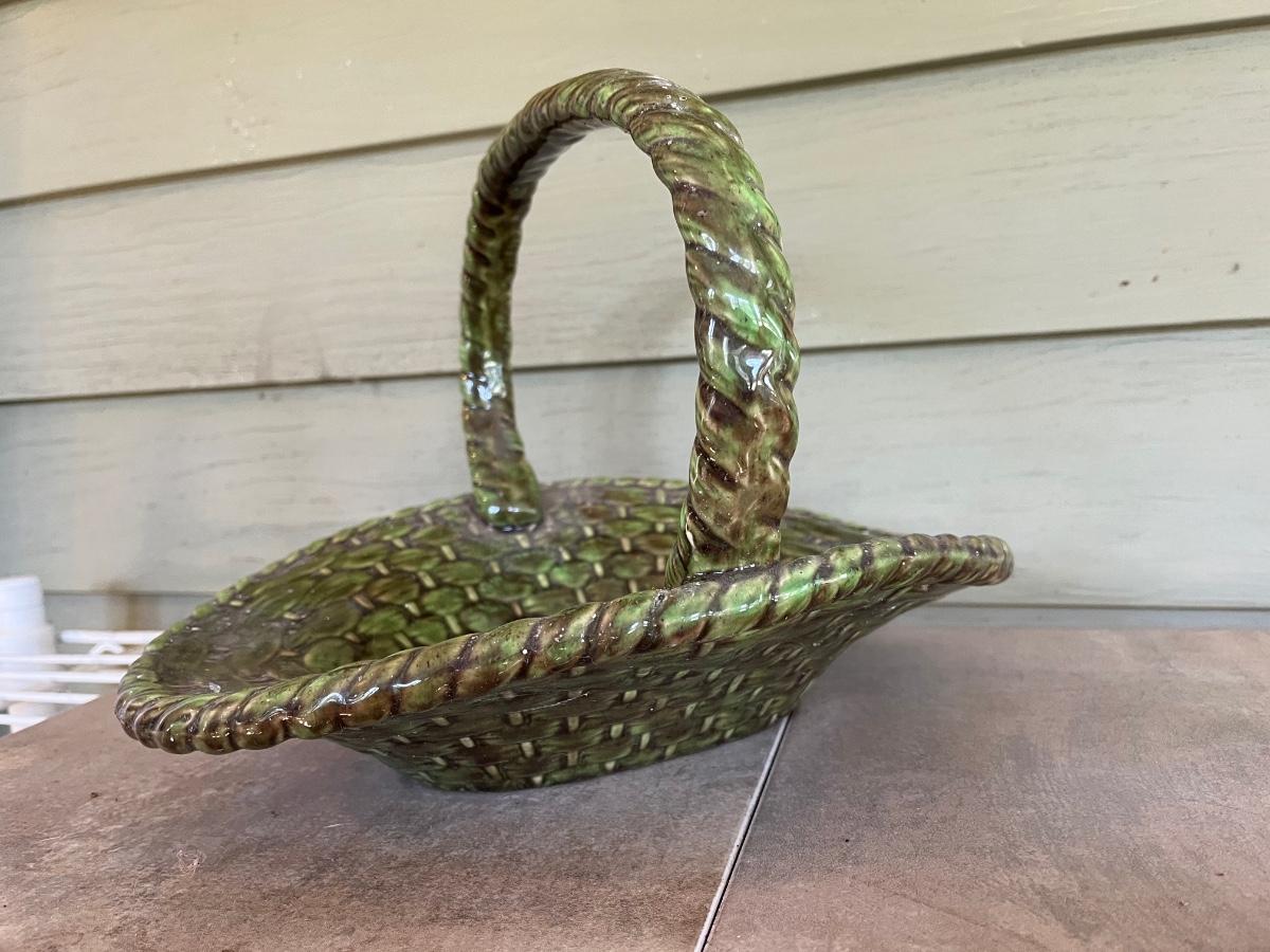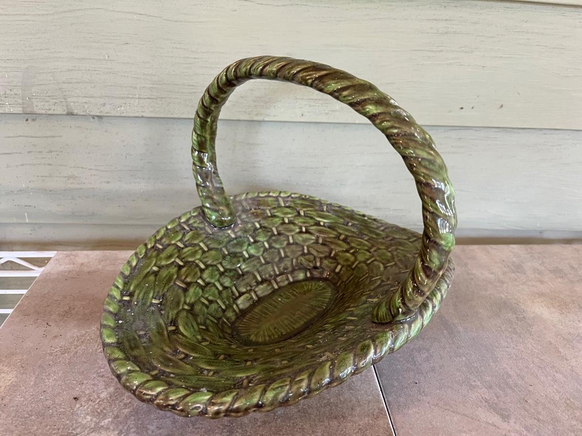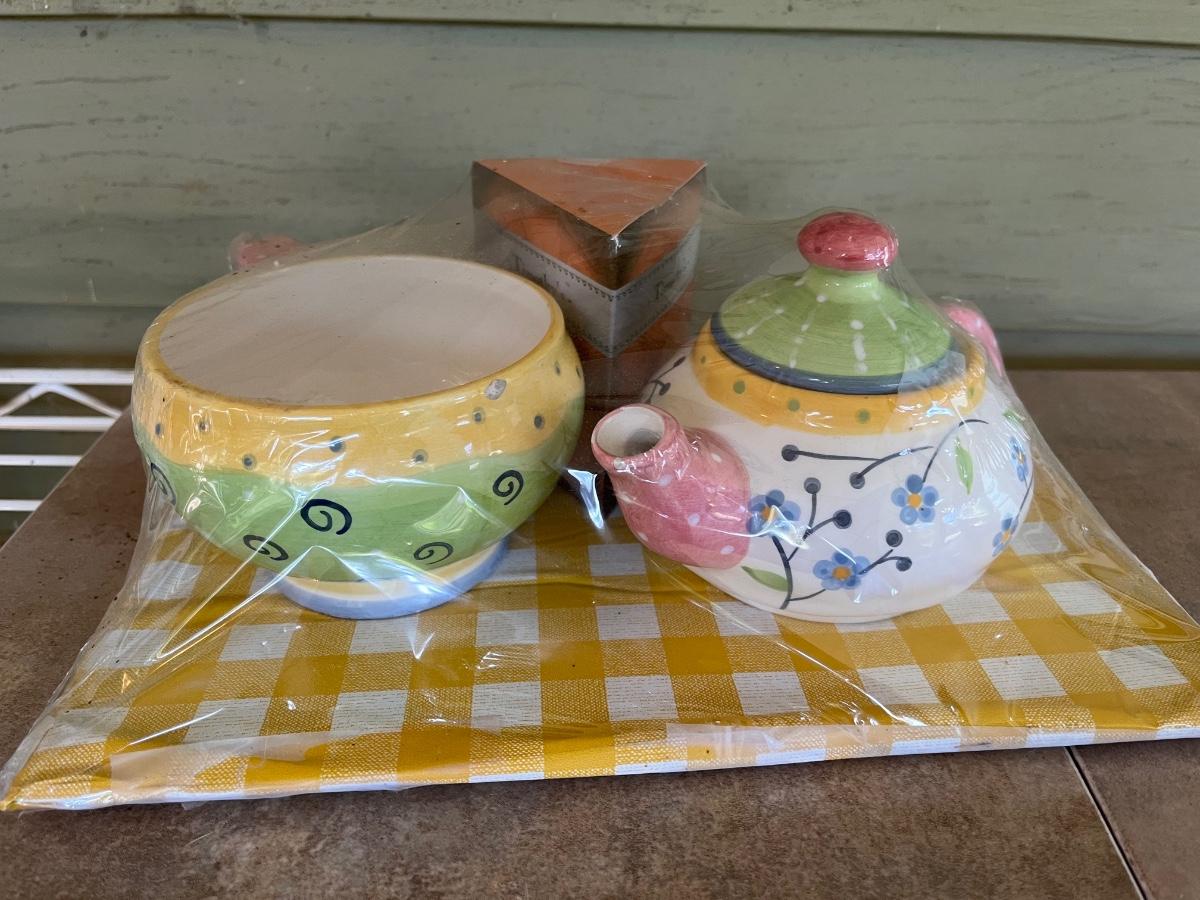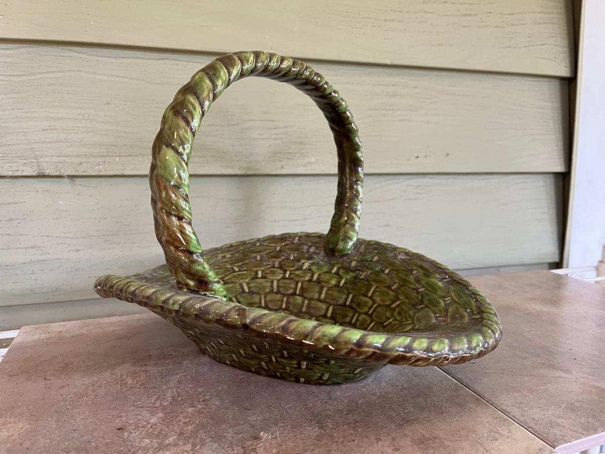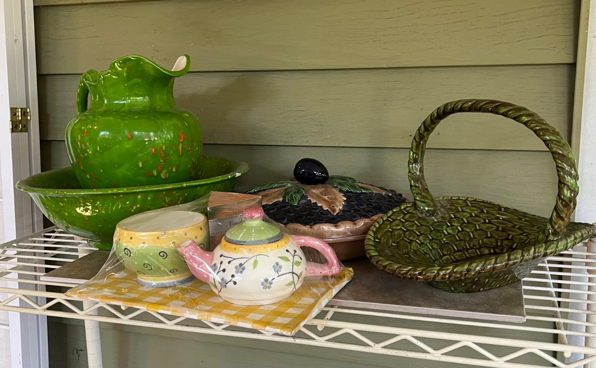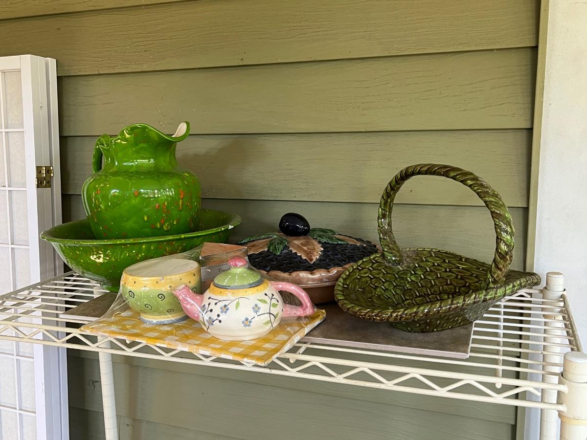LOT 216P: Ceramic Pieces - Large Basin and Pitcher, Covered Pie Dish, Basket, Sealed Tea Set