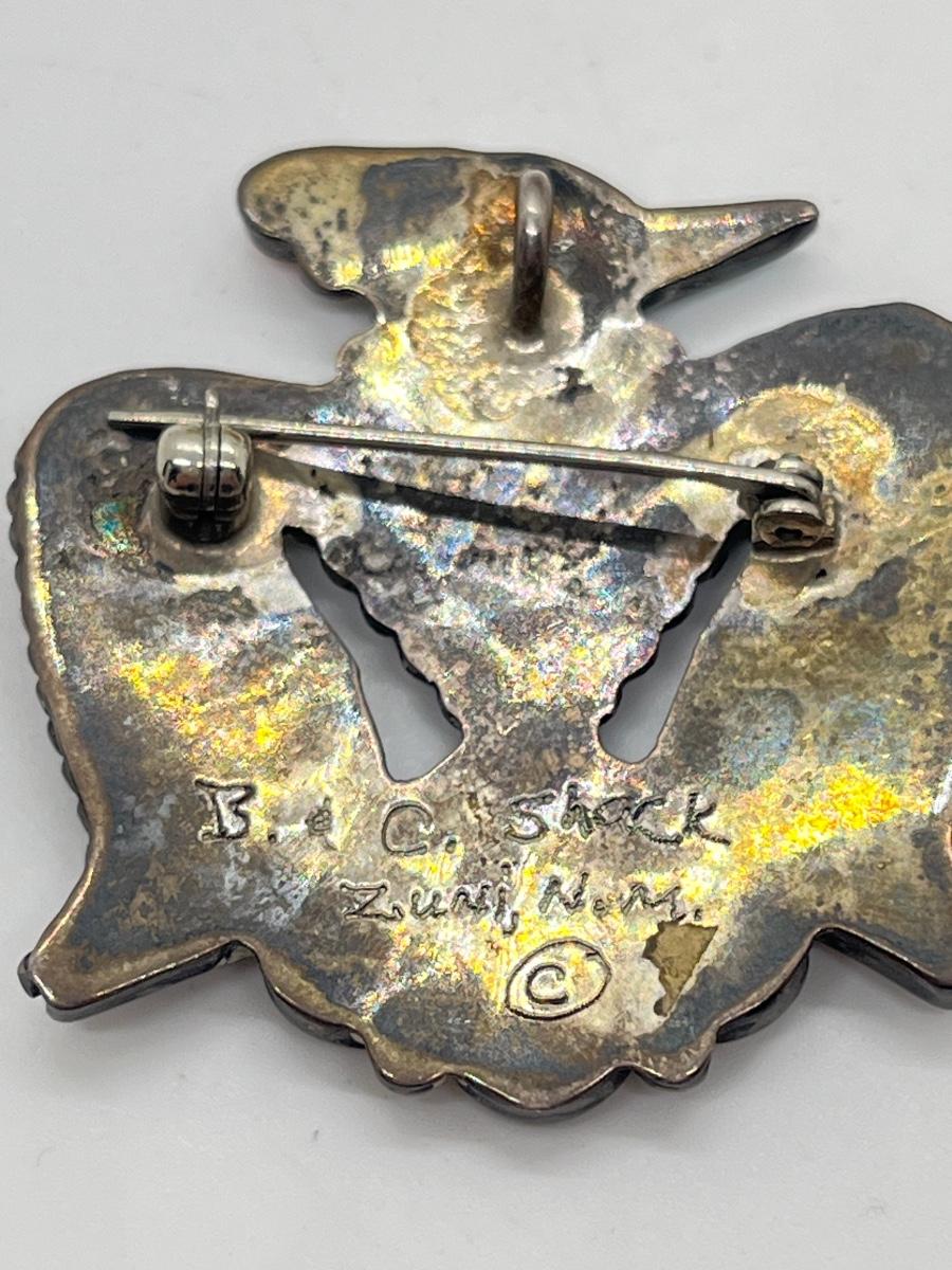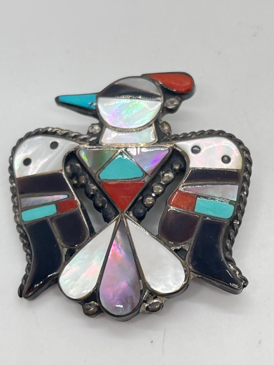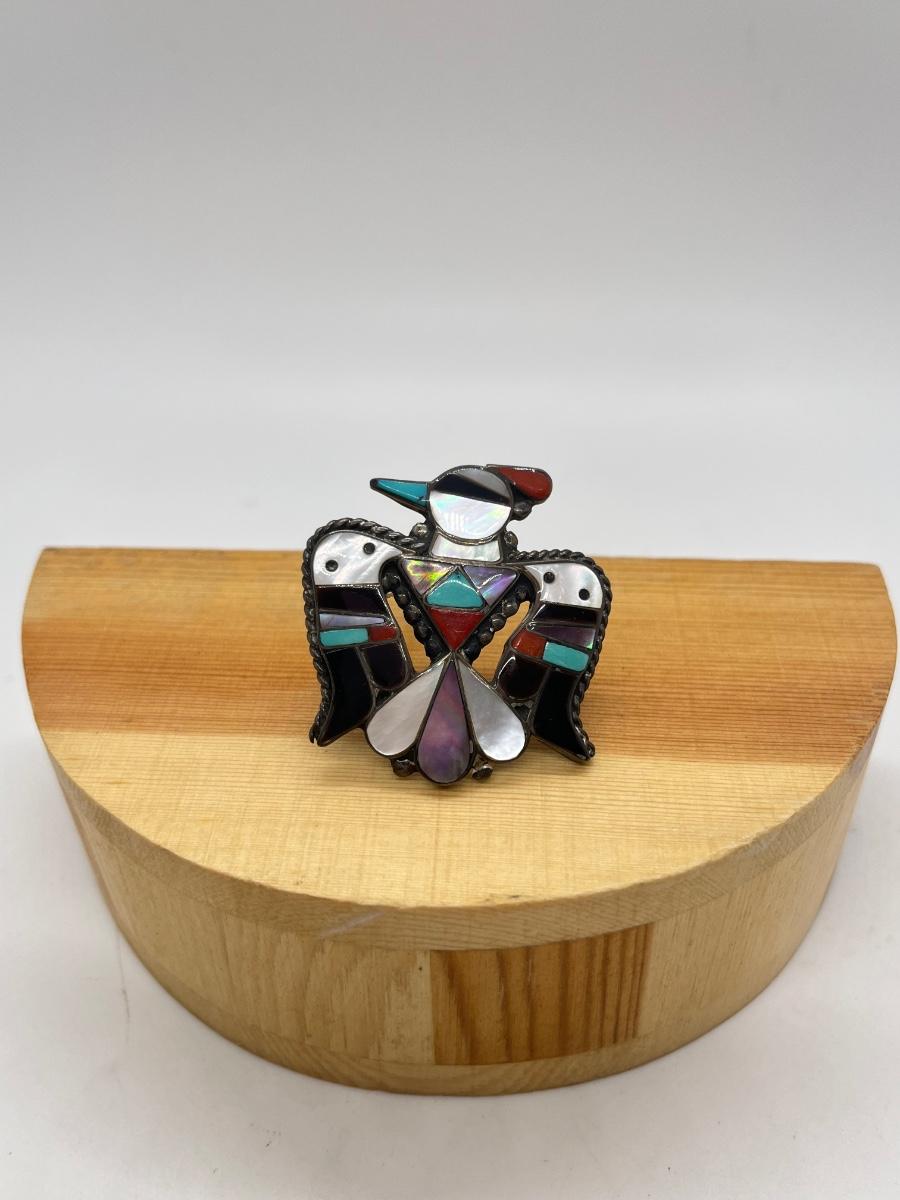 LOT 235J: Bobby and Corraine Shack Zuni Native American Thunderbird Brooch - Silver Inlay