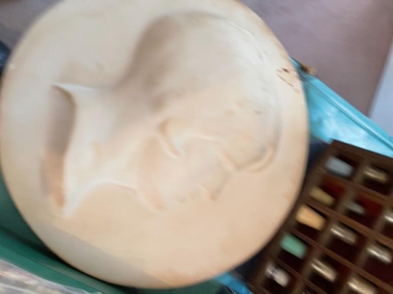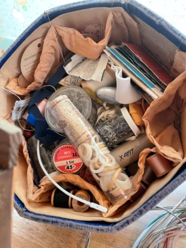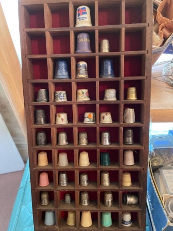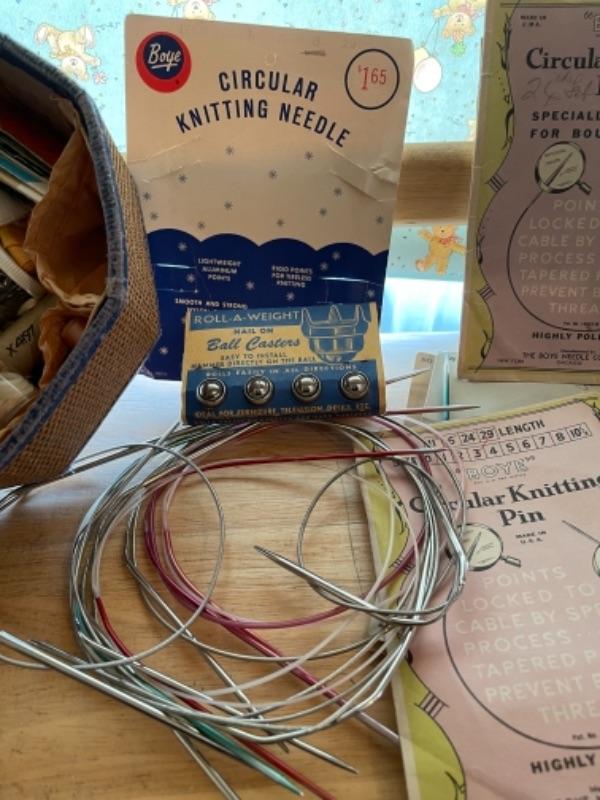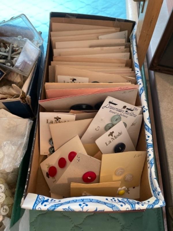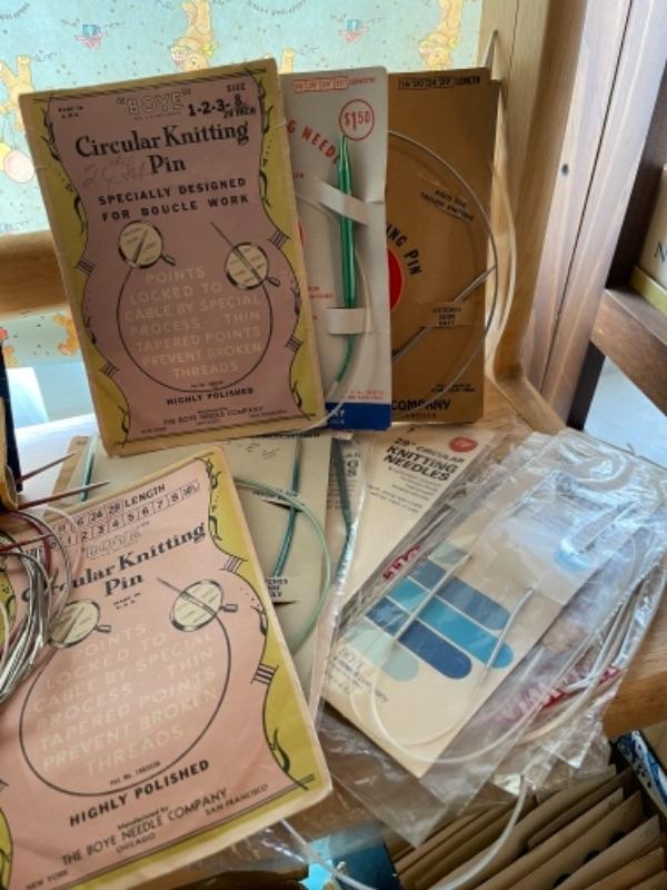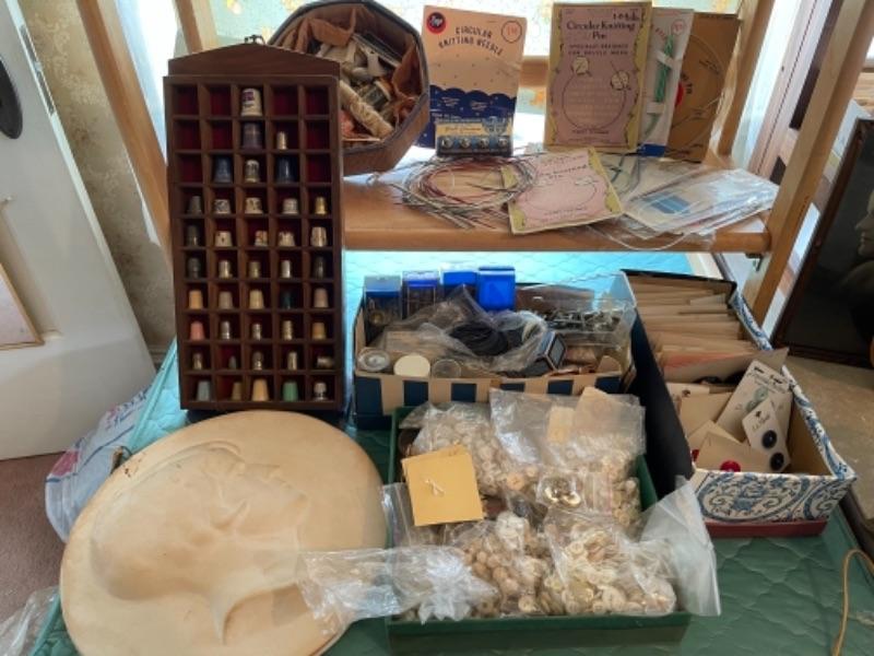 Lot 92B1. Large assortment of circular knitting needles (Boye), buttons on cards and loose, thimble collection, plaster profile, notions, etc.--$125