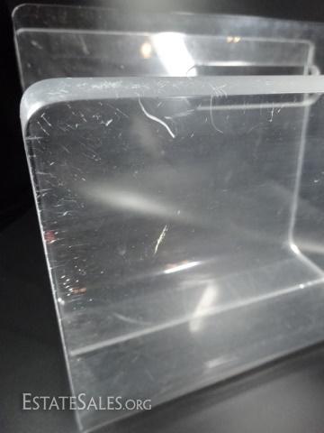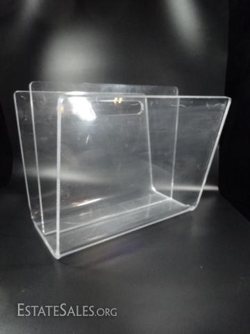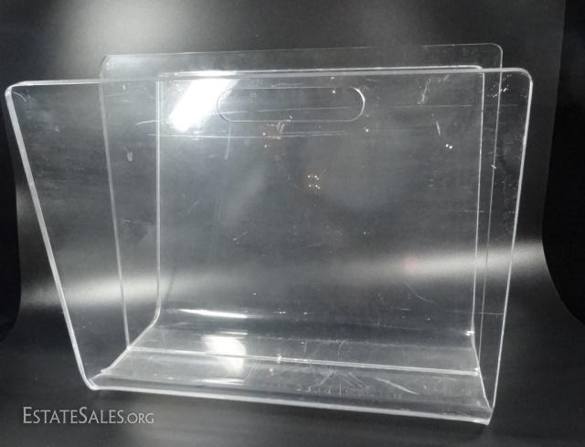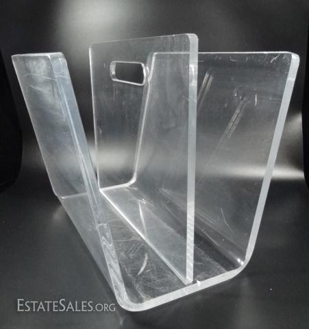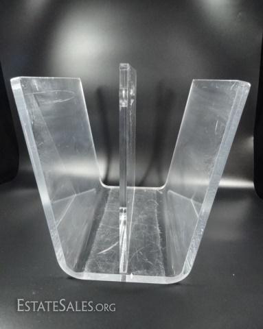 LOT 92D: LUCITE MAGAZINE RACK, MINOR SCRATCHES, APPROX 11" X 13" X 10.5"