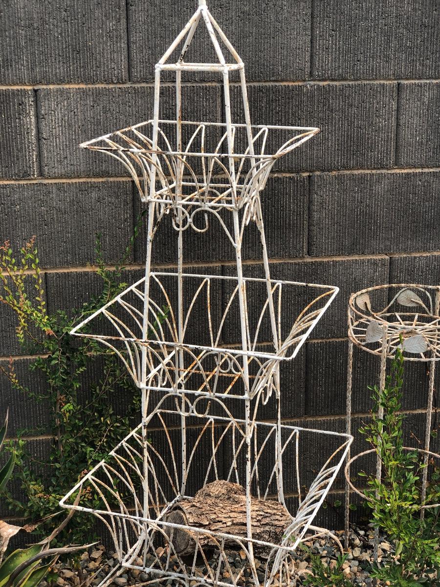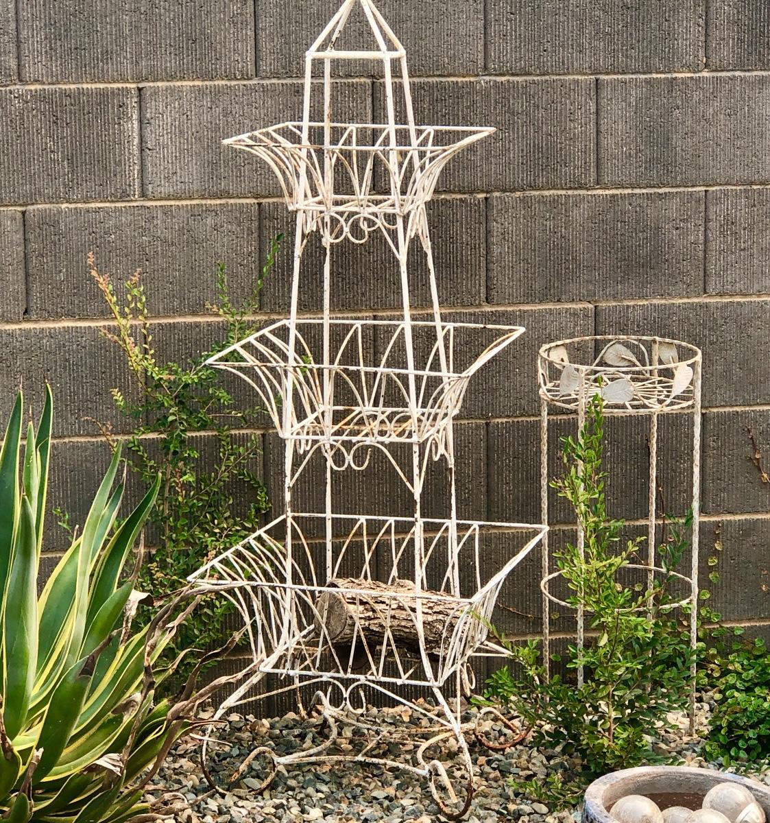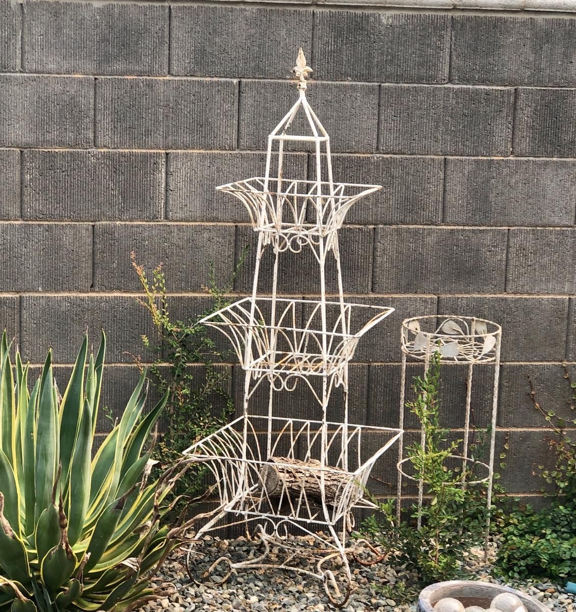 This wrought iron display piece features three tiers of square compartments: it would be neat for plants, or for a display fixture in a retail shop. A cottage white antiqued paint finish adds to the charm.