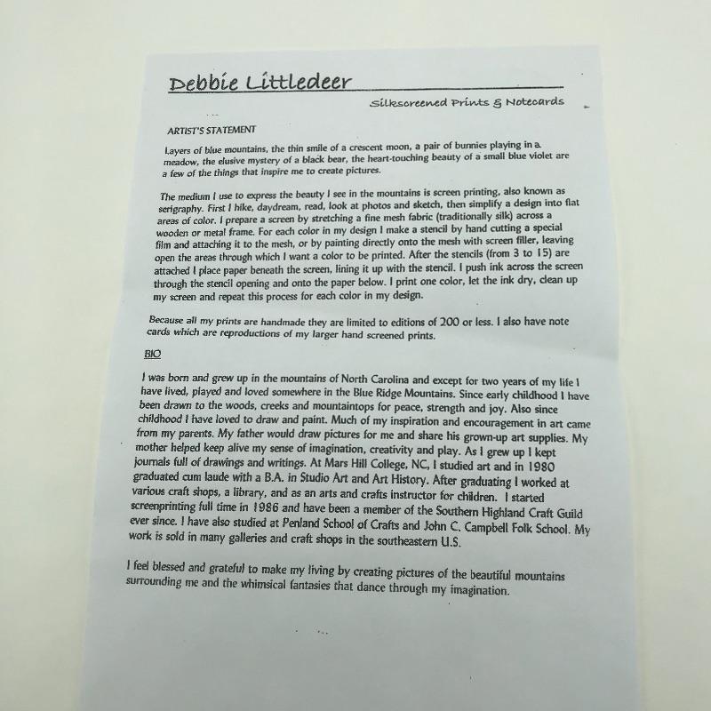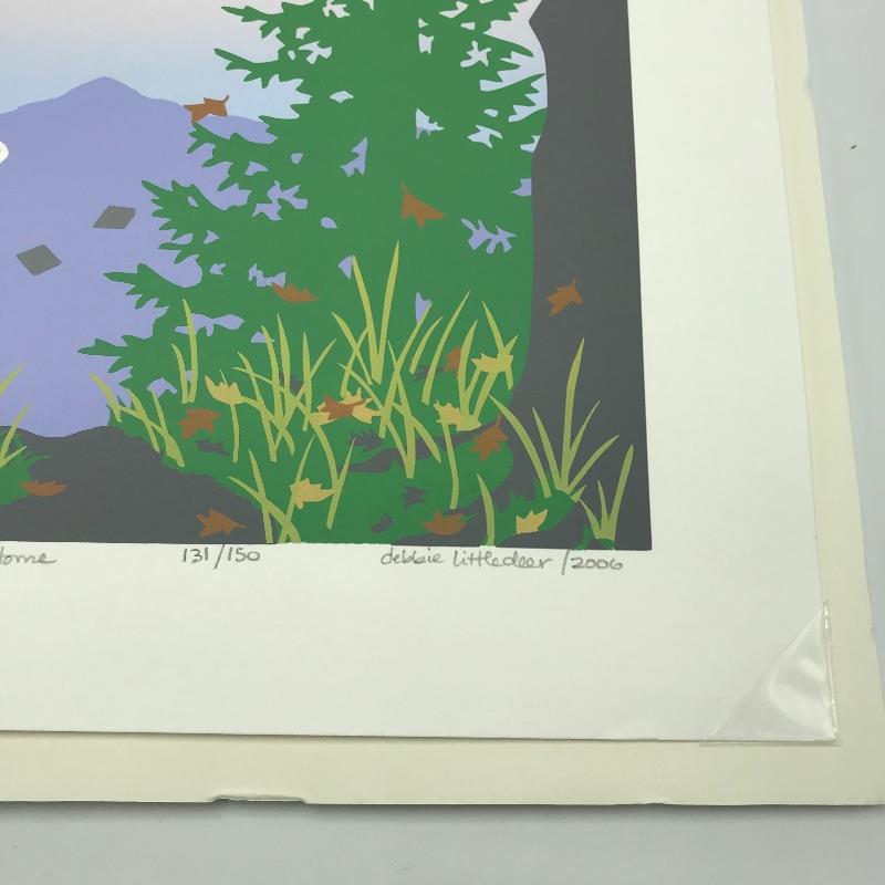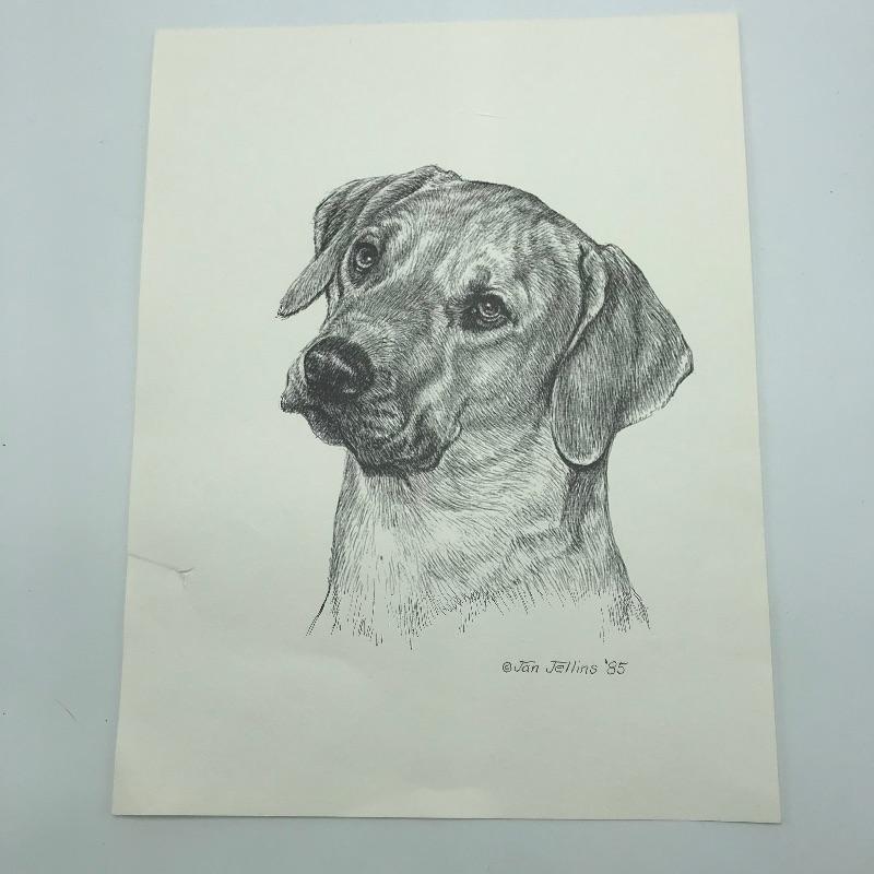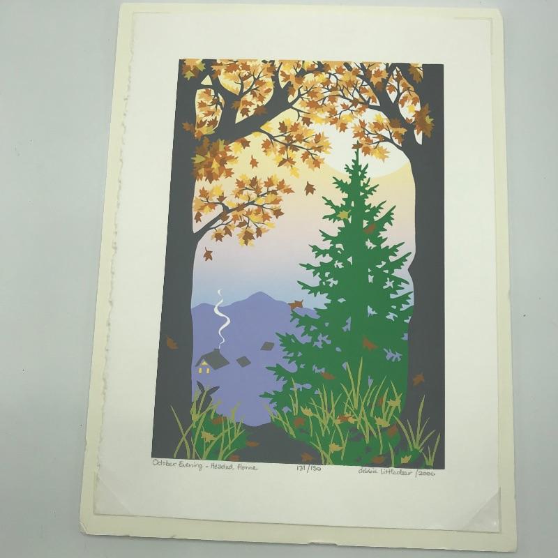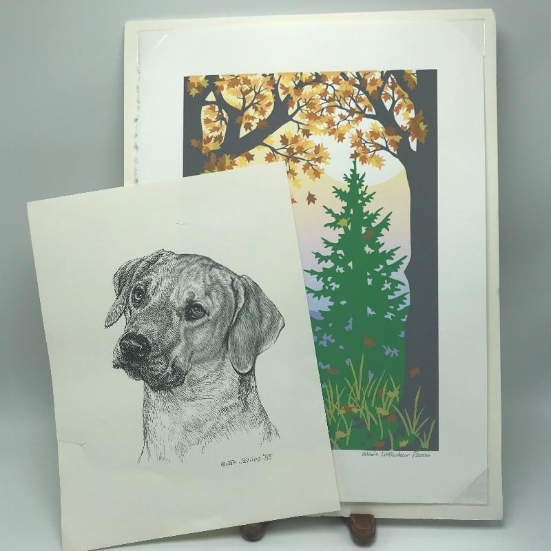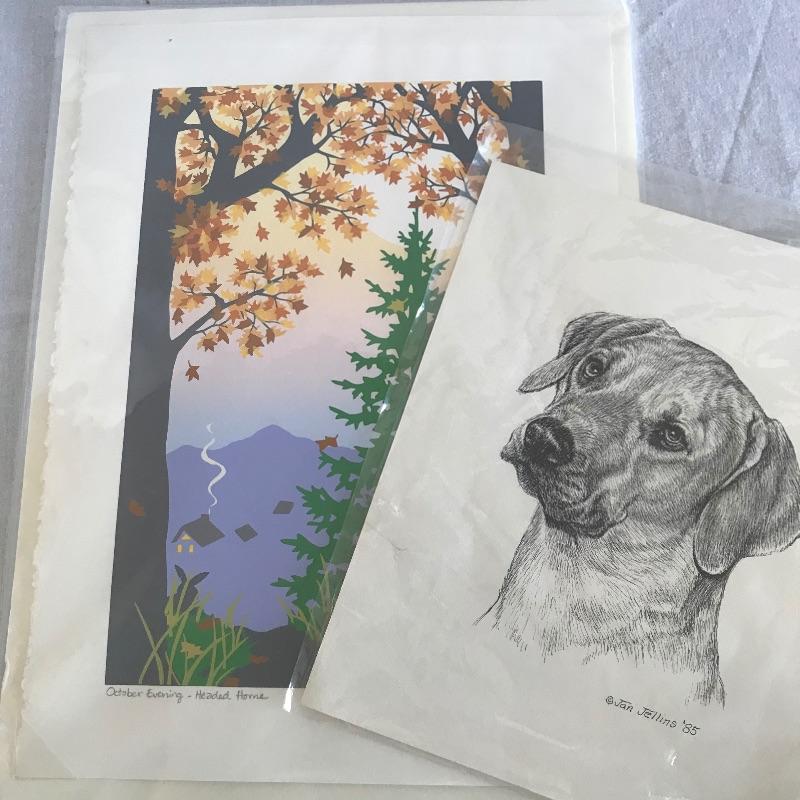 Lovely Arts & Crafts screen printing and ink and pen art ready for the frame of your choice! This lovely serigraphy art numbered 131/200 by Debbie Littledeer is named “October Evening-Headed Home”. This screen print is gently attached to firm backing and has been stored in plastic, it’s ready to be placed inside the frame of your choice and displayed proudly on your wall! Art measures 11” x 15”, (12” x 16” with backing). There is a nice description of serigraphy and a bio of Littledeer on the backside of the art. Lot also features human’s best friend ink and pen art by Jan Jellins. Jellins captures the essence of our best friend with such a complex simplicity! This page has an indentation in the paper on the lower left side noted in photos. This art has also been stored in plastic and is ready for your frame! See photos.