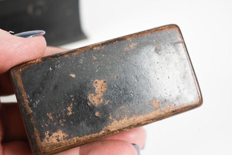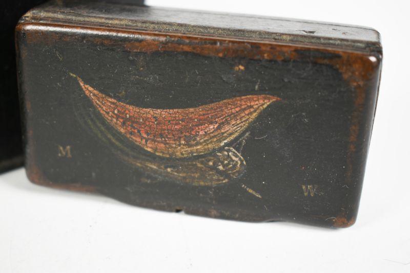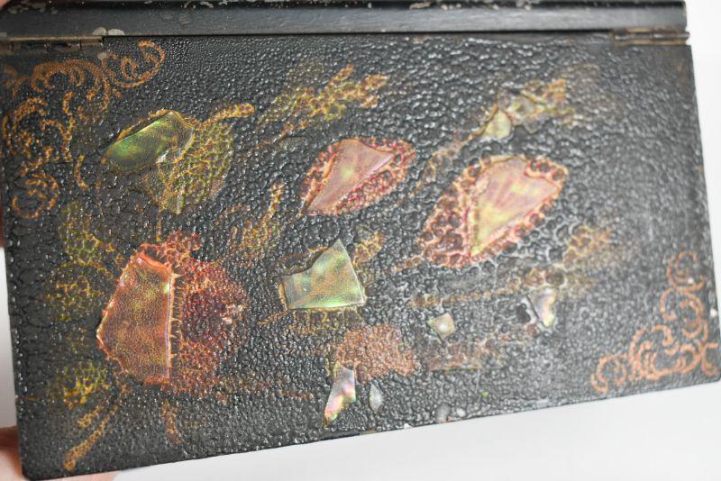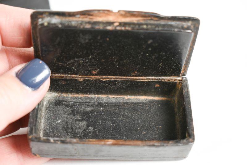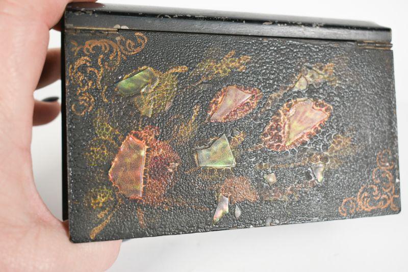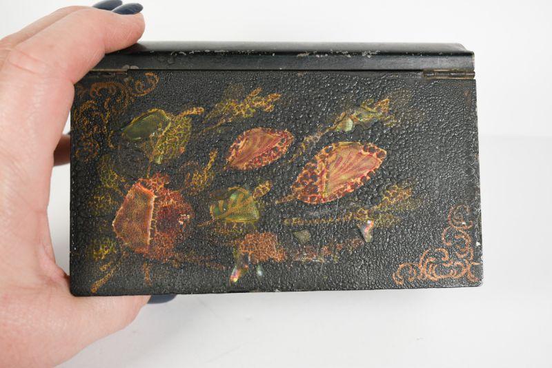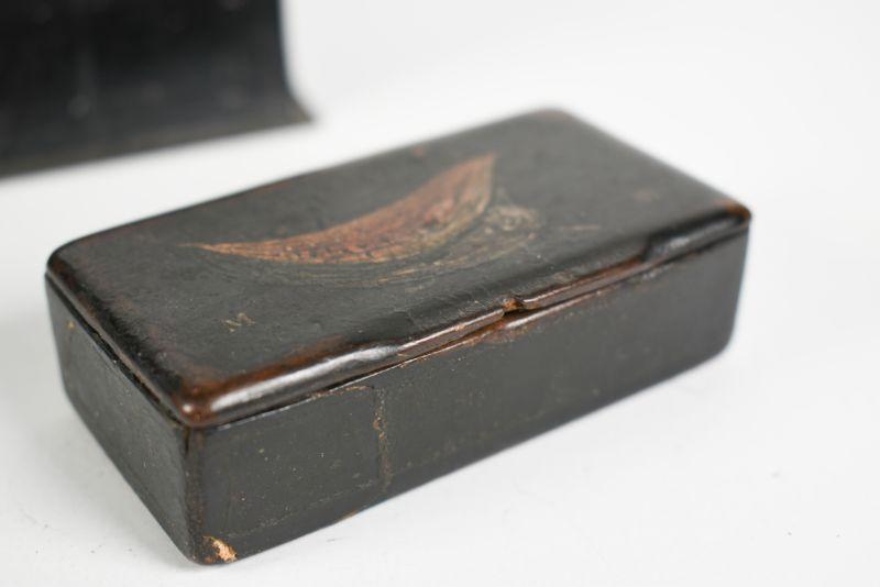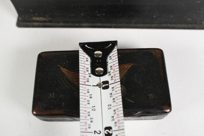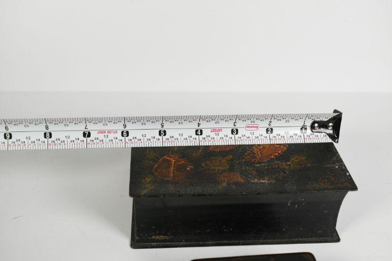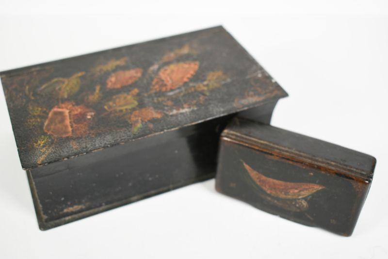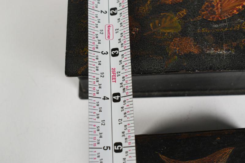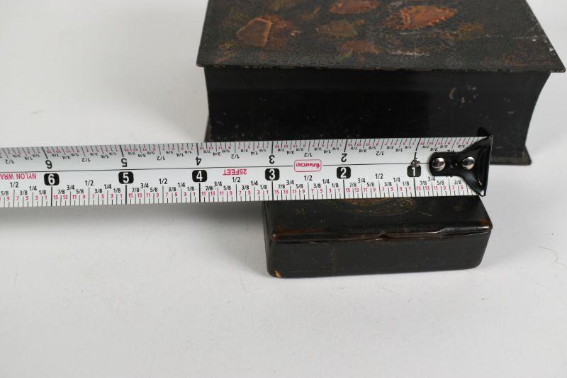 Lid lifts on both boxes to reveal area inside for storage. Large box: 5 7/8"x3.5". Small box: 3 1/8"x1 3/4". Both are lacquered and showing signs of thier age. **Please read Terms and Conditions before placing a bid. Pick up is Sunday, December 22 from 11am to 3pm or Monday, December 23 from 4pm-7pm in Mantua, NJ. All sales are final. All sales are as is, where is. Please review all photos. Props are not included. Measurements are approximate.