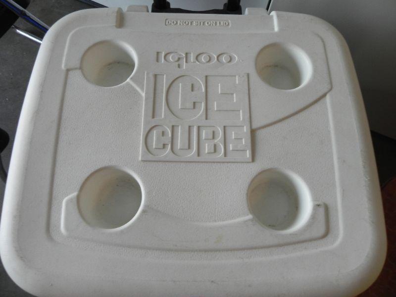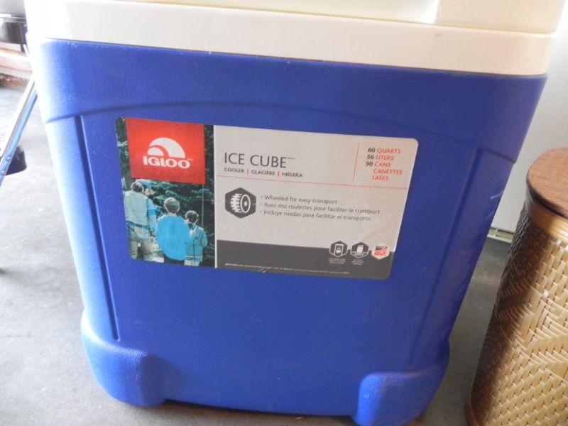 60 QUART COOLER ON CASTERS WITH PULL HANDLE AND CUP HOLDERS IN LID, WOOD BASKET WITH LOTS OF STORAGE SPACE INSIDE.