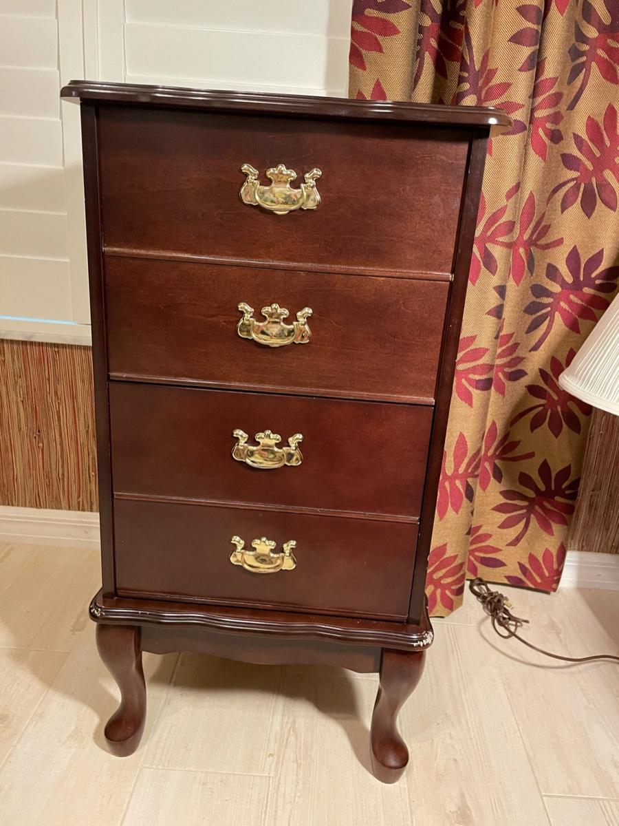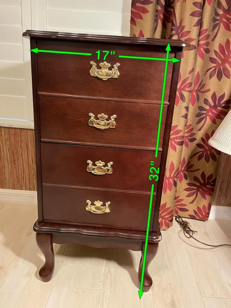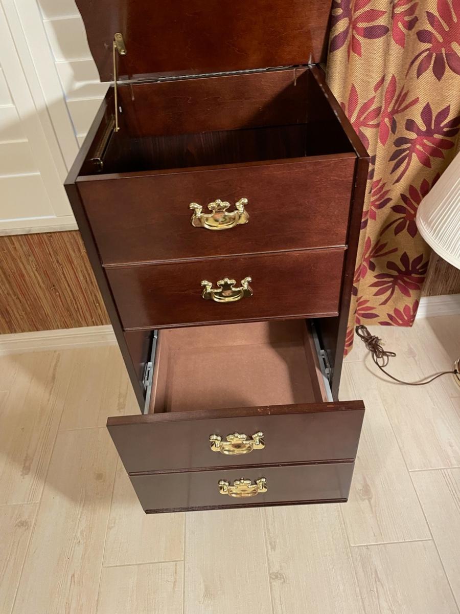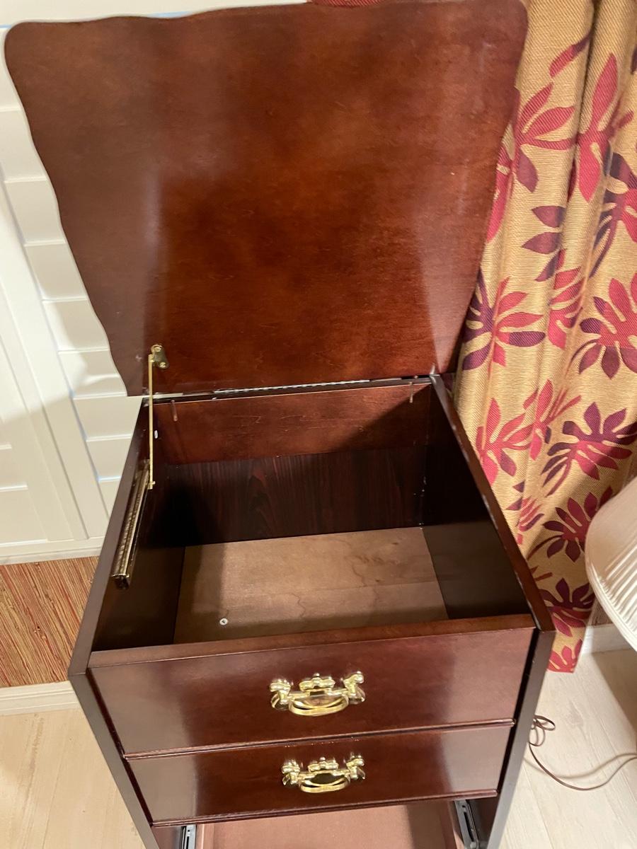 Queen Anne style wood cabinet has storage compartment on top and file drawer on the bottom.