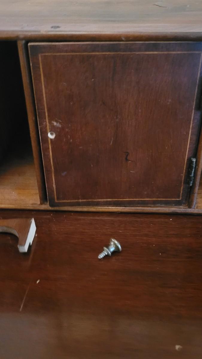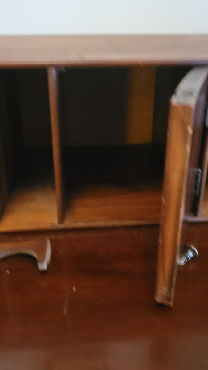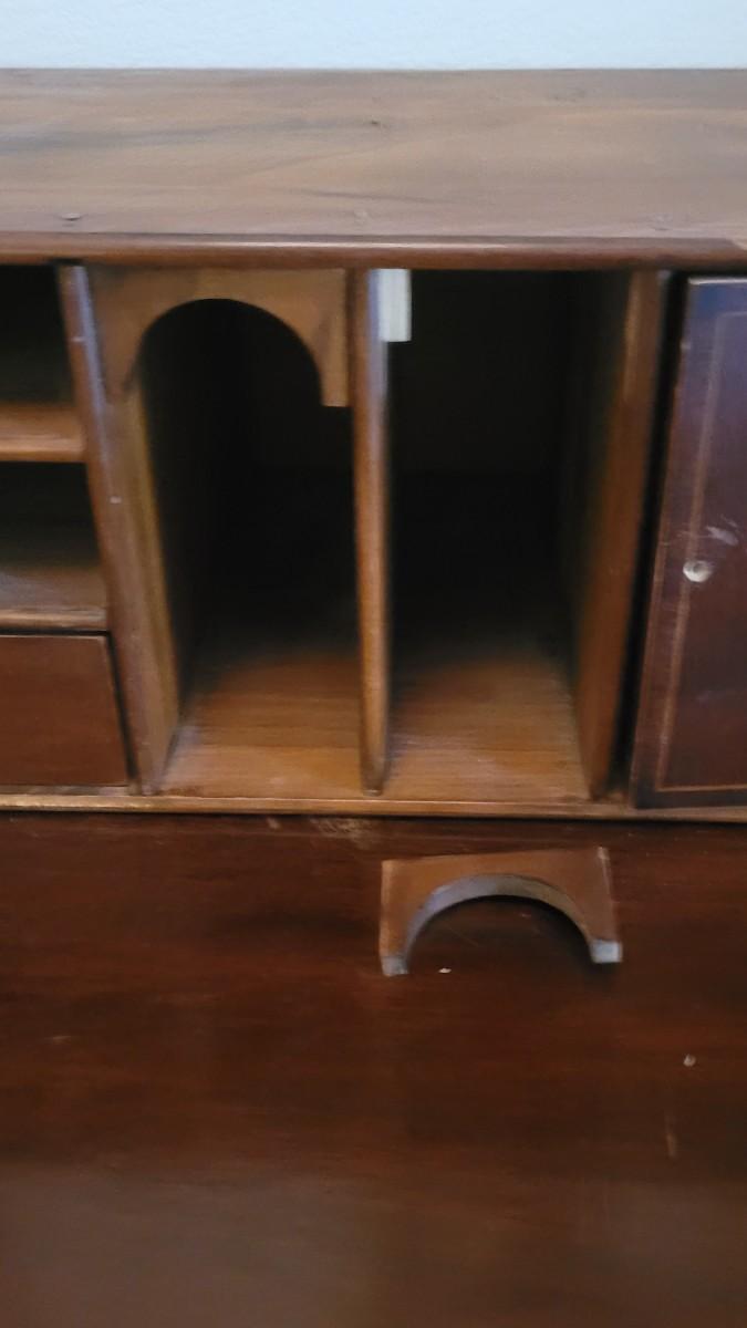 Has a piece that has broken off but can be repaired. The pull know on the door section also needs repair.