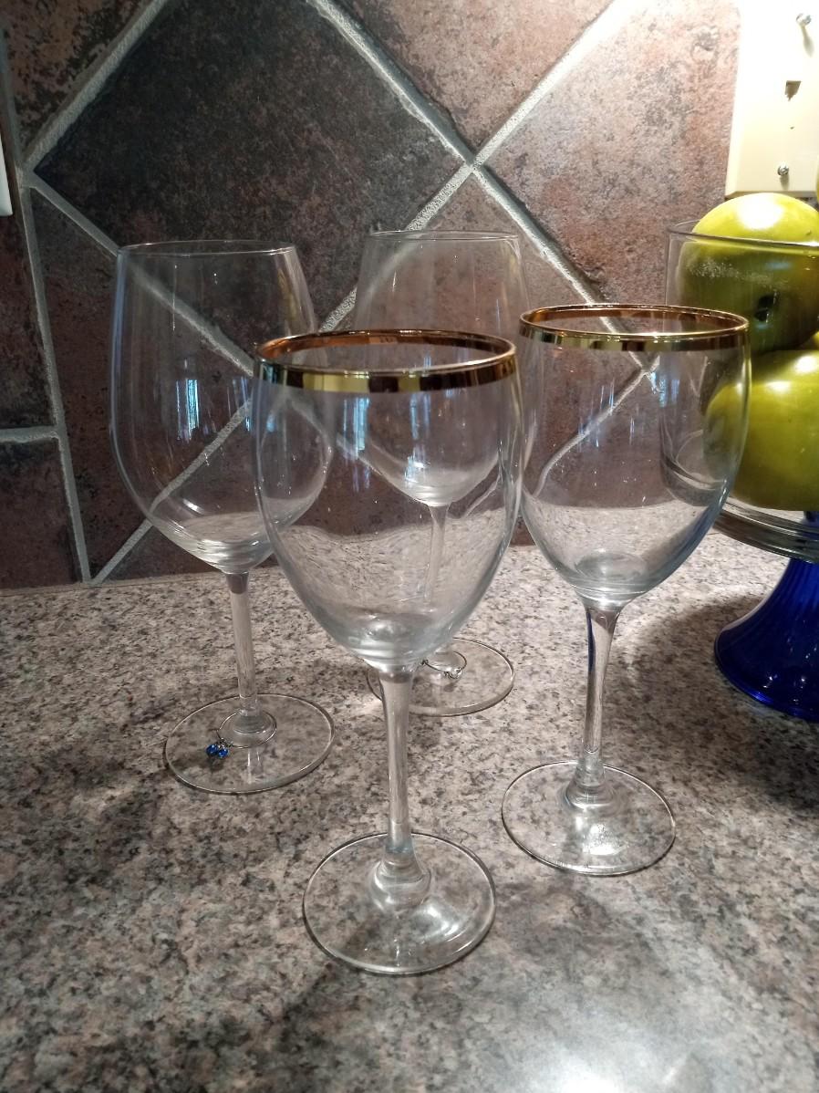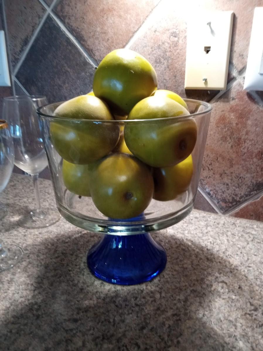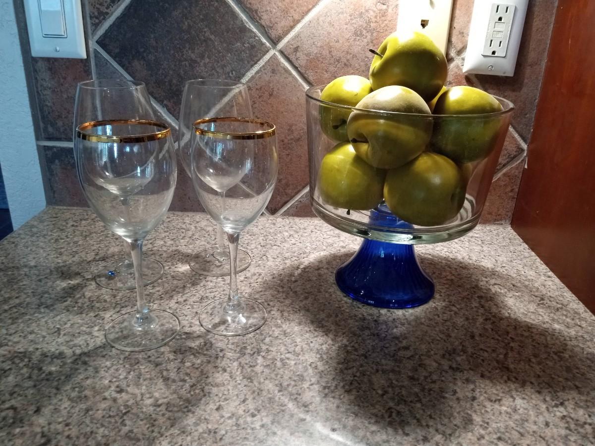 LOT 93 GLASS DISPLAY BOWL ON A BLUE PEDESTAL, FAUX FRUIT AND STEMMED GLASSES (HU)