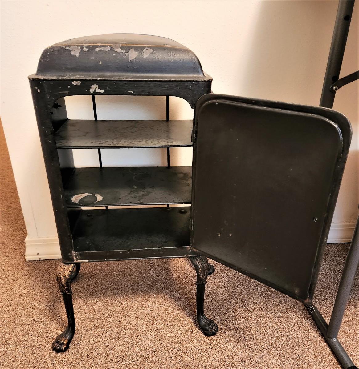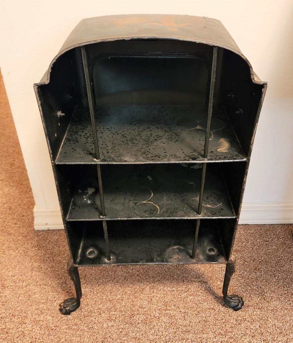 Check out this antique food warmer, designed to stand in front of the fireplace and keep your food warm until it was time to be served - door on front, open back to face fire source. 3 Shelves. 28" tall, 10" deep, 13.5" across - handles on each side. Painted decoration on front, sides, and top. Antique condition.