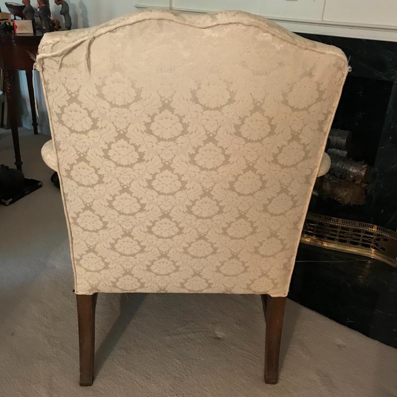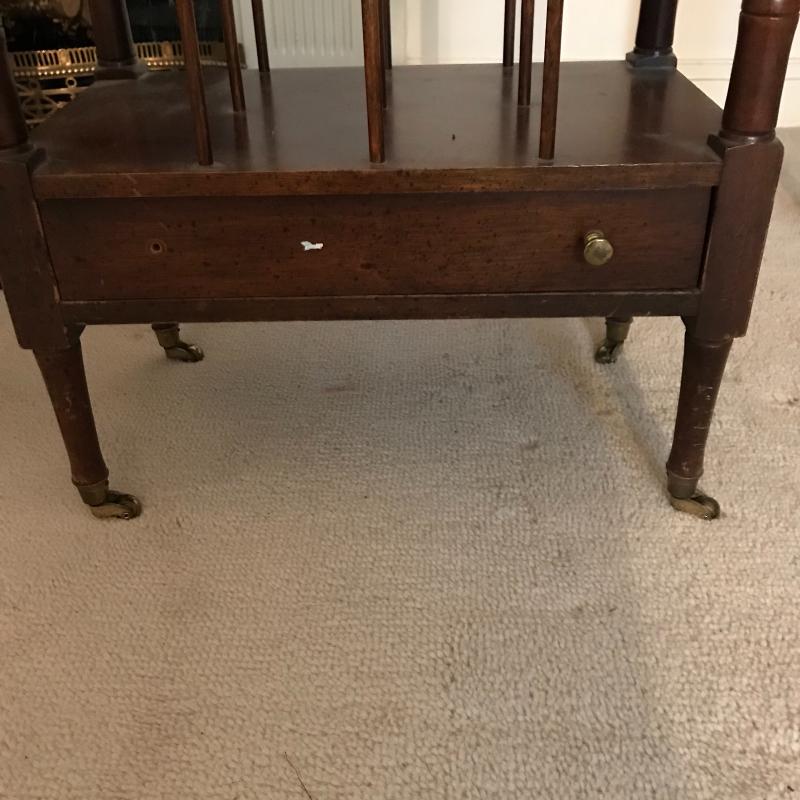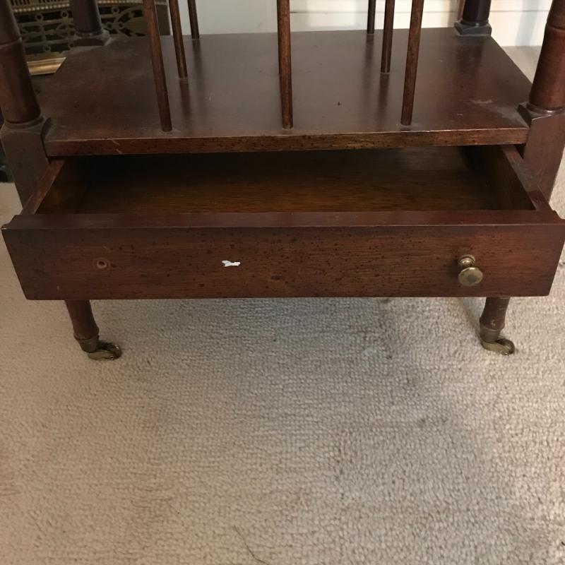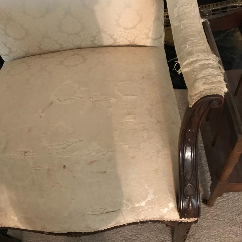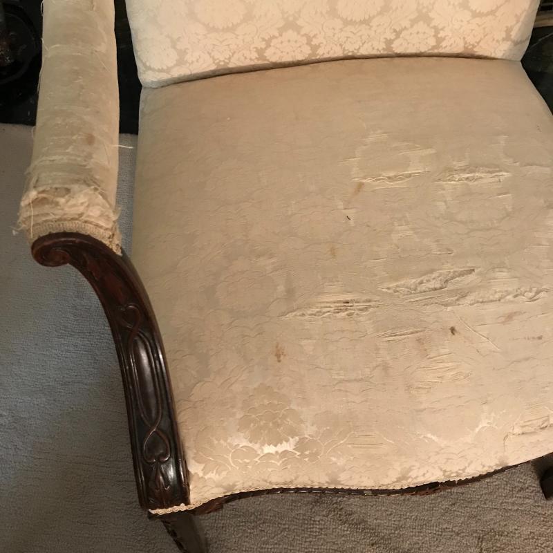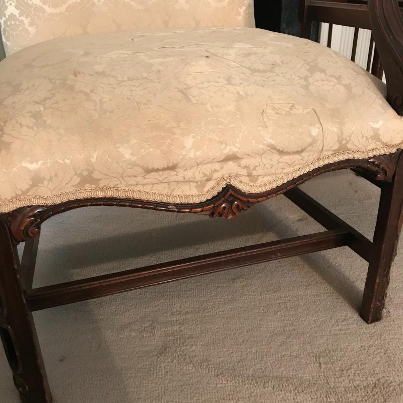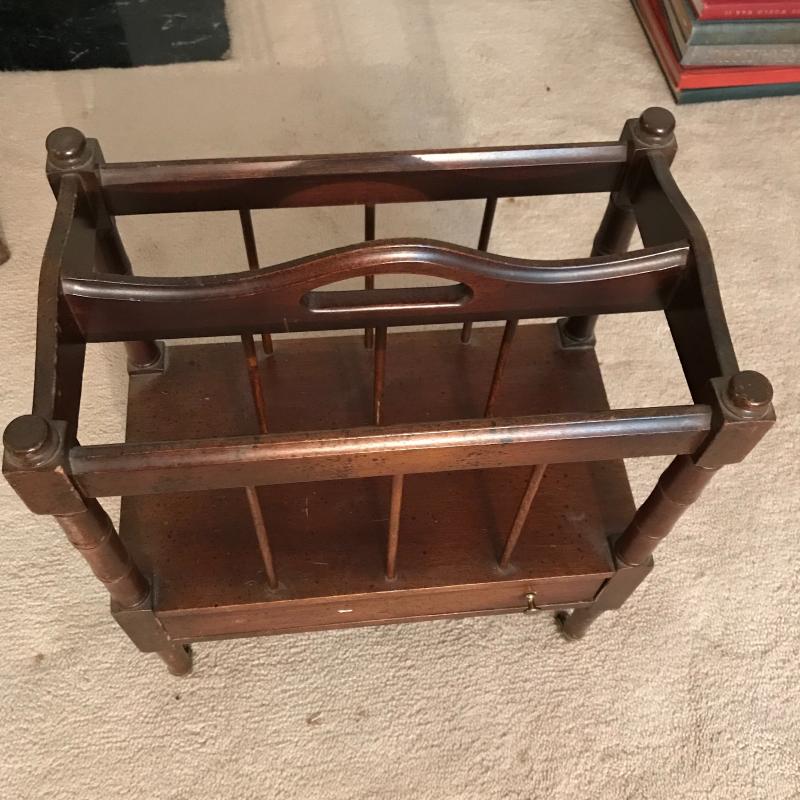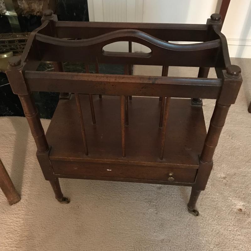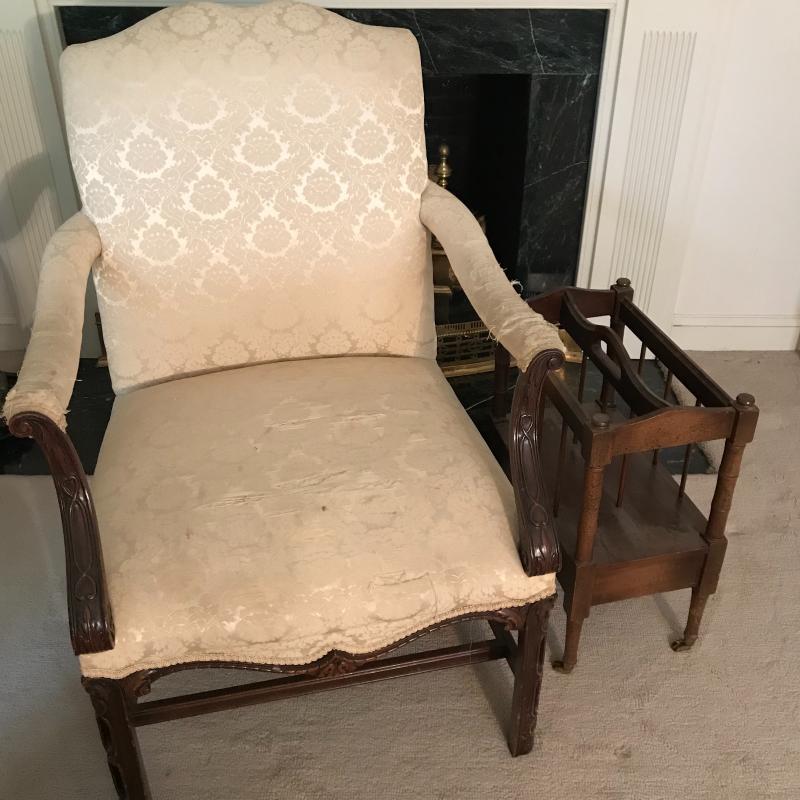 Lot includes a gorgeous collection of furniture. The ivory and dark wood chair has amazingly sculpted arms and legs. The cushion and fabric need fixing, but the bones are in great condition. Chair measures approx. 27x26x38”. Also included in lot is an magazine rack in great shape and on four casters. A couple of scratches and a missing drawer handle could be easily remedied. No shipping.
