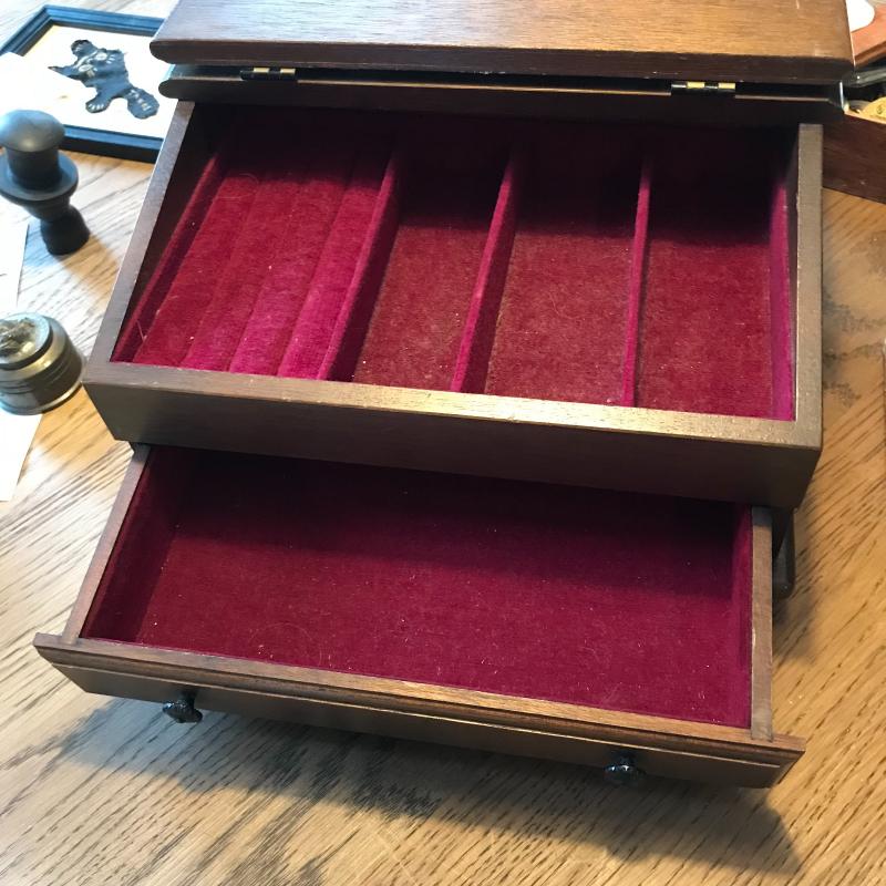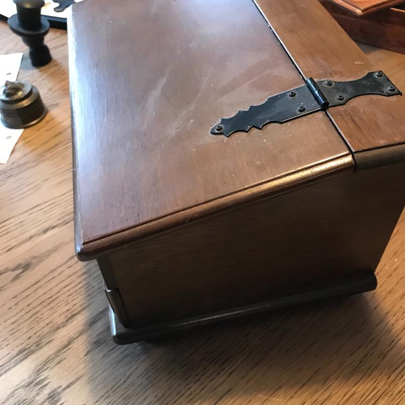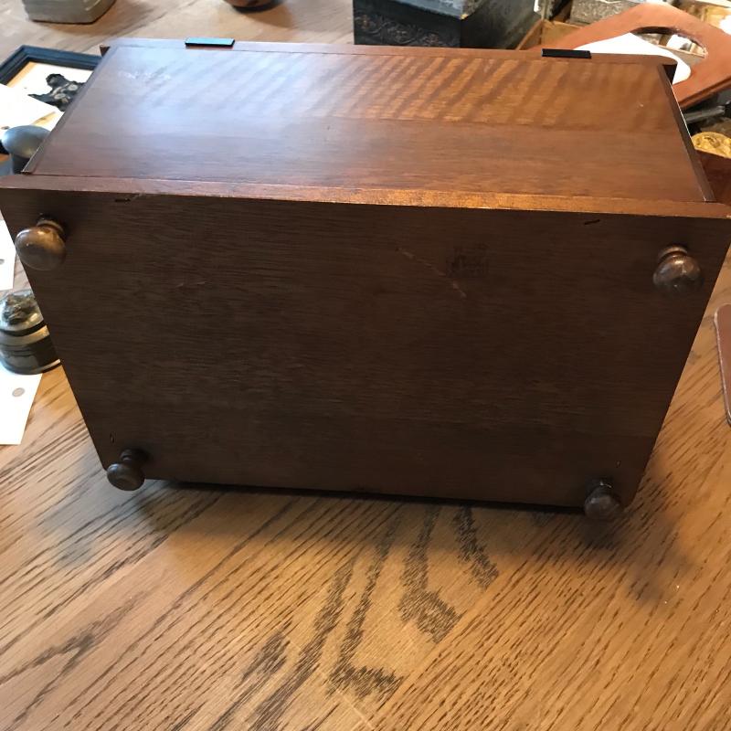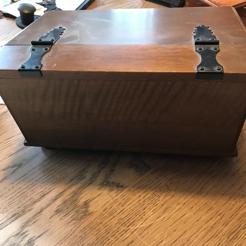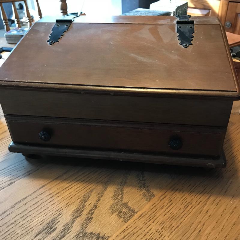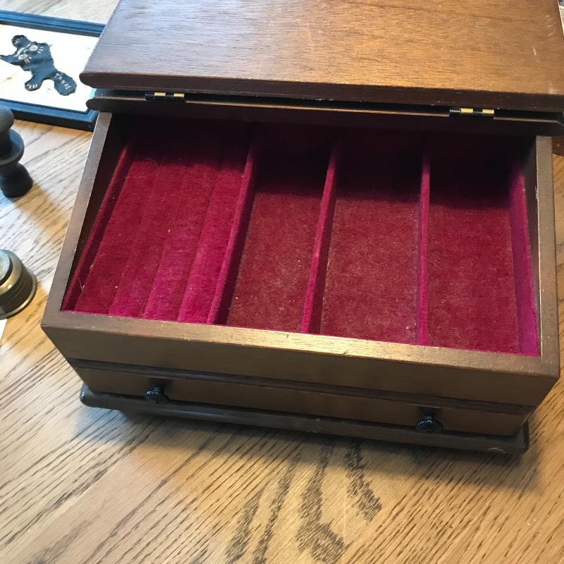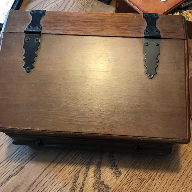 This jewelry box has some light scuffs but is sturdy and in good shape. Approx. 11.5”l x 8”w x 6”h. Shipping available or local pickup in Flat Rock, NC.