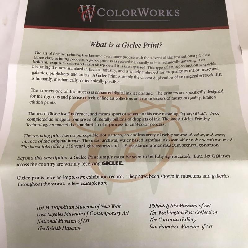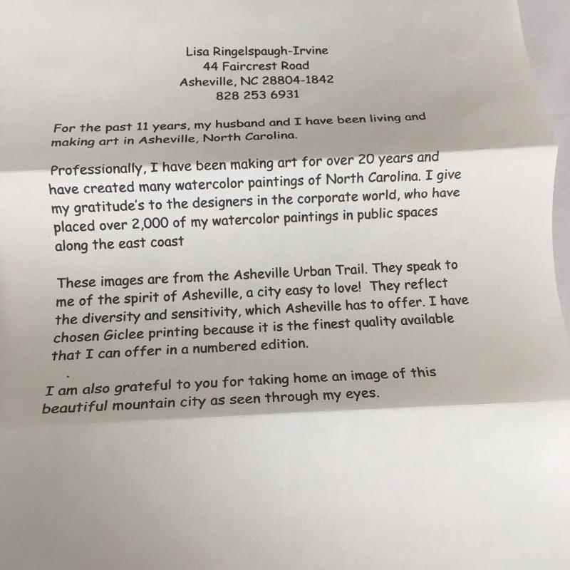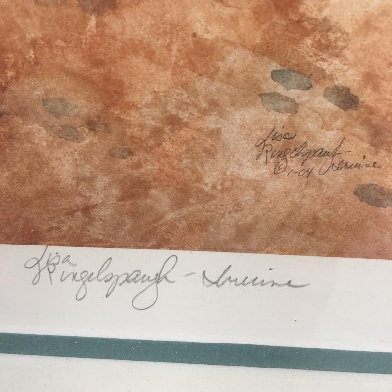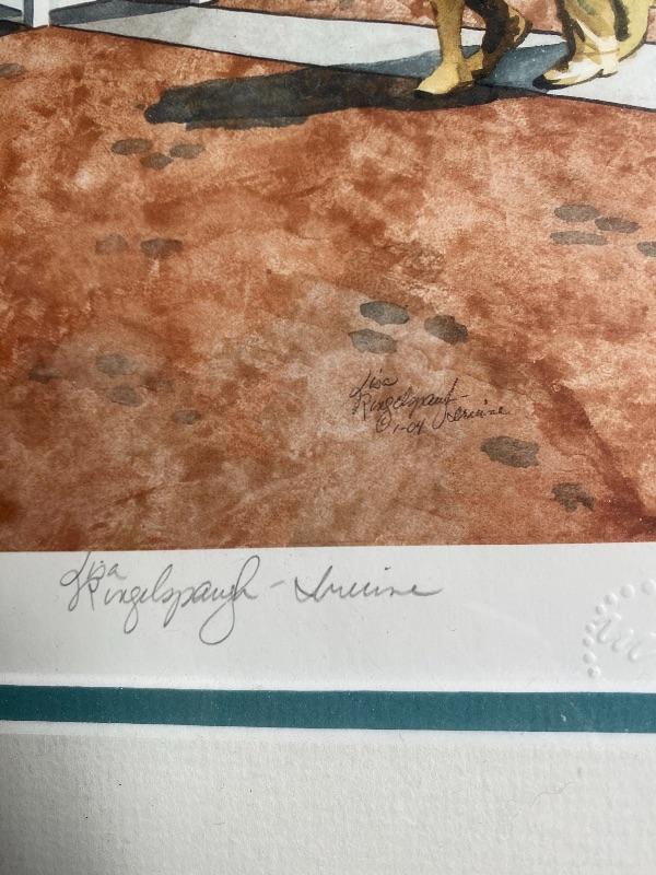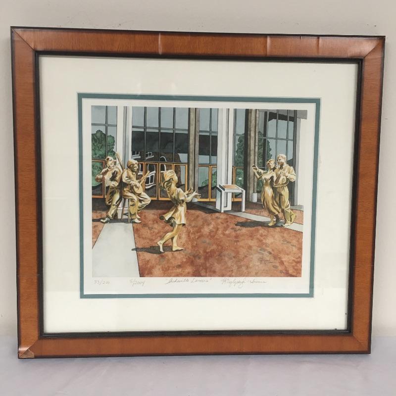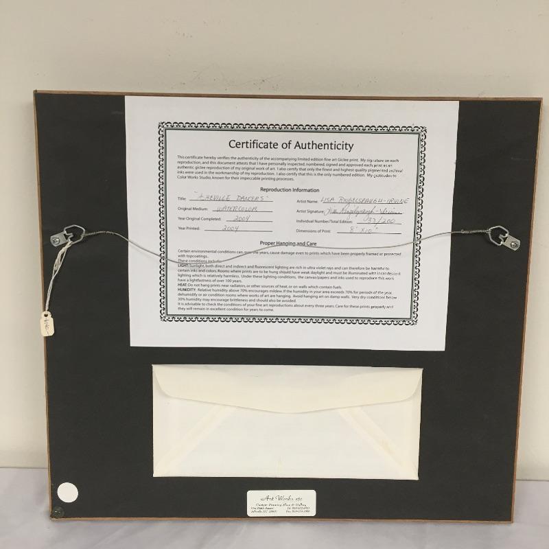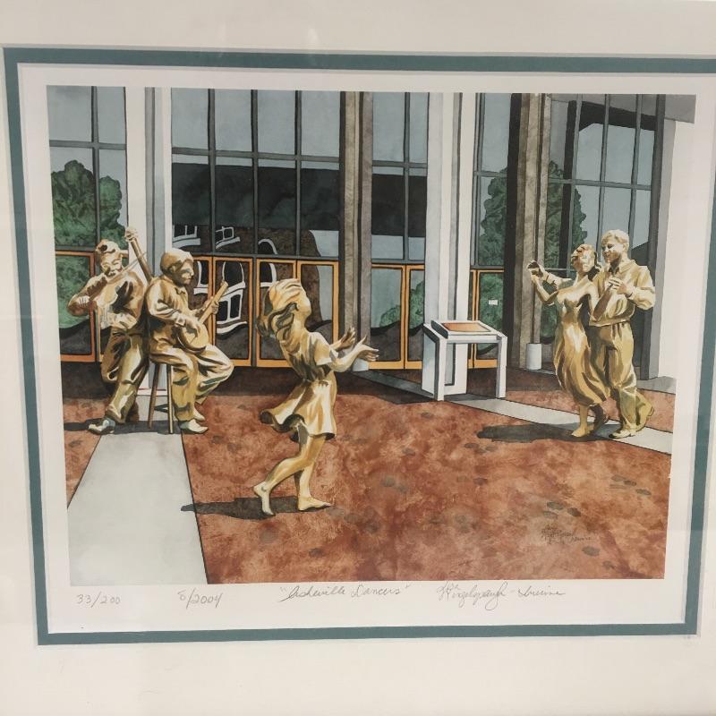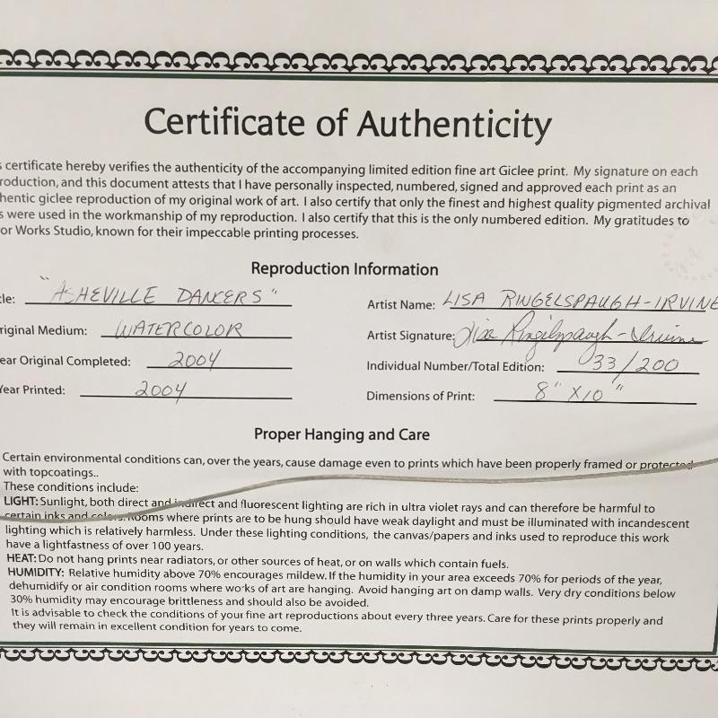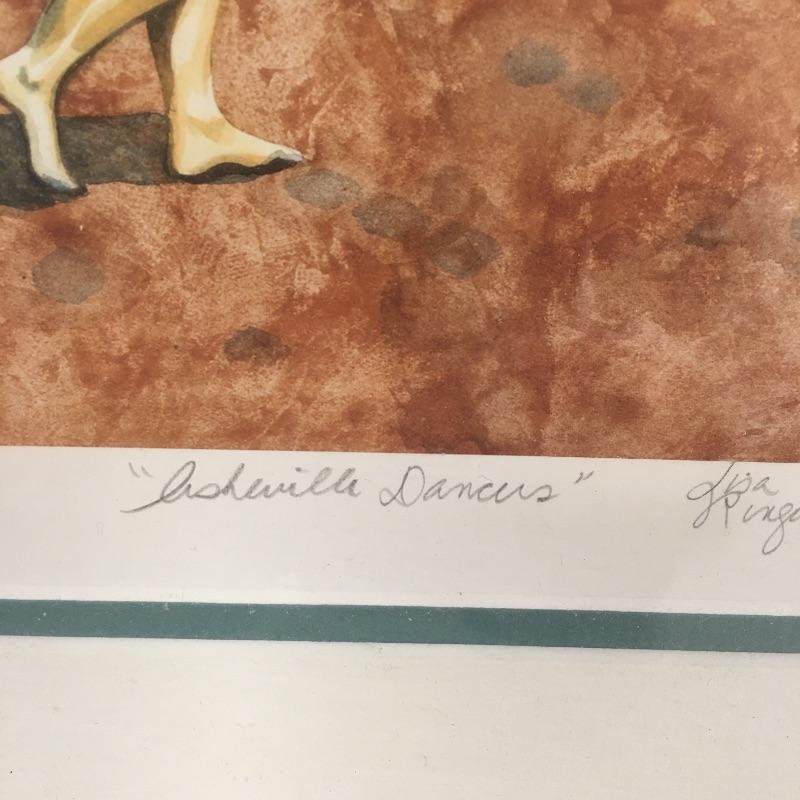This Giclee print is titled “ Asheville Dancers” and is framed, matted, numbered and pencil signed by Lisa Ringelspaugh-Irvine. Frame measures 15” x 16.75”. Frame is peeling on front, see pictures.