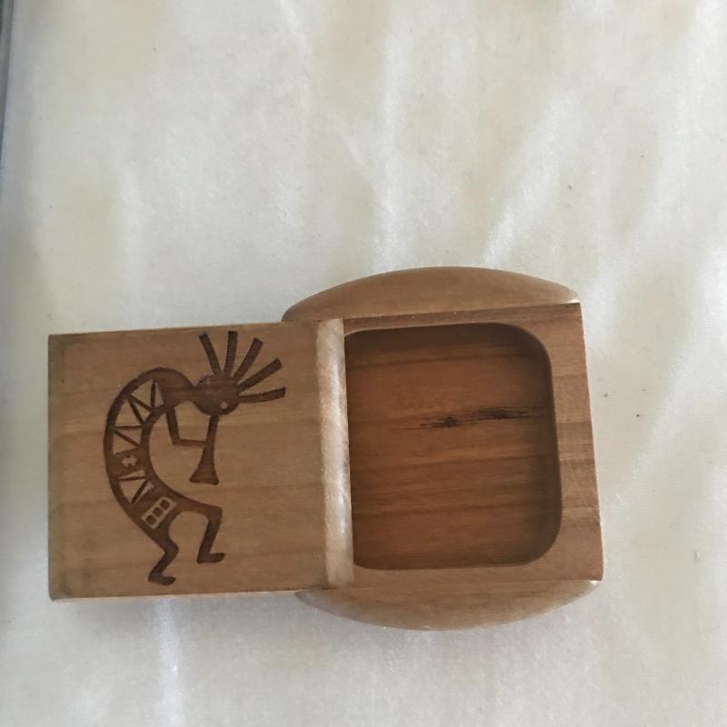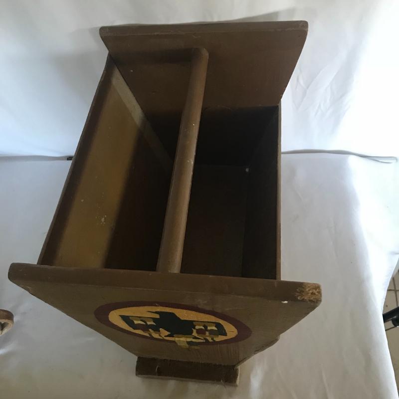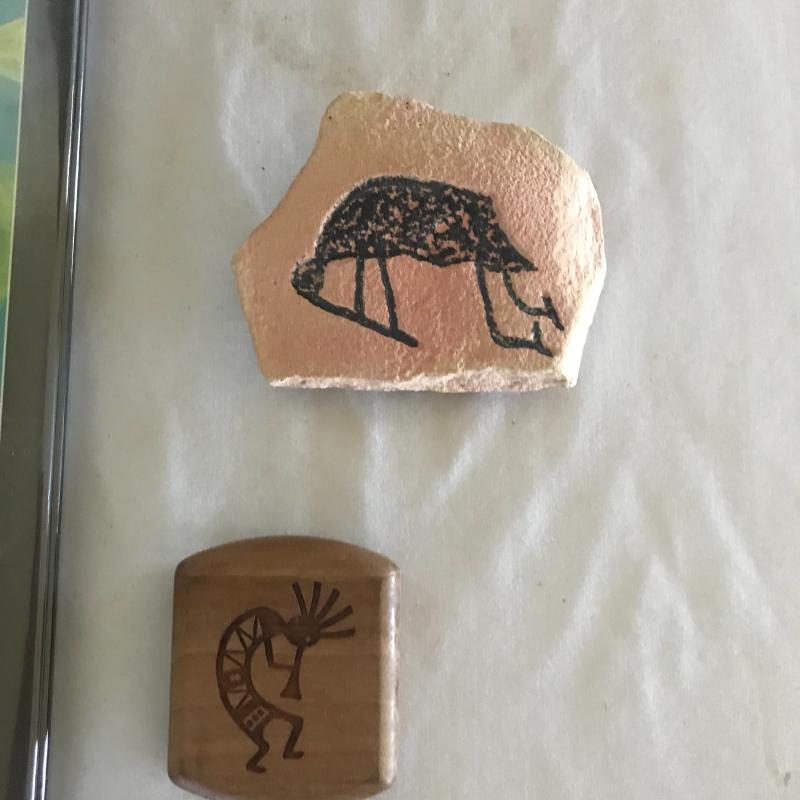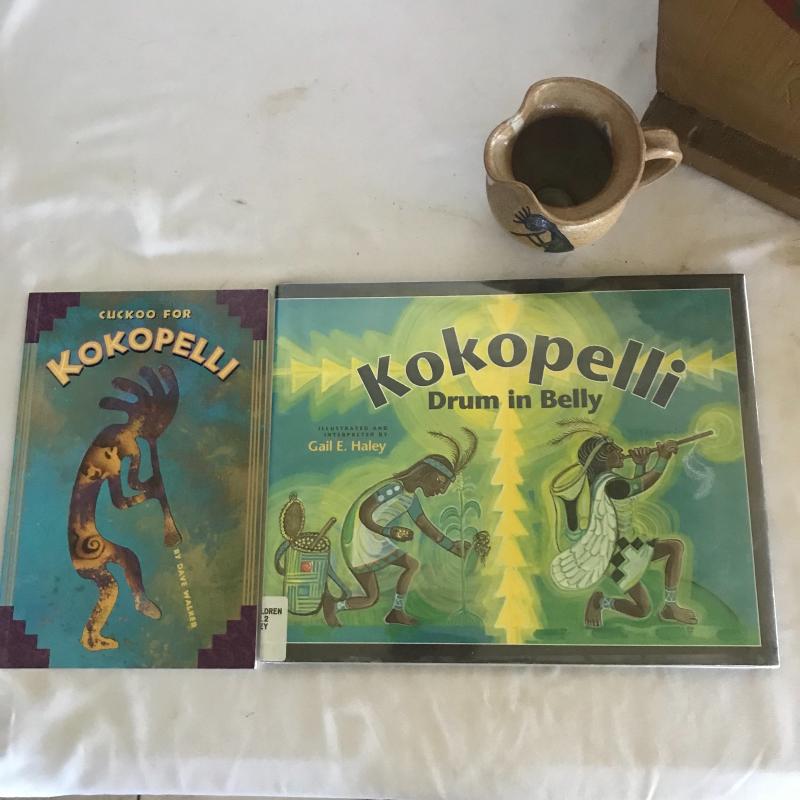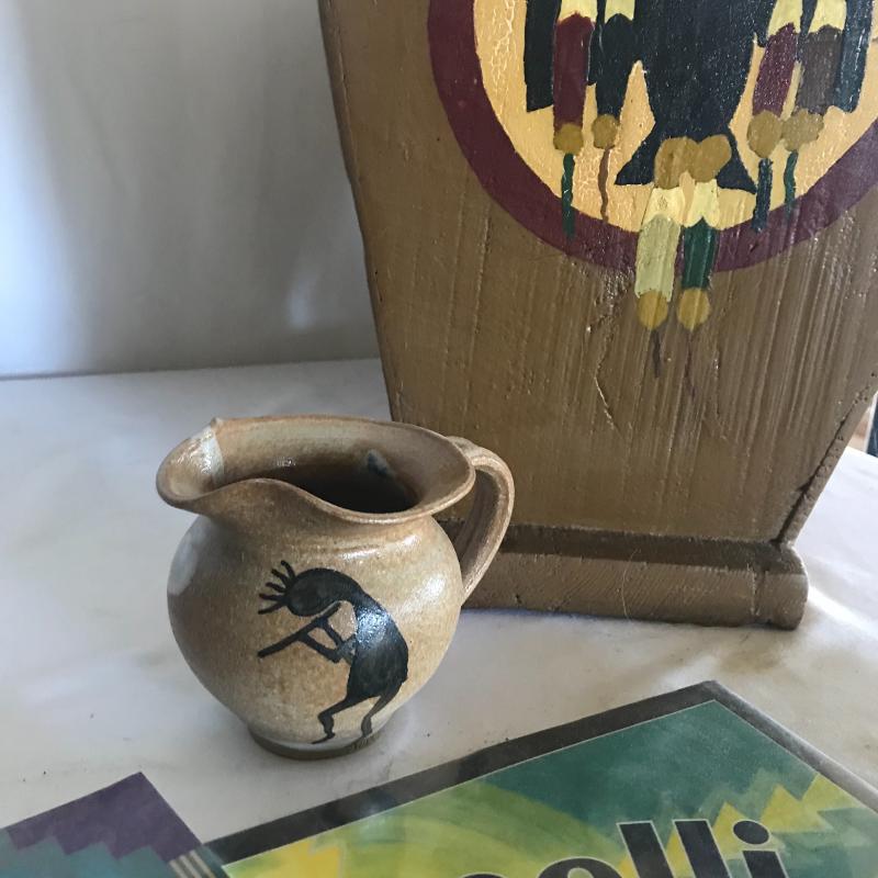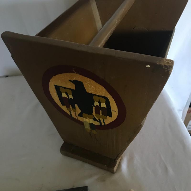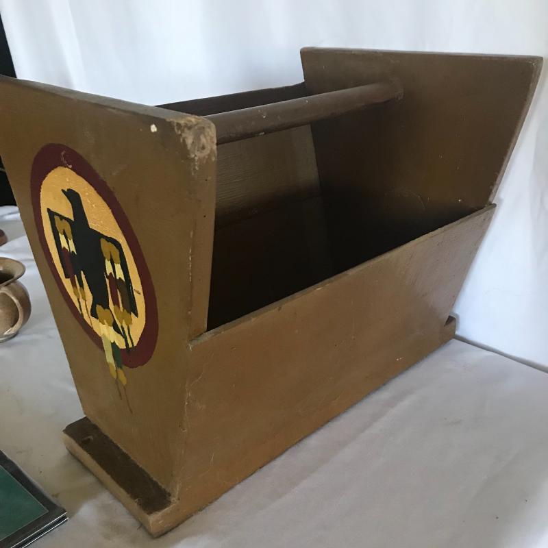 Two books, small pitcher and stone magnet with Kokopelli flute player. Also included in lot are stone magnet and magazine bin with Aztec hawk painted in one end. Piece measures 13.5” x 11”x 12.5”. Corner has a little nibble out of it but could be sanded smooth. Local pick up only.