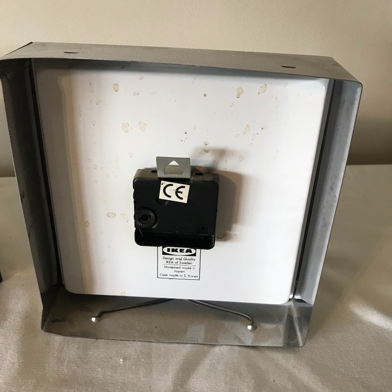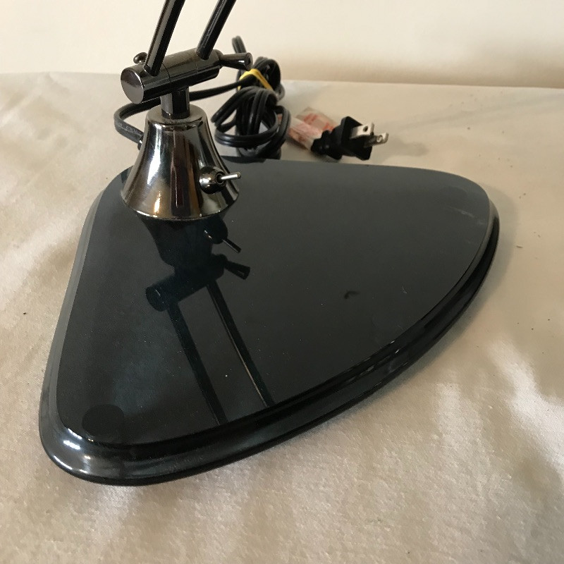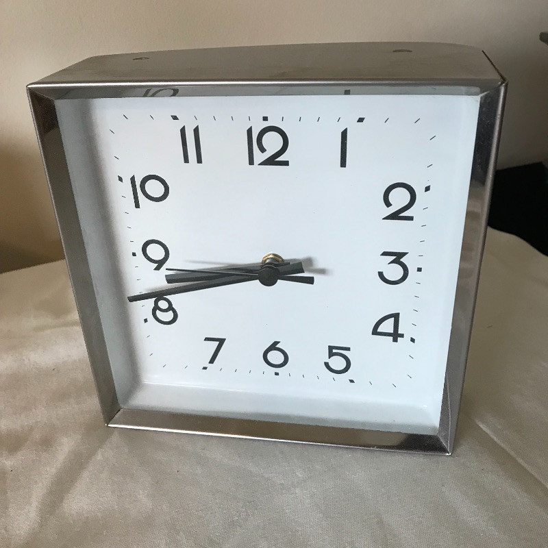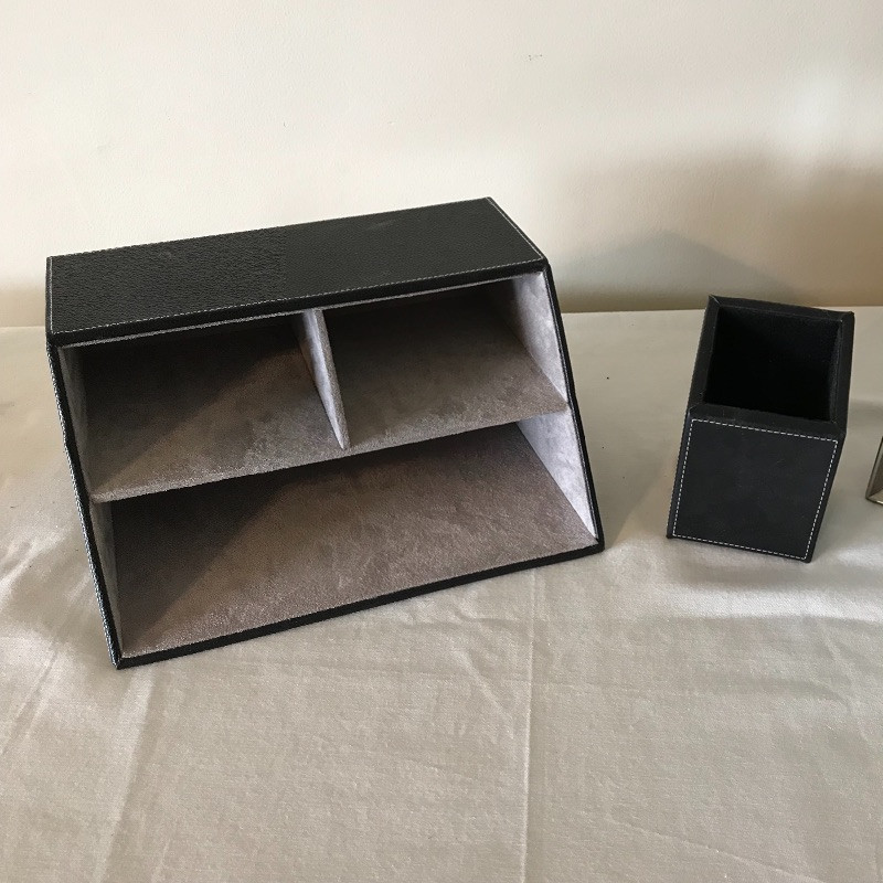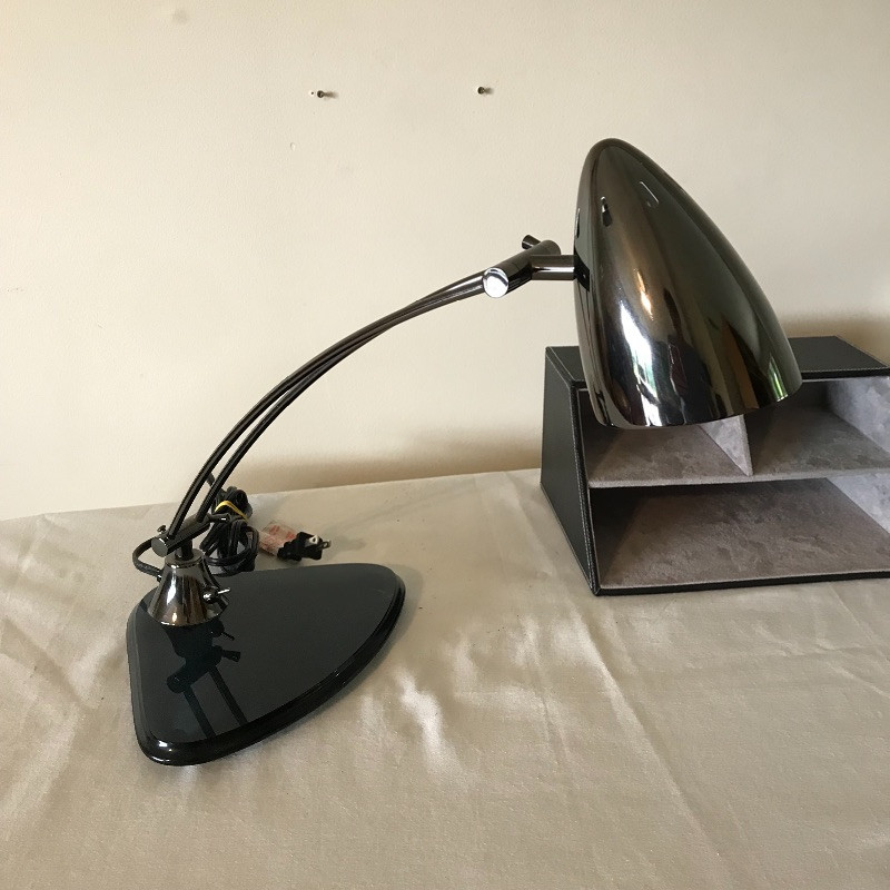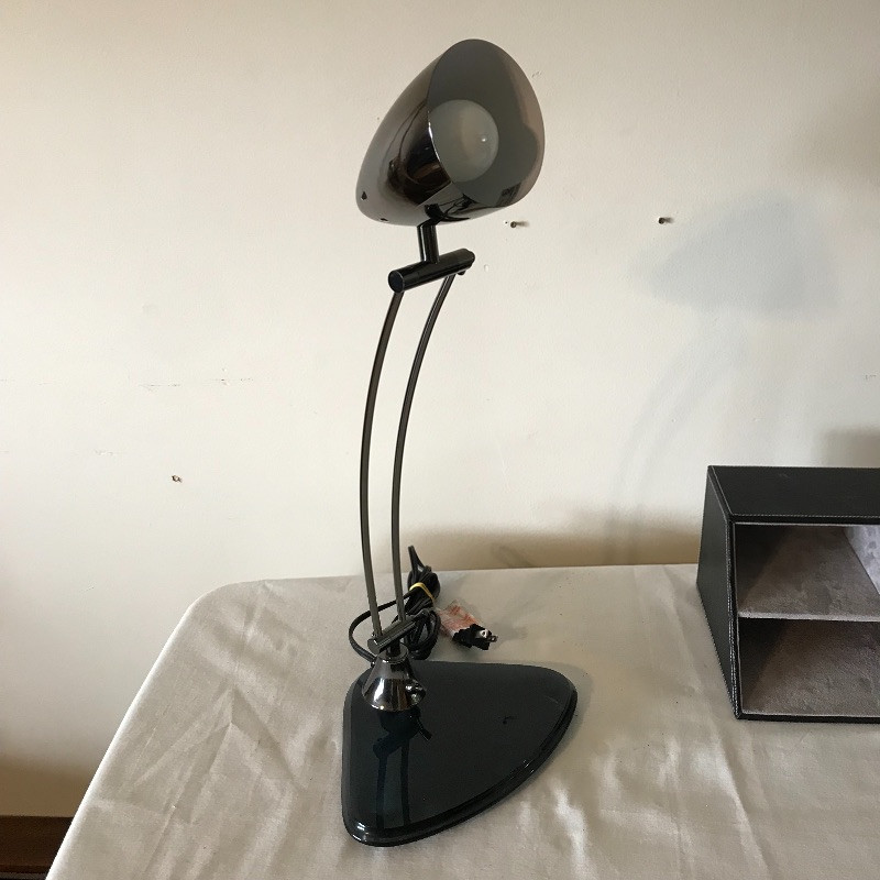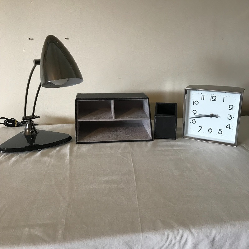 The desk lamp has two adjusting points and on/off switch at the base which is a grey/black acrylic and the piece is functioning. The two leather like storage pieces appear to have never been used. Largest one measures 11” x8” x5.5”. A battery operated wall clock is silver, Black and White and measures 7.5” x7.5” x2.5”. Local pick up only.