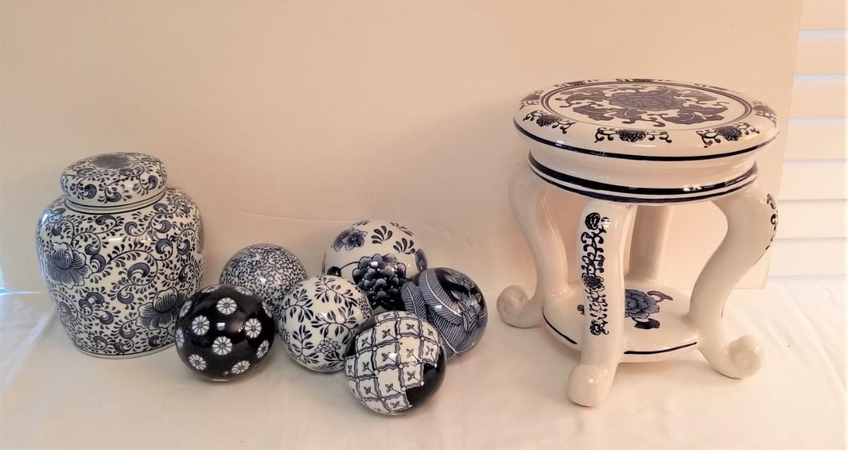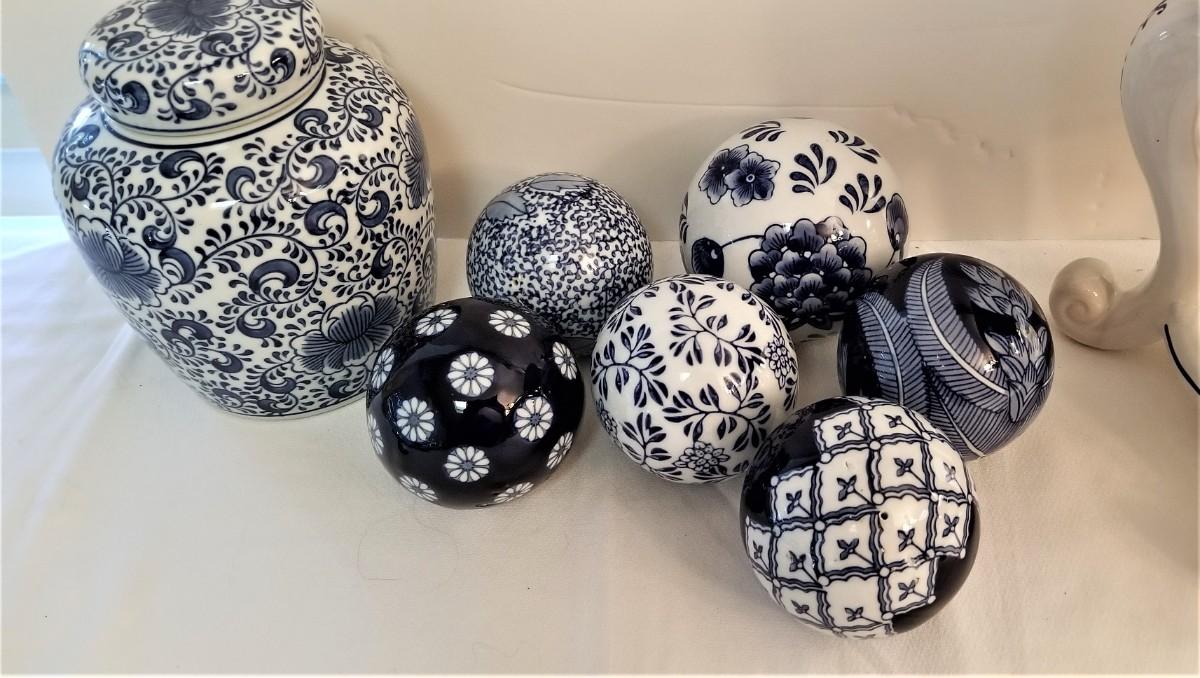 You get all you see here - 6 decorative ceramic balls, Ginger Jar (7" tall) and stand (9" tall). All in good condition.