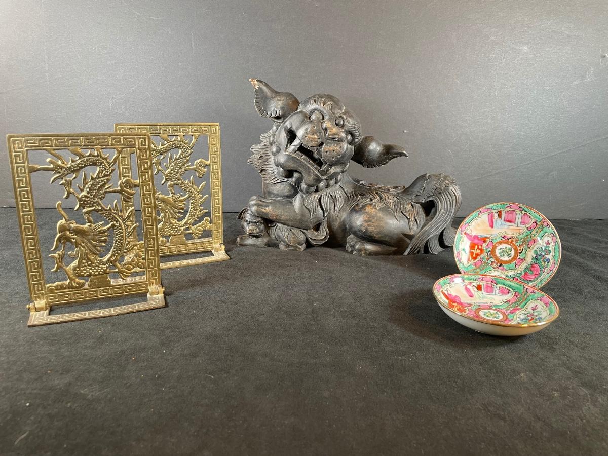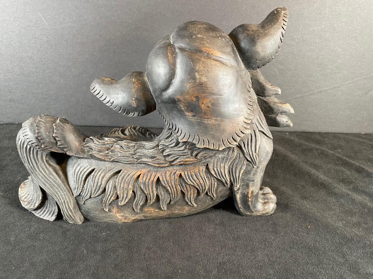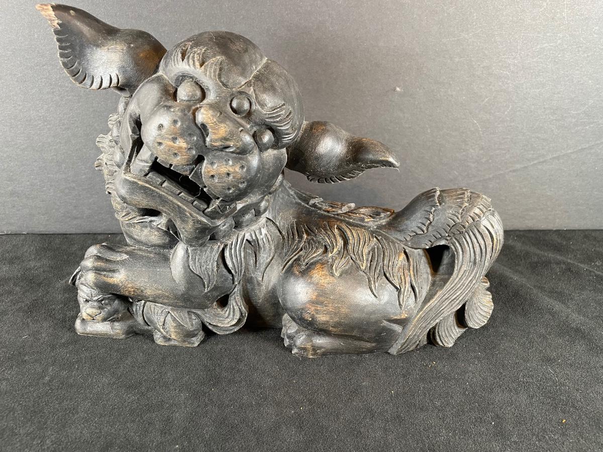 Carved wood Foo Dog, stained dark (probably not very old but really cool) approx 8" hi x 11" long