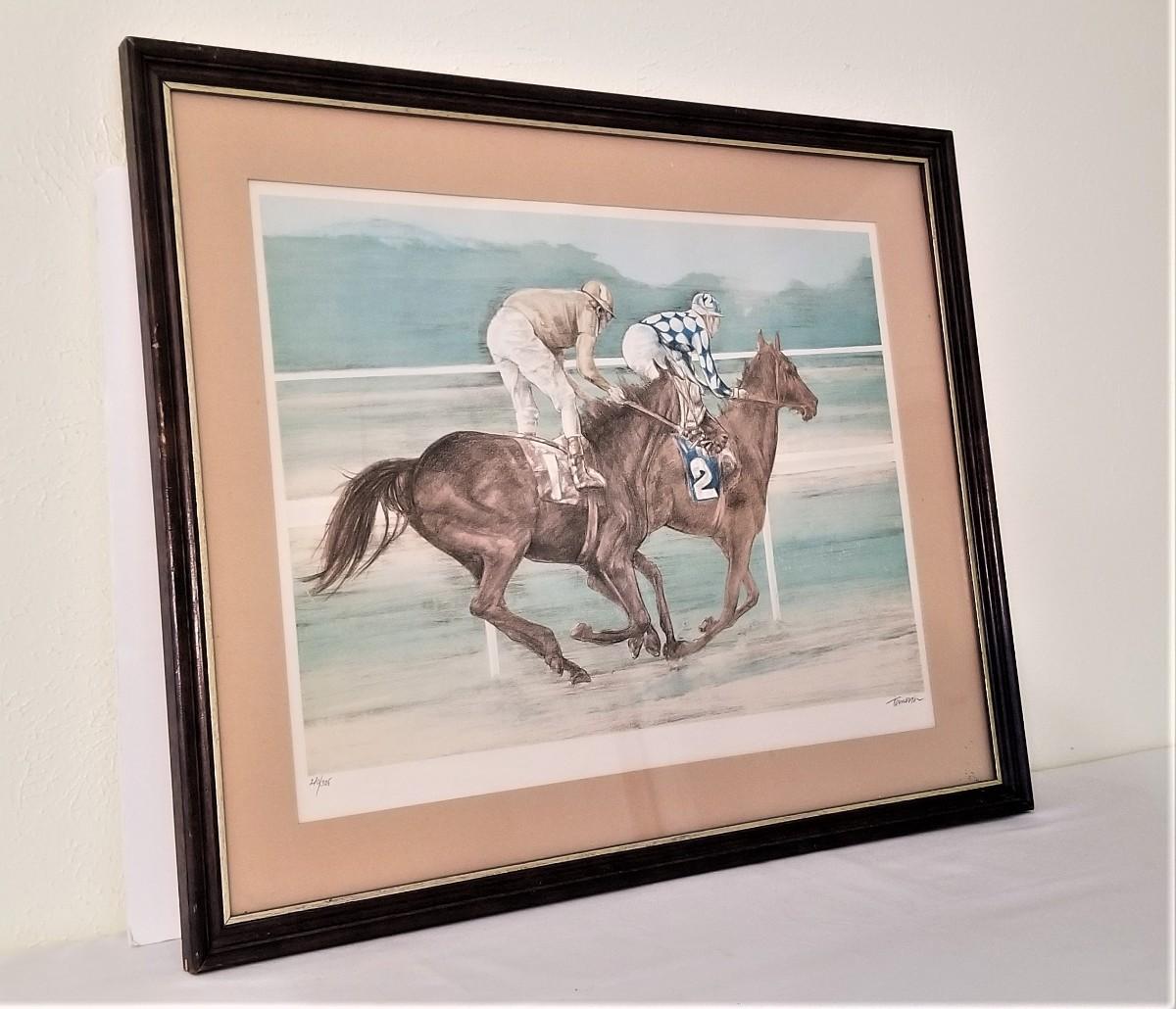 From the Collector's Guild series of lithographs - #210 of an edition of 325 - pencil signed what looks like "Temenir" - features gallery stamp - Horse Racing Scene - 28" across, 23" tall. A bit of dust has gotten in between the glass and the mat in one corner. Back easily removed to remedy. Provenance on back of piece.
