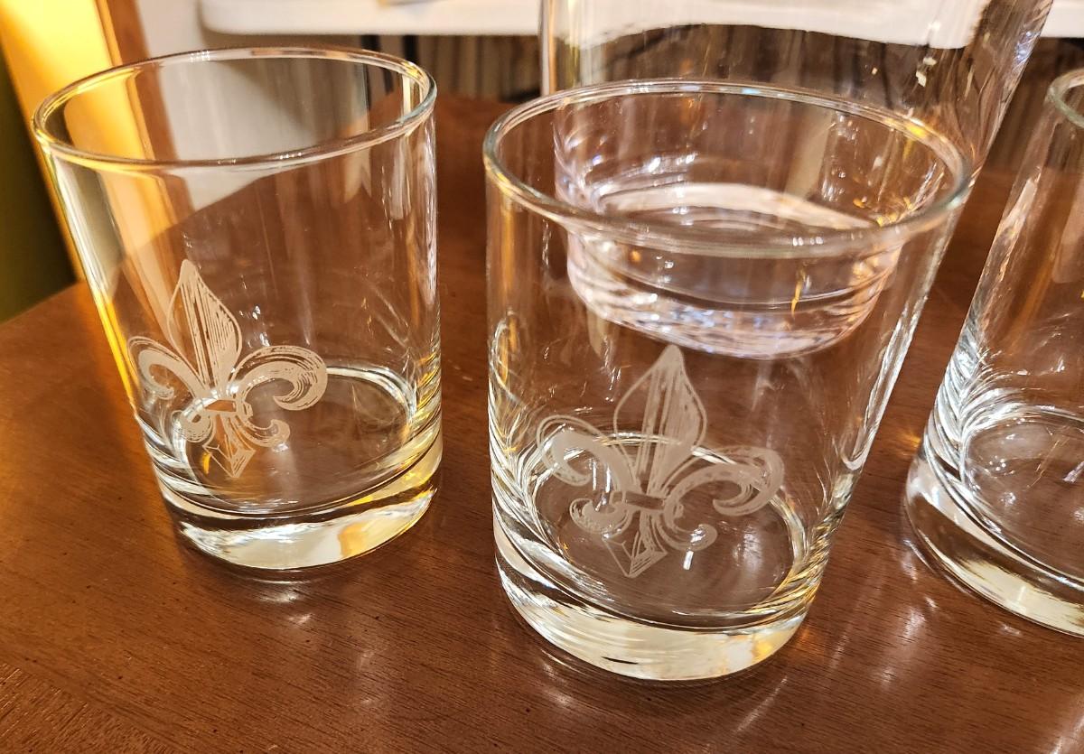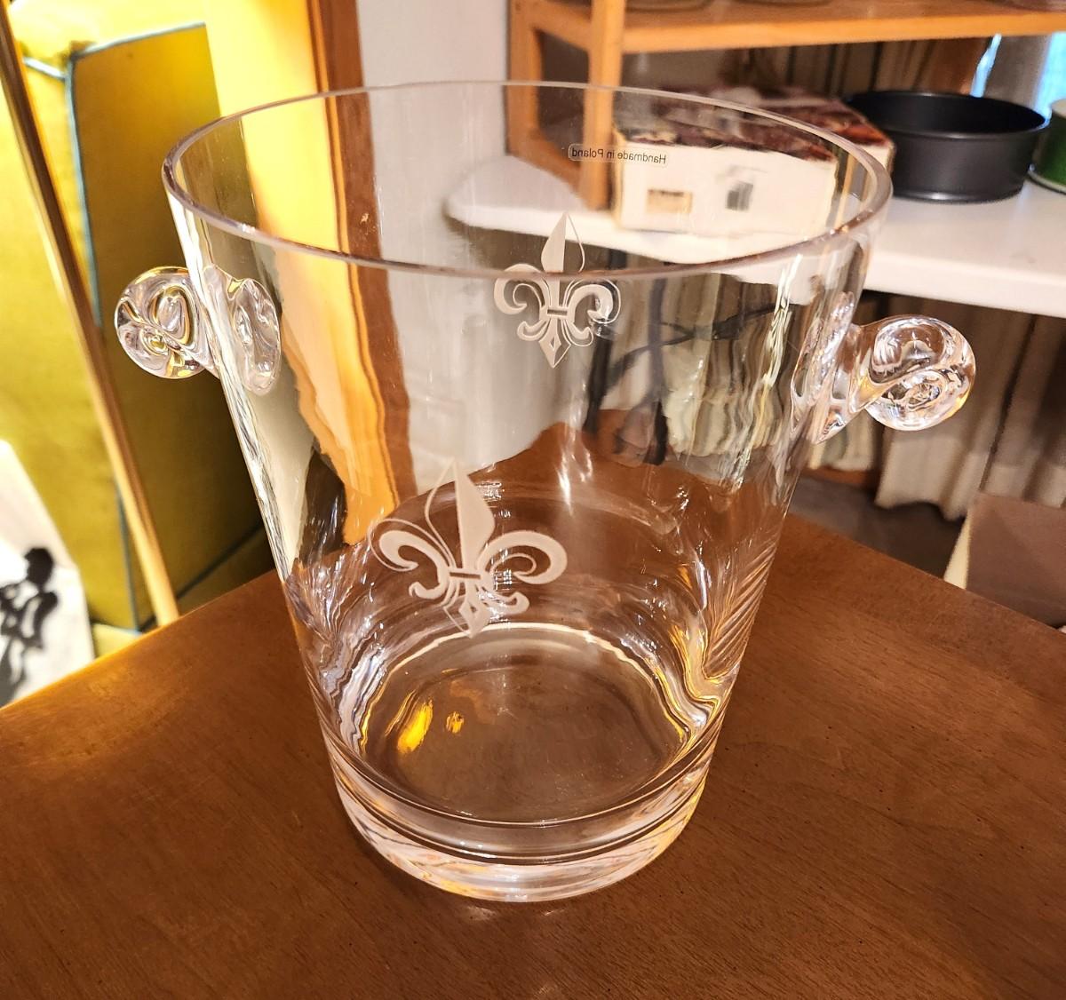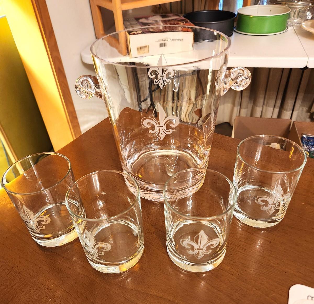 Lovely Crystal ice Bucket with 4 rocks glasses, all featuring an etched Fleur di Lis - unsigned. Bucket is 9" tall, glasses each 4" tall. Nice condition.