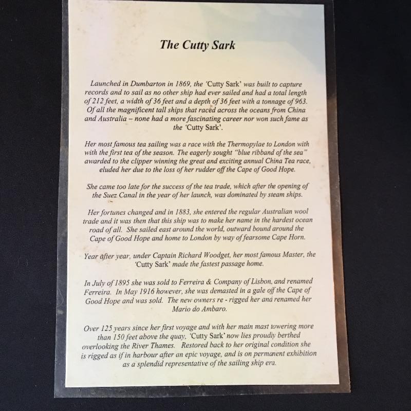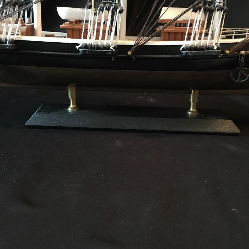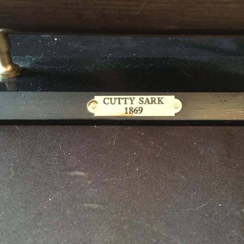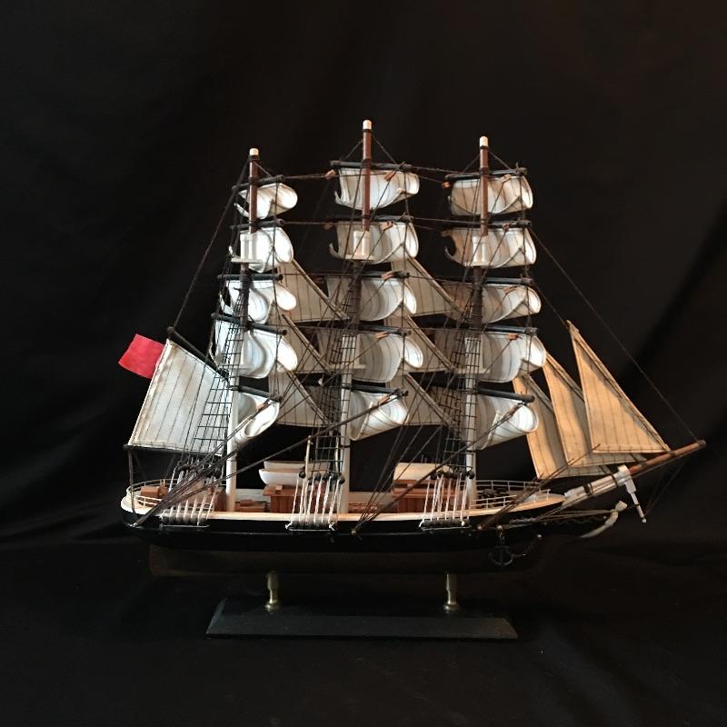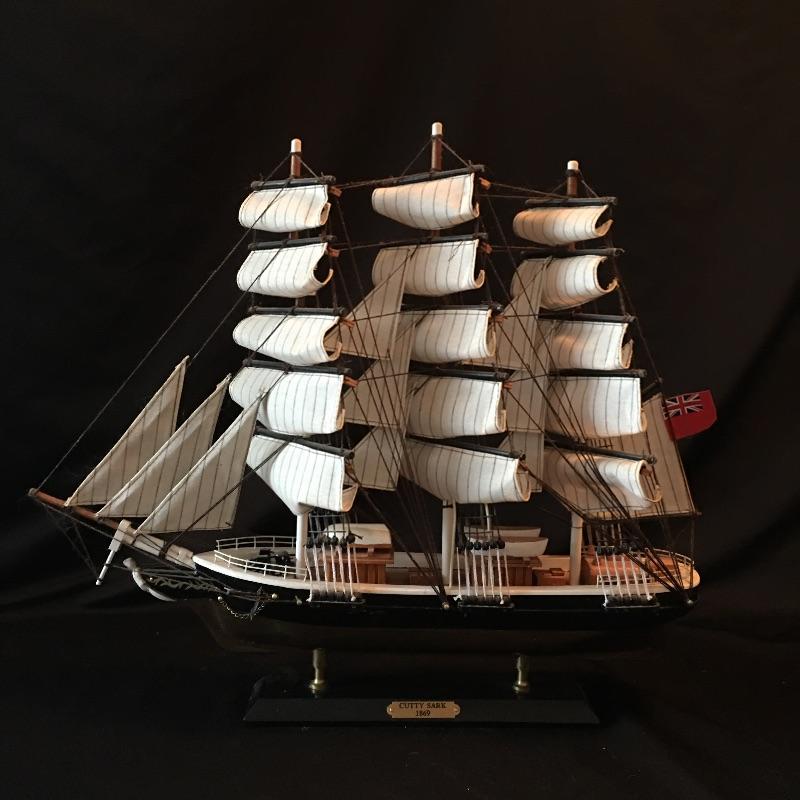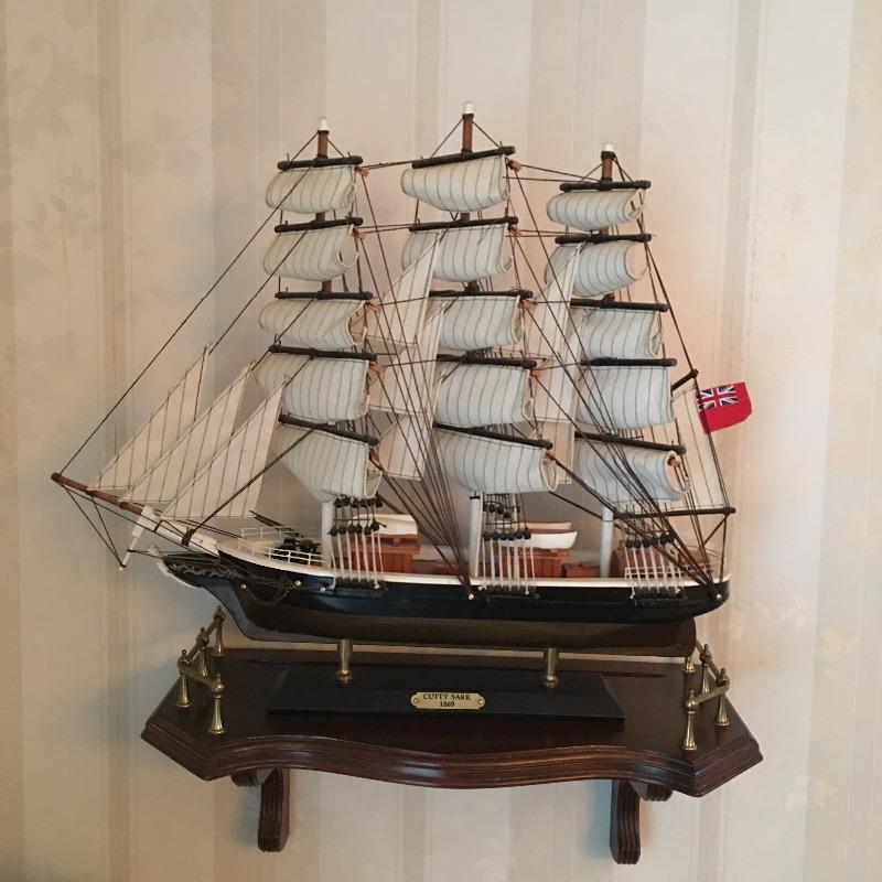 Cutty Sark wooden model ship and perfectly sized display shelf. Relive the glory days of the great ship Cutty Sark with this nice model. Ship measures 5.75” x 21” x17.75”. Comes with a nice description of the Ship. Shipping available. Please call UPS 828-252-6930 for quote prior to bidding.
