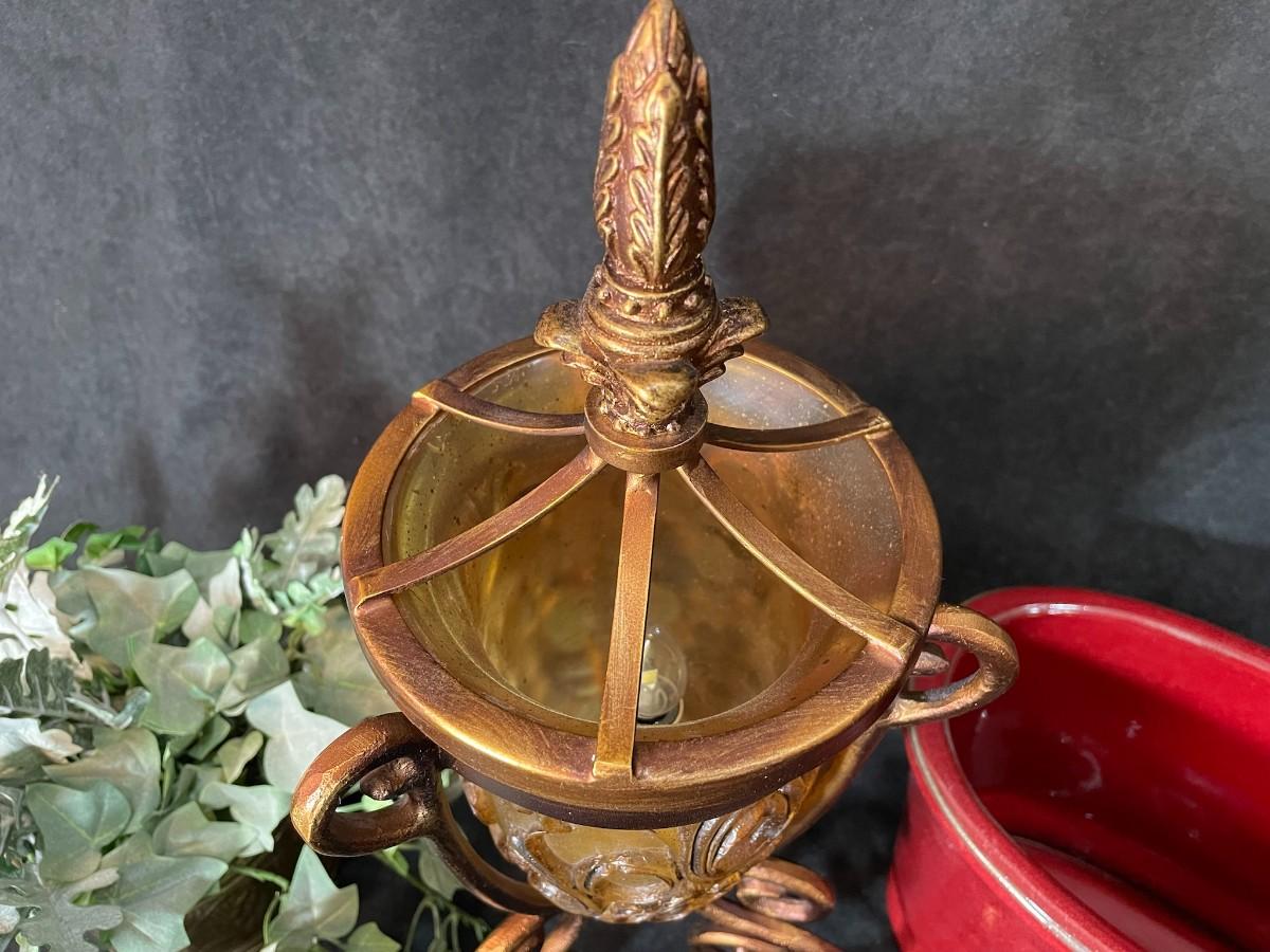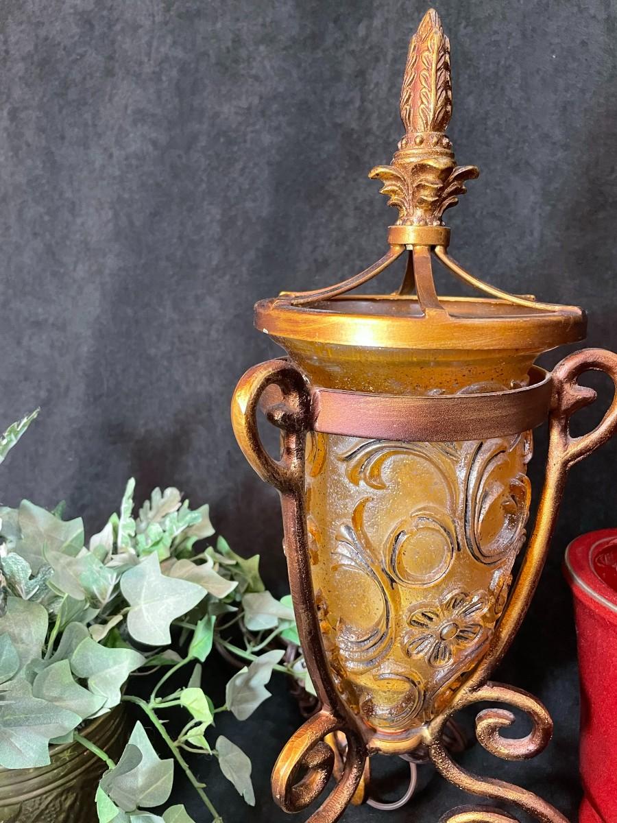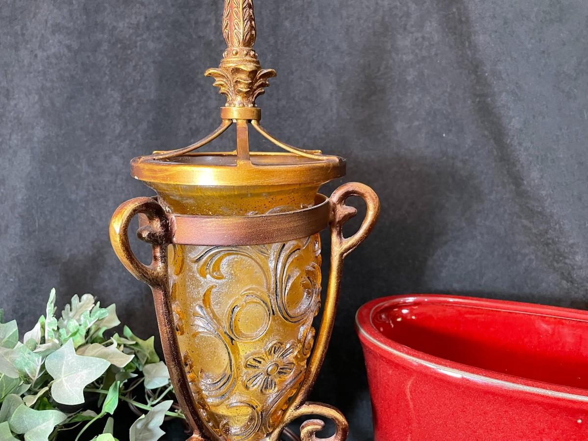 Includes silk plant in brass planter, gold lamp, and red planter.