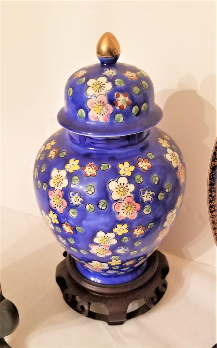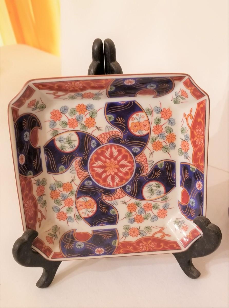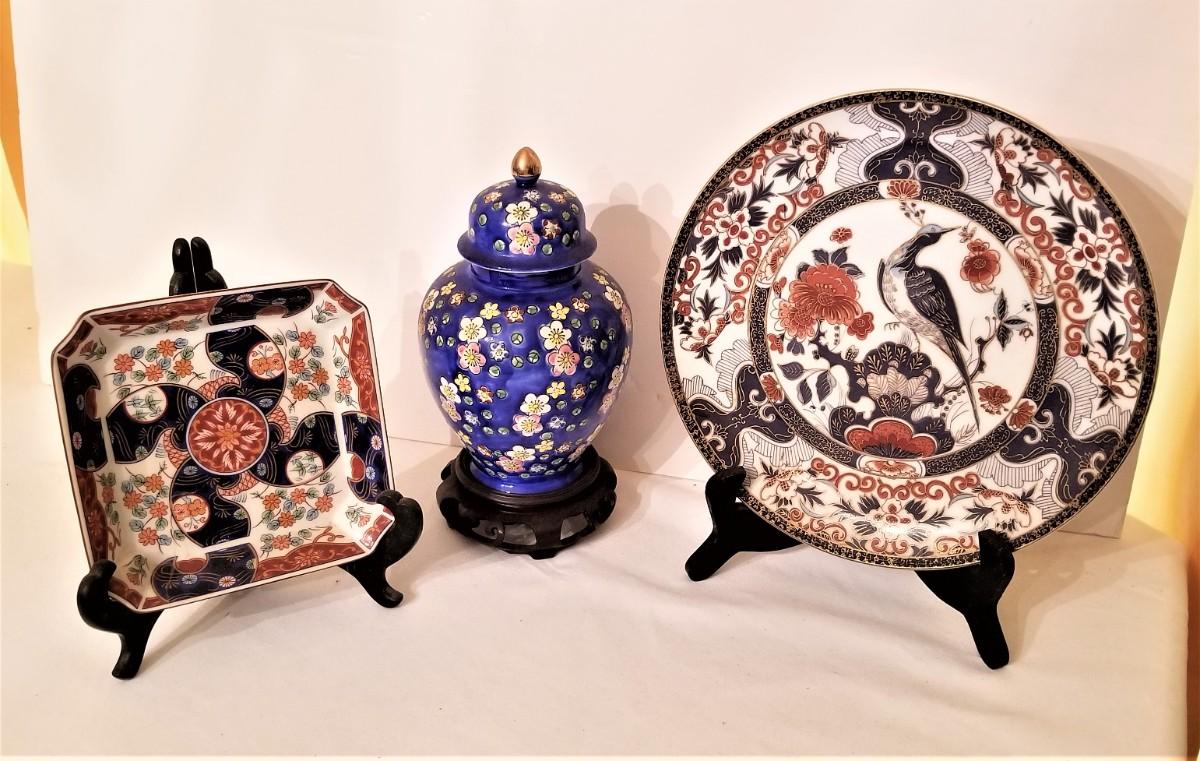 You get all you see here - all made Japan - pretty decorative plate (10" across, Ginger jar on stand (9" tall), square dish with Asian styling (6" across). Comes with stand and easels. All in good vintage condition - probably early 70's.