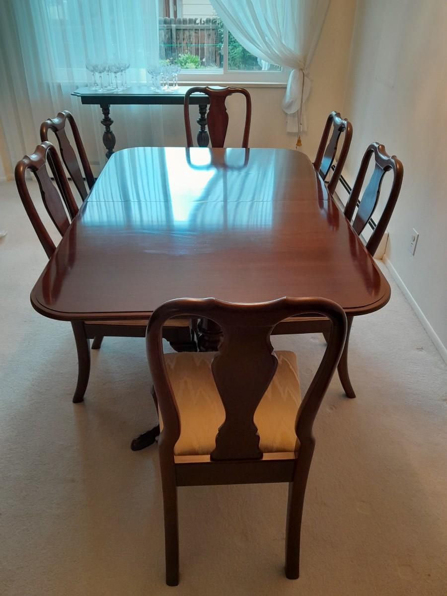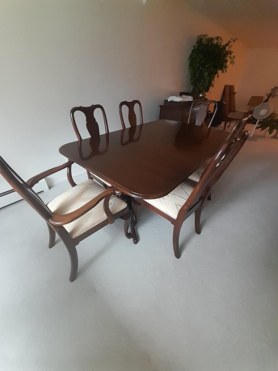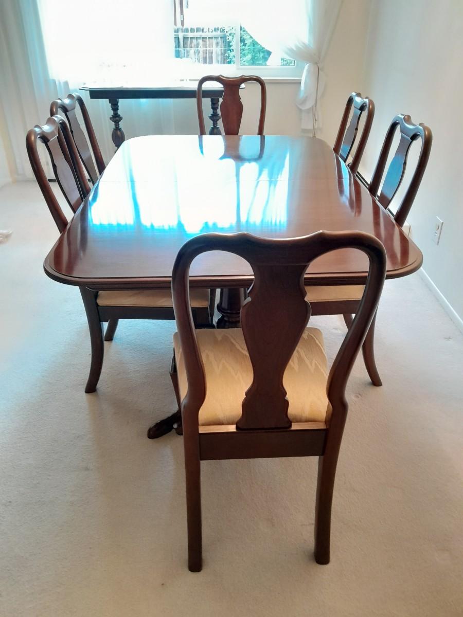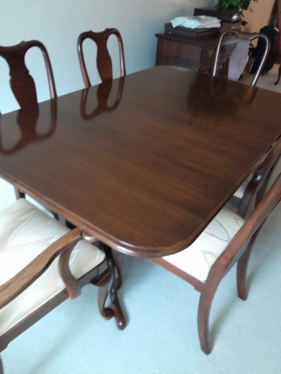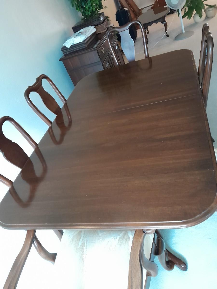 ETHAN ALLEN TABLE 29" X 66" X 42" TWO LEAVES 42" X 18" EACH. 6 CHAIRS, AND TOP PROTECTORS.
